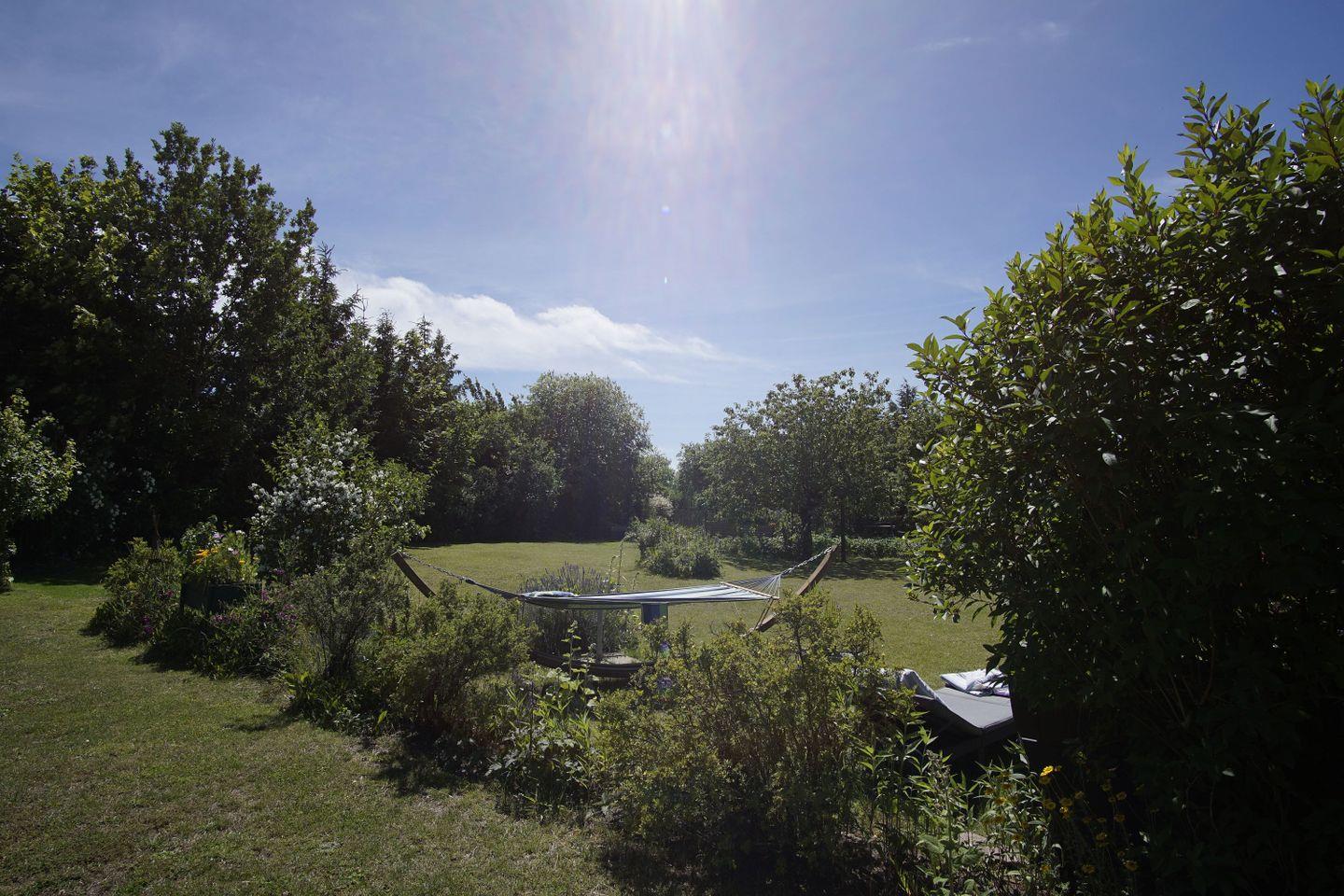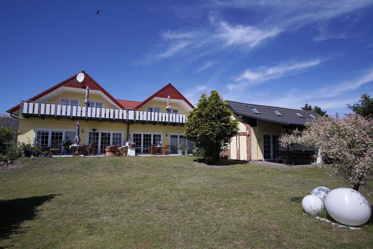Idyllisches Ferienhaus Bernstein auf Rügen mit großem Garten und überdachtem Balkon für erholsame Urlaubstage.