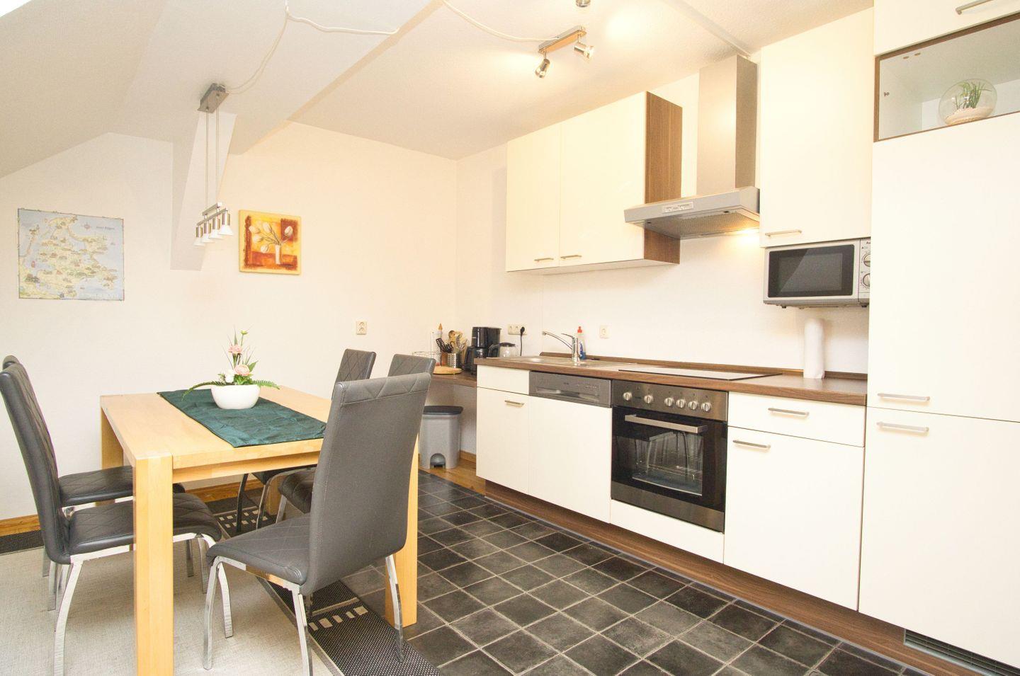 KÜCHE // offene Küche mit Cerankochfeld (4-Platten), Kühlschrank, Backofen, Mikrowelle, Toaster, Wasserkocher, Kaffeemaschine, Spülmaschine, reichlich Besteck, Geschirr und Küchenutensilien ++