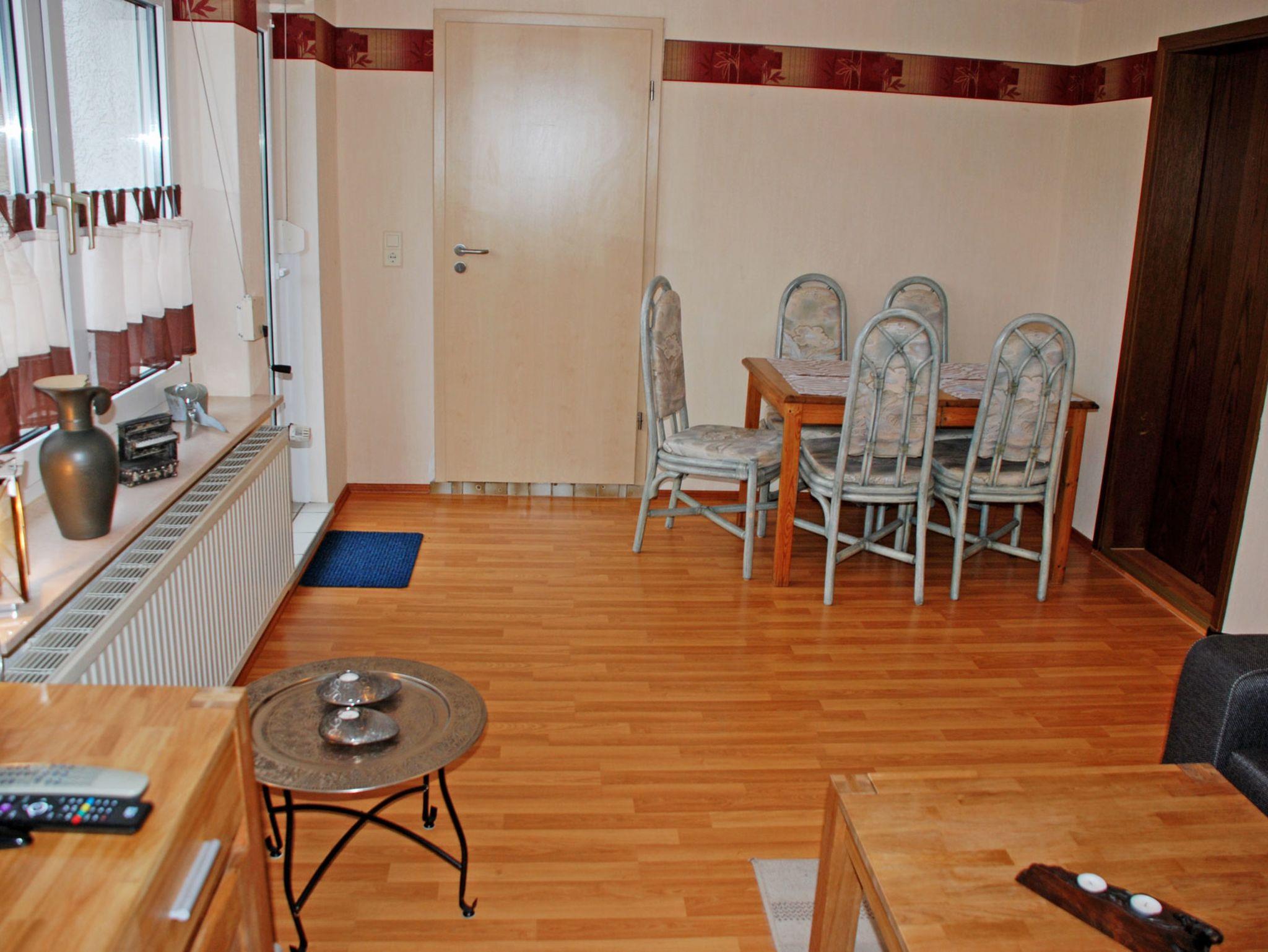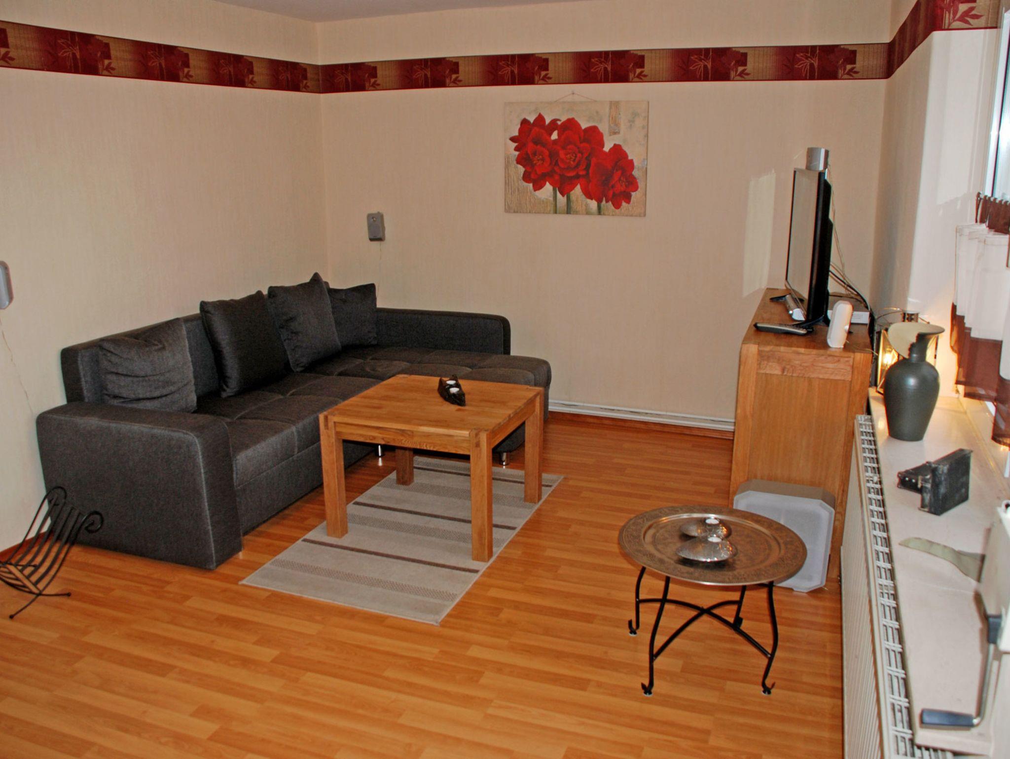 Die Ferienwohnung im Erdgeschoss verfügt über einen separaten Eingang. Sie ist ca. 70 qm groß, hat Platz für maximal 5 Gäste, wurde modern und liebevoll eingerichtet und bietet ein WLAN-Internetzugang. Im Wohnraum befinden sich eine bequeme Couch mit Tisch und ein modernes Flachbild-TV-Gerät mit Surroundanlge und DVD-Player. Hier steht auch ein Esstisch mit Stühlen. Die Couch kann bei Bedarf für zwei Gäste aufgebettet werden.