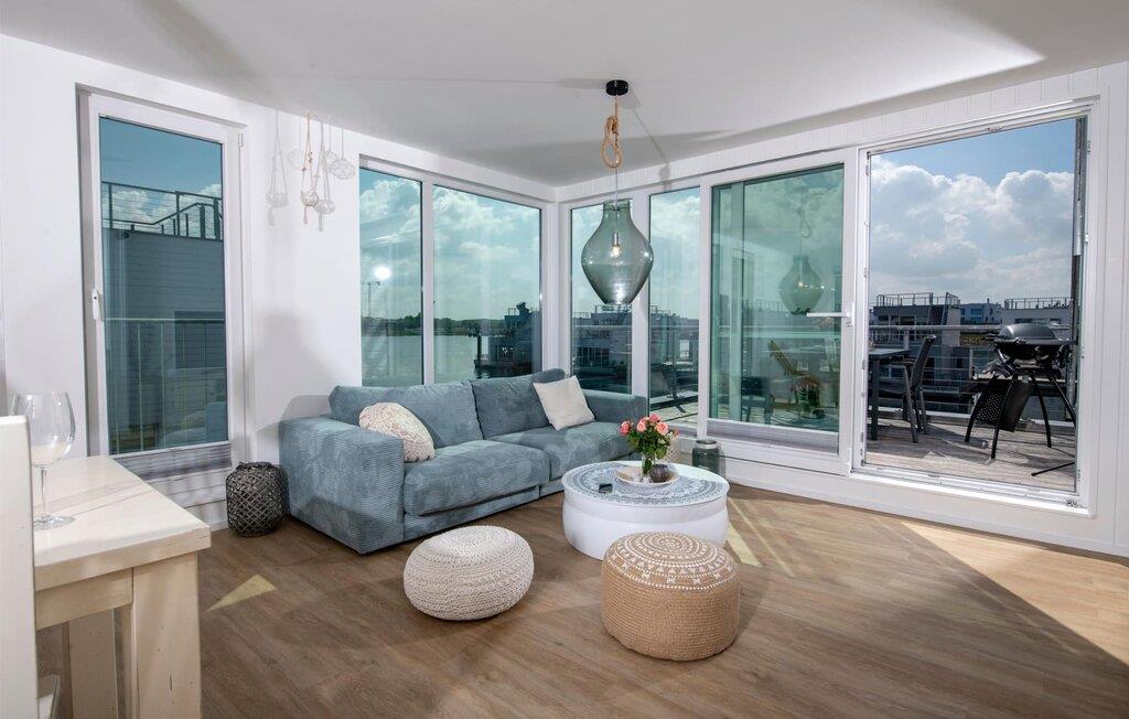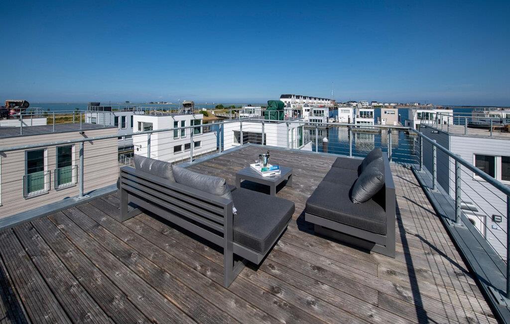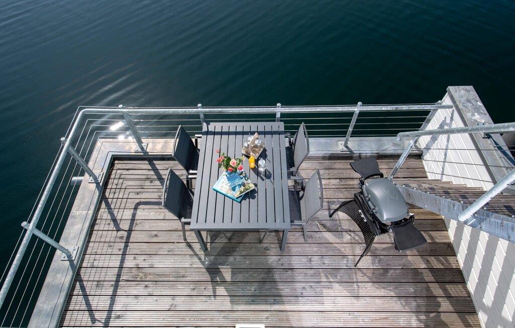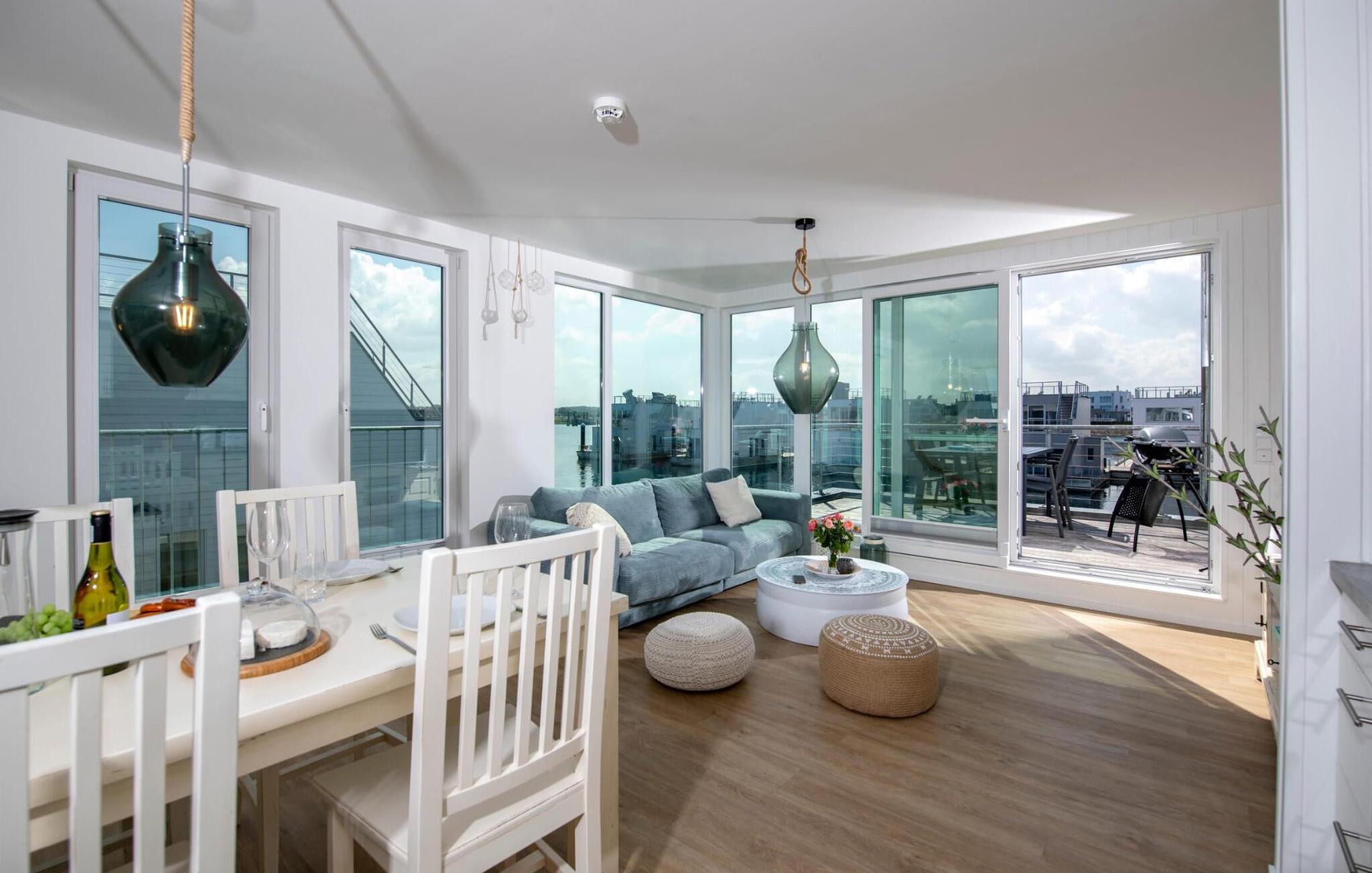 Das schwimmende Haus erstreckt sich über drei Ebenen. Im Obergeschoss befindet sich der offen gestaltete Wohn- und Essbereich mit Rundum-Wasserblick, voll ausgestatteter Wohnküche und angrenzender Terrasse. Von hier aus gelangt man auf die spektakuläre Dachterrasse mit Blick über den Segel- und Sportboothafen, die Schlei und deren Mündung in die Ostsee. Ausgestattet mit hochwertigen Gartenmöbeln und Weber Elektrogrill bieten die Terrassen pures Urlaubsfeeling und atemberaubende Sonnenuntergänge.