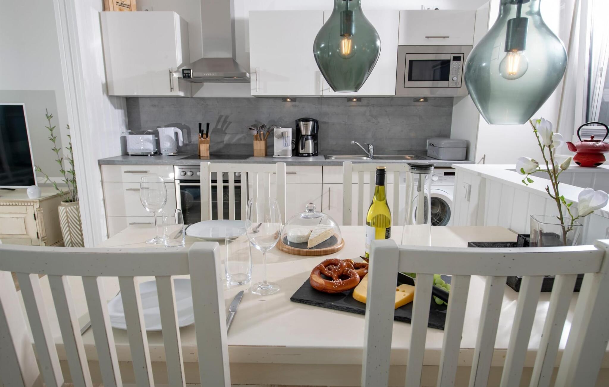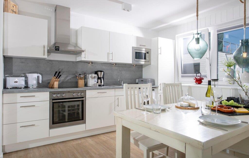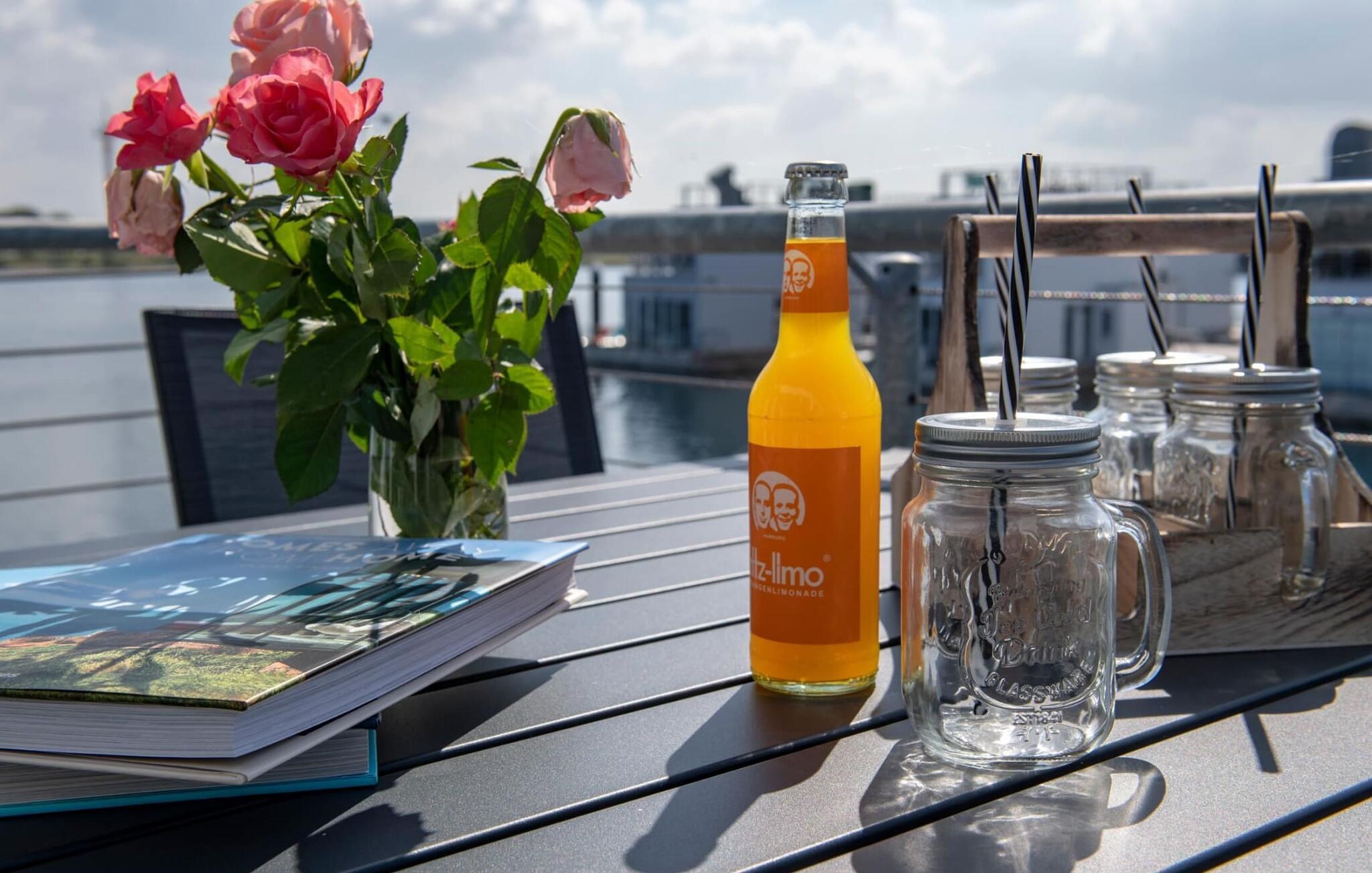 Das schwimmende Haus erstreckt sich über drei Ebenen. Im Obergeschoss befindet sich der offen gestaltete Wohn- und Essbereich mit Rundum-Wasserblick, voll ausgestatteter Wohnküche und angrenzender Terrasse. Von hier aus gelangt man auf die spektakuläre Dachterrasse mit Blick über den Segel- und Sportboothafen, die Schlei und deren Mündung in die Ostsee. Ausgestattet mit hochwertigen Gartenmöbeln und Weber Elektrogrill bieten die Terrassen pures Urlaubsfeeling und atemberaubende Sonnenuntergänge.