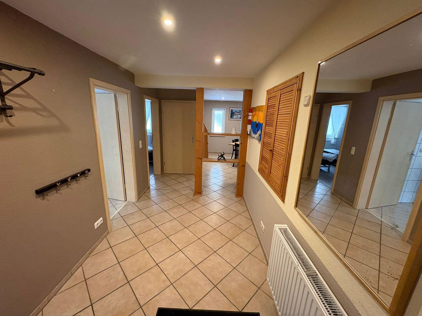 Das Badezimmer ist mit einer offenen Dusche, Waschbecken, großem Spiegel und selbstverständlich mit Fenster ausgestattet. Zusätzlich steht ein separates Gäste-WC zur Verfügung, um den Alltag mehrerer Gäste zu erleichtern. In allen Räumen sorgt die Zentralheizung für angenehme Temperaturen und Rauchmelder garantieren Sicherheit für alle Bewohner.