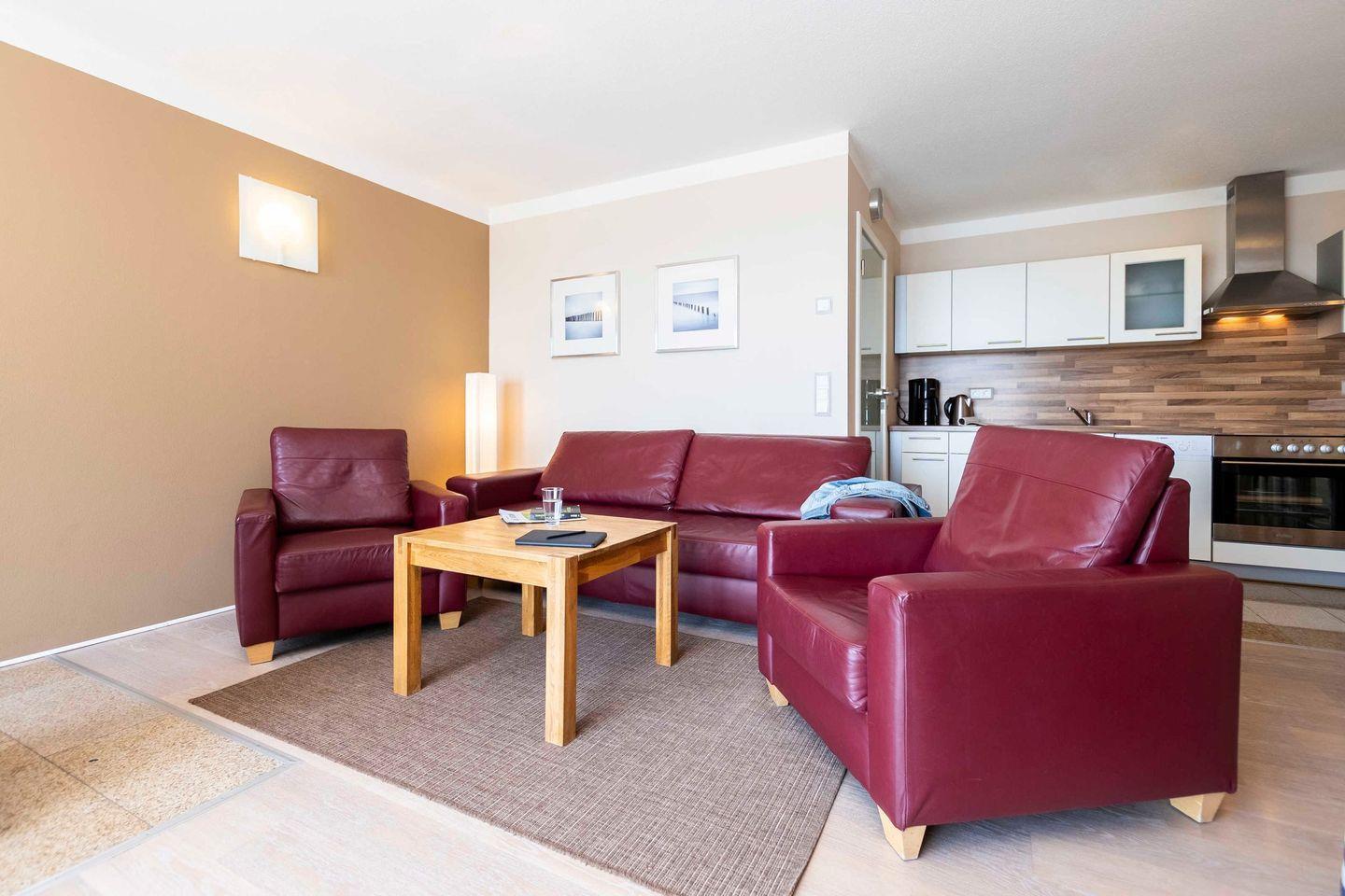 Unsere Gäste haben Zugang zur gesamten Ferienwohnung inklusive Wohnzimmer, zwei Schlafzimmern mit Balkon und Meerblick, dem großzügigen Badezimmer mit Dusche und Badewanne sowie einem separaten WC im Saunabereich.