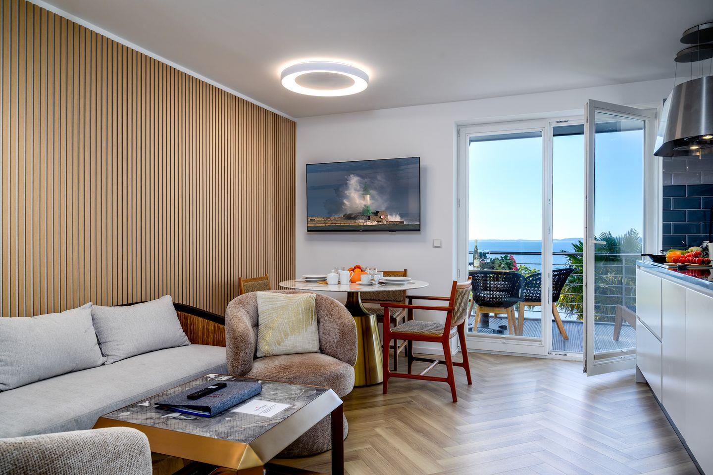 - Wohnbereich: Stilvoll eingerichtet, lichtdurchflutet, Zugang zum Balkon mit Meerblick