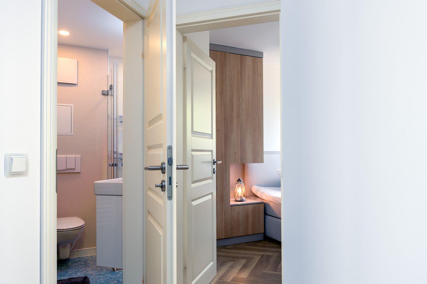 Unsere Gäste haben Zugang zur gesamten Ferienwohnung inklusive Wohnzimmer, zwei Schlafzimmern mit Balkon und Meerblick, dem großzügigen Badezimmer mit Dusche und Badewanne sowie einem separaten WC im Saunabereich.