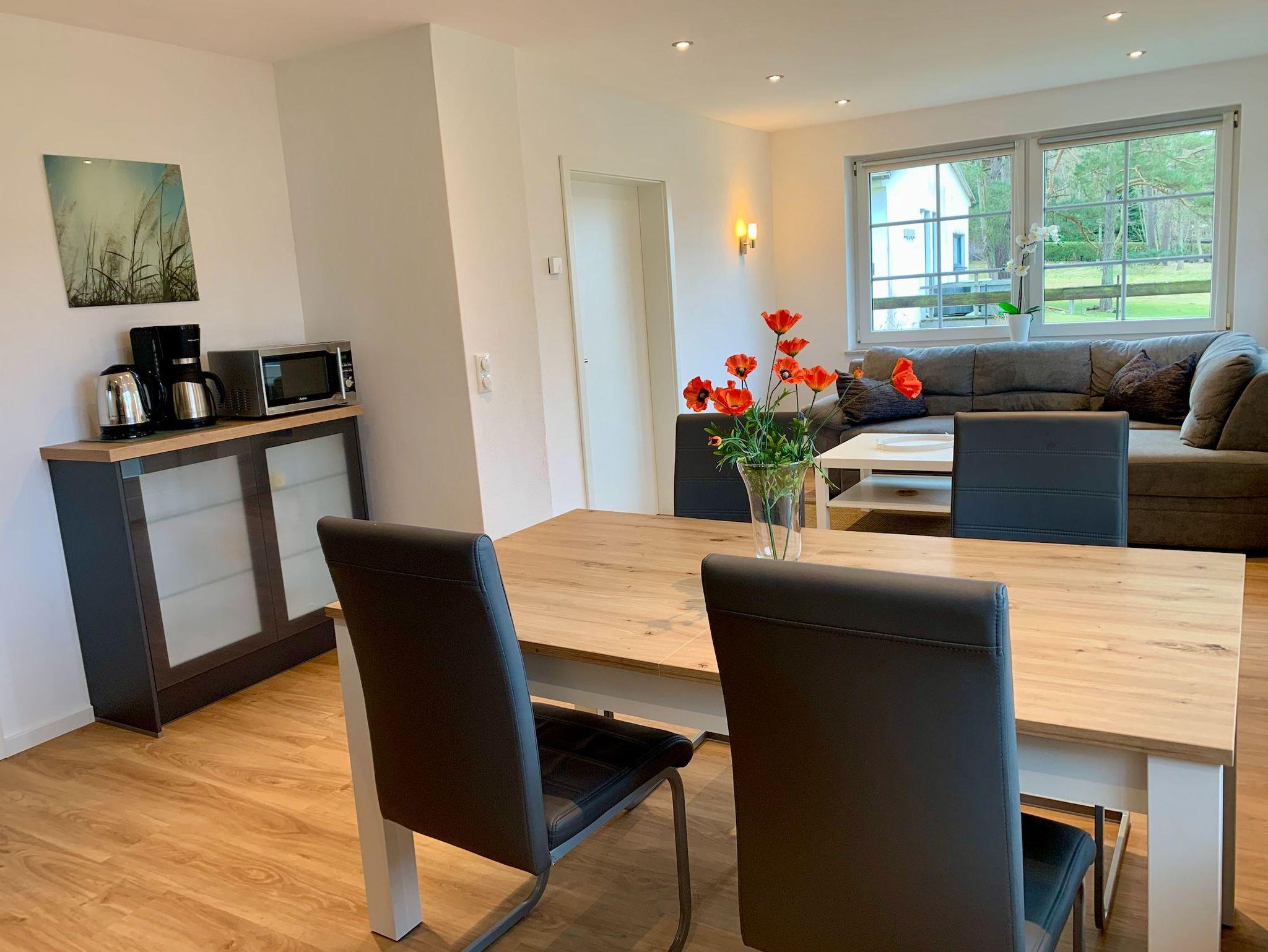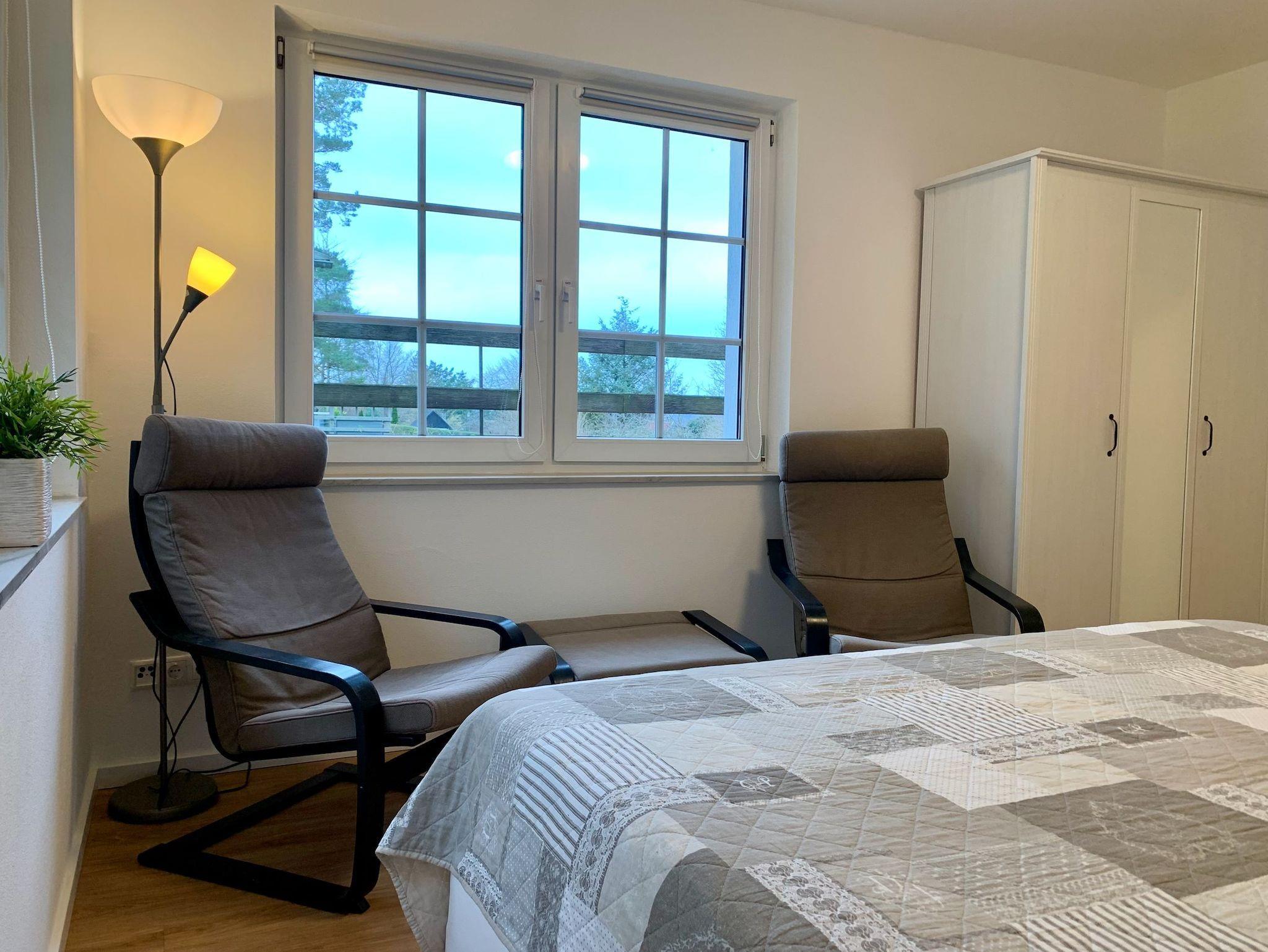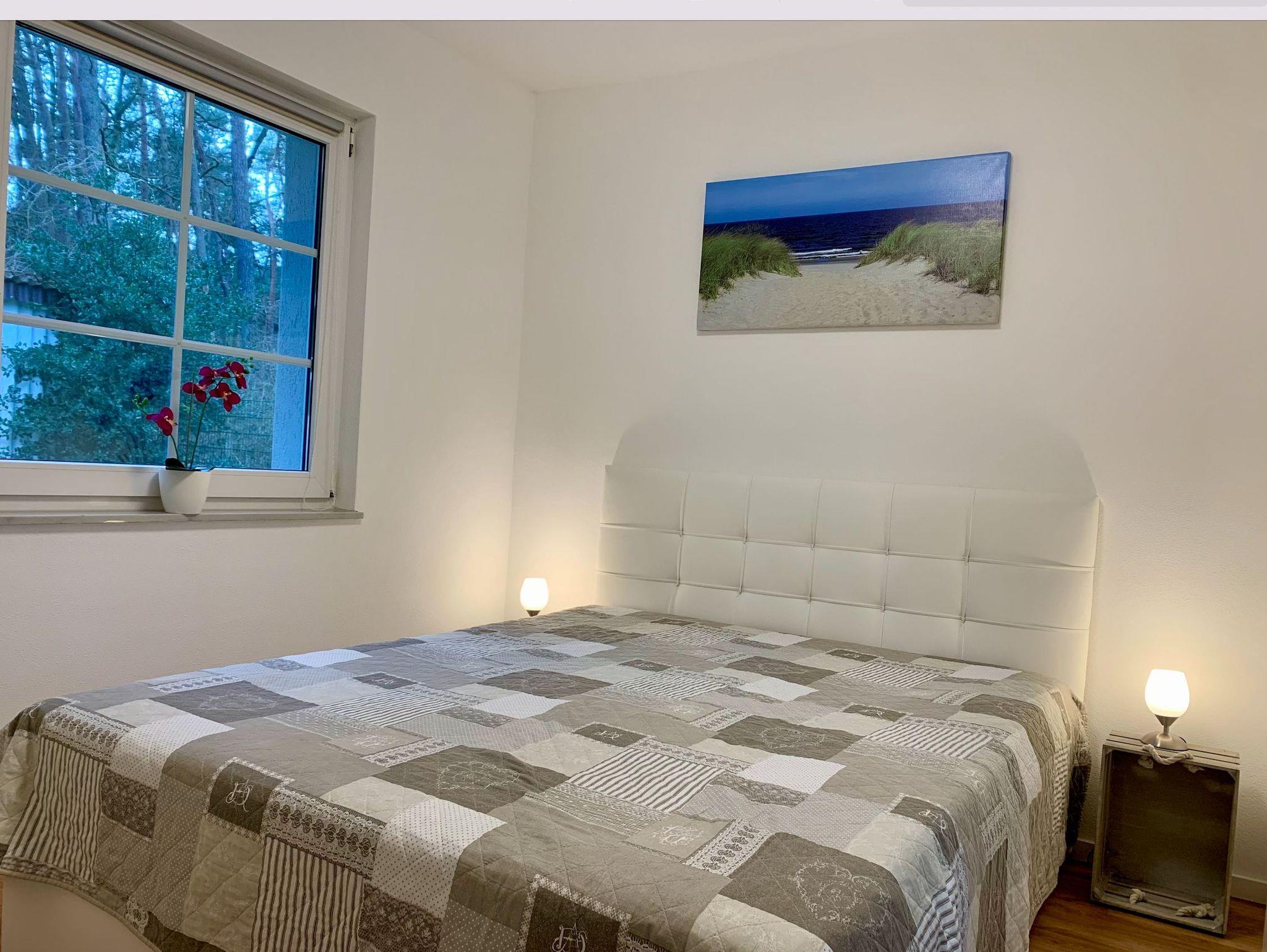 Den Eingangsbereich erreichen Sie über unsere 16 qm große möblierte Terrasse. Das große Schlafzimmer erreichen Sie vom Wohn-Küchenbereich und bietet Platz für 2 Personen mit einem Doppelbett der Größe 180 cm x 200 cm. Die offene Wohnküche ist mit einer gemütlichen Sitzecke mit Couch und TV eingerichtet. Der Küchenbereich selbst, verfügt über eine Küchenzeile mit diverser Ausstattung, u.a. mit Ceranfeld, Backofen, Kaffeemaschine, Wasserkocher, Toaster, Mikrowelle, Spülmaschine, div. Geschirr sowie einem Esstisch. Von der Küche aus gelangt man über den Flur zum kleineren Schlafzimmer mit zusätzlichem Flachbild-TV, einem Doppelbett (160 cm x 200 cm) und Kleiderschrank. Ebenfalls vom Flur aus erreicht man das Bad und den Abstellraum. Das Bad ist mit einer Dusche, WC und Waschbecken ausgestattet. Das gesamte Ferienhaus ist mit Fußbodenheizung ausgestattet.