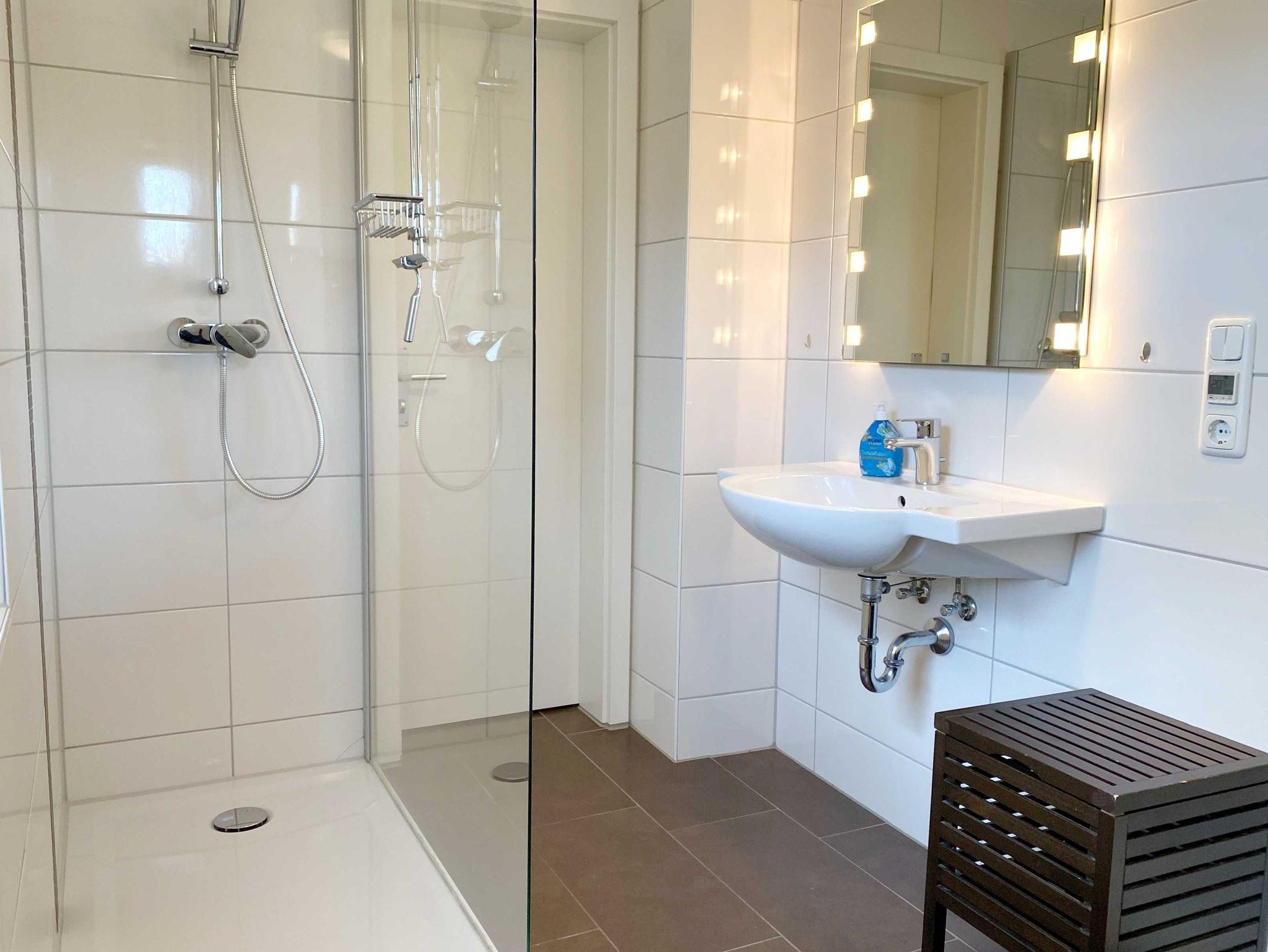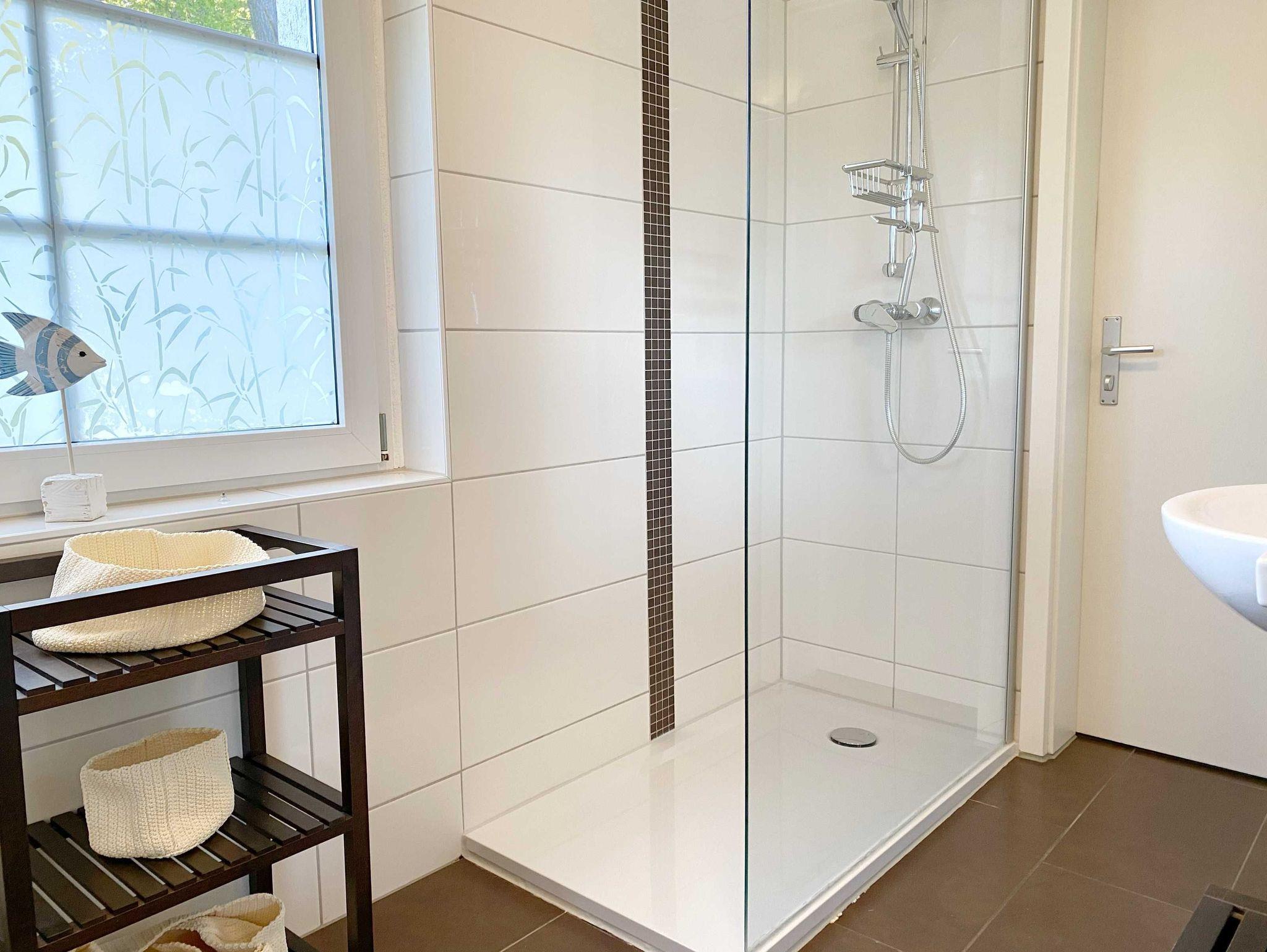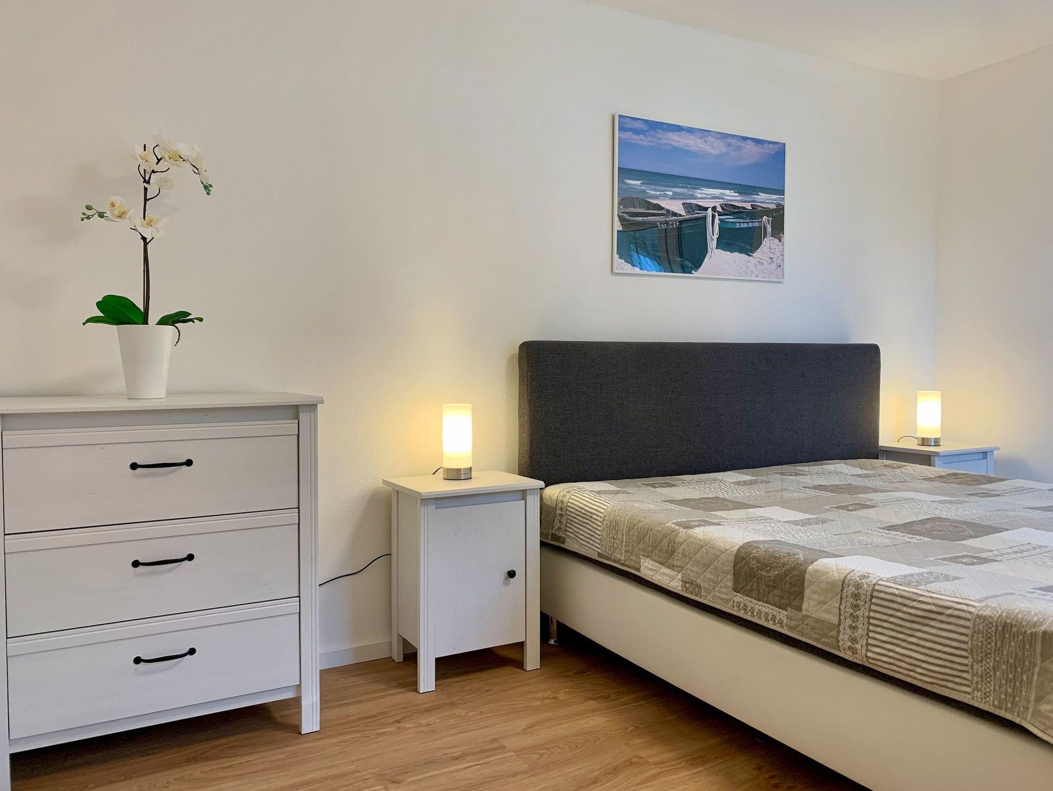 Den Eingangsbereich erreichen Sie über unsere 16 qm große möblierte Terrasse. Das große Schlafzimmer erreichen Sie vom Wohn-Küchenbereich und bietet Platz für 2 Personen mit einem Doppelbett der Größe 180 cm x 200 cm. Die offene Wohnküche ist mit einer gemütlichen Sitzecke mit Couch und TV eingerichtet. Der Küchenbereich selbst, verfügt über eine Küchenzeile mit diverser Ausstattung, u.a. mit Ceranfeld, Backofen, Kaffeemaschine, Wasserkocher, Toaster, Mikrowelle, Spülmaschine, div. Geschirr sowie einem Esstisch. Von der Küche aus gelangt man über den Flur zum kleineren Schlafzimmer mit zusätzlichem Flachbild-TV, einem Doppelbett (160 cm x 200 cm) und Kleiderschrank. Ebenfalls vom Flur aus erreicht man das Bad und den Abstellraum. Das Bad ist mit einer Dusche, WC und Waschbecken ausgestattet. Das gesamte Ferienhaus ist mit Fußbodenheizung ausgestattet.