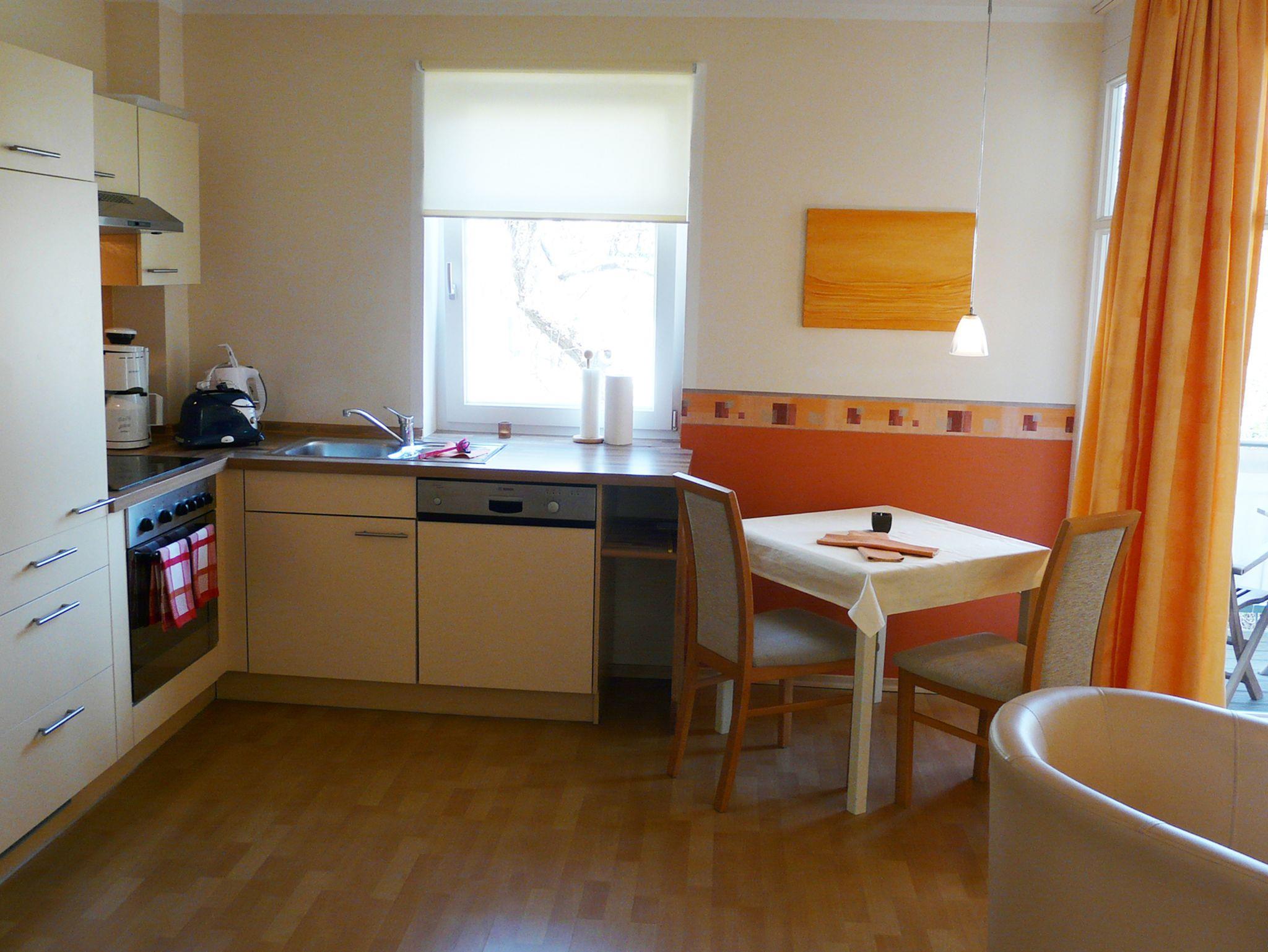Wohnzimmer mit bequemer Couch und Sessel, Essecke, kleine Leseecke, SAT-TV, Kompaktstereoanlage mit Radio und CD, Einbauküche mit gehobener Ausstattung sowie Ceranfeld, Backofen, Geschirrspülmaschine, Dunstabzug und Kühlschrank, Schlafzimmer mit Doppelbett (1,60 m x 2 m), Kleiderschrank, Kommode und 2 Nachttischen, Großes Badezimmer mit ebenerdiger Dusche, WC, Haartrockner, Kosmetikspiegel, Handtuchheizung, Fußbodenheizung, Balkon Ost mit Blick in den Garten, ausgestattet mit Teakholzmöbeln.