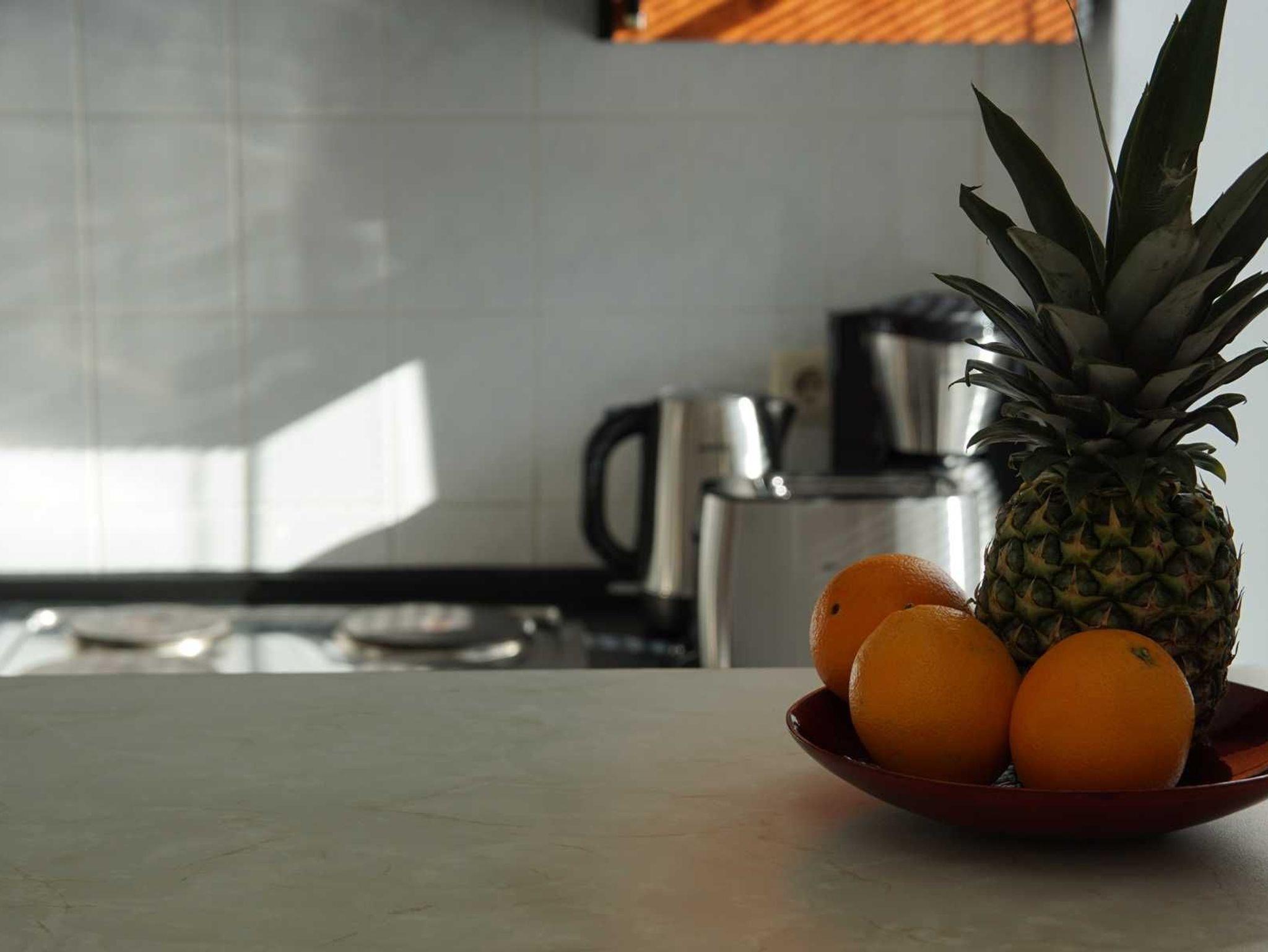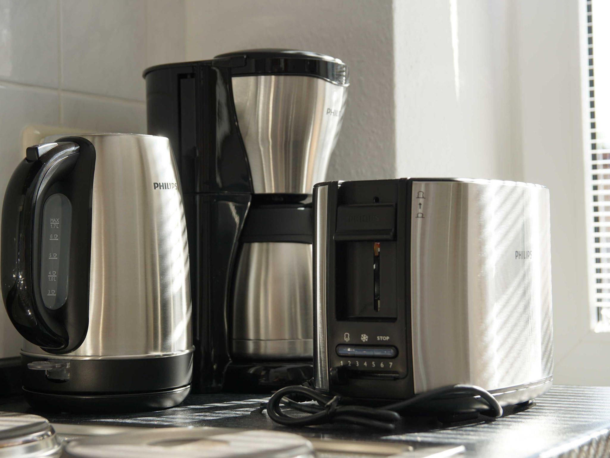 Die Küche ist ausgestattet mit Cerankochfeld, Backofen, Mikrowelle, Filterkaffeemaschine, Toaster, Wasserkocher, Kühlschrank mit Tiefkühlfach, Geschirr, Besteck, Koch- und Bratgeschirr, Sitztresen und vier Hochstühle.