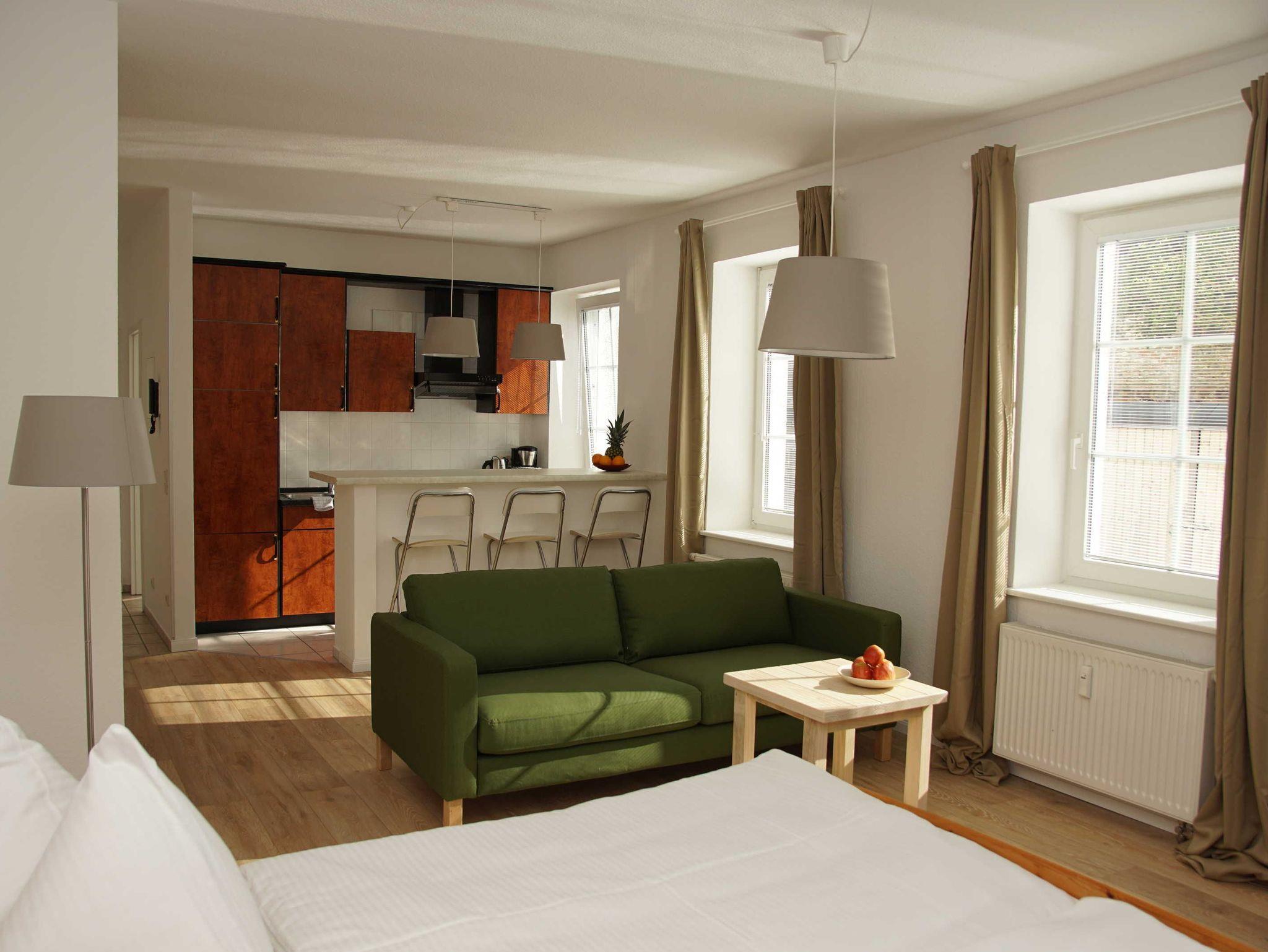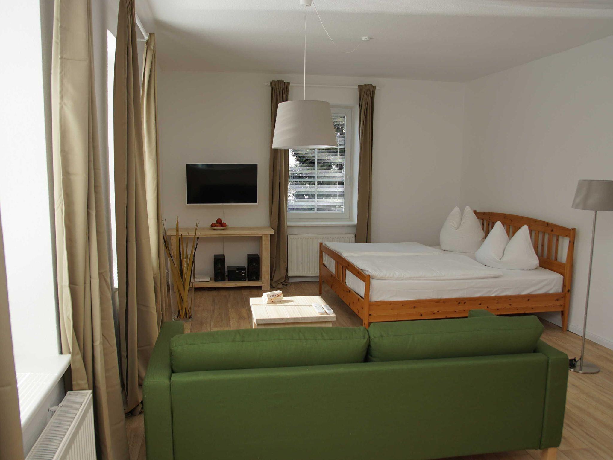 1 Raum-Ferienwohnung, NIchtraucher, für bis zu 2 Erwachsene und bis zu 2 Babybetten, gelegen im Erdgeschoss.
