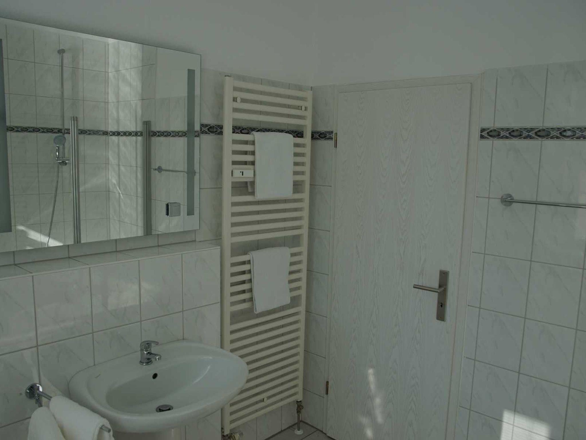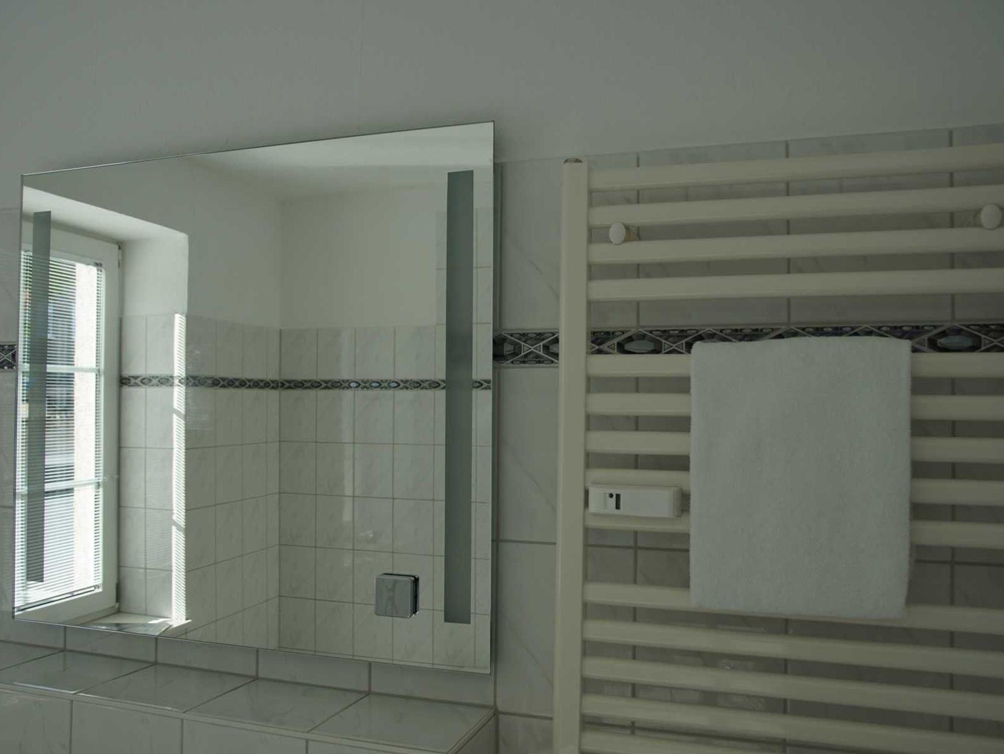 Bad mit Dusche, WC, Waschbecken, großer beleuchteter Spiegel, Schminkspiegel.