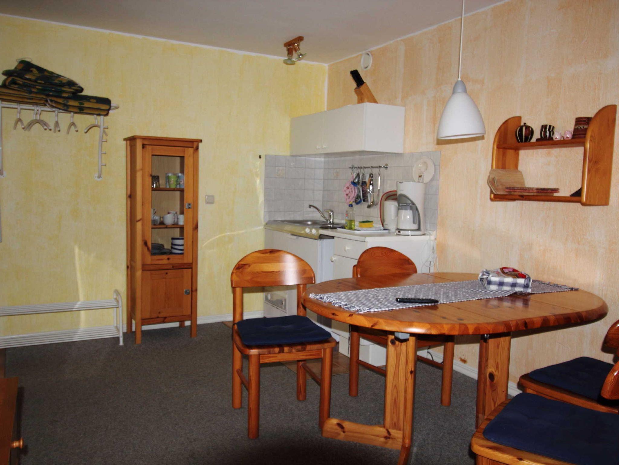 • Der Wohnraum ist ausgestattet mit einer Sitzgruppe, Radio und TV