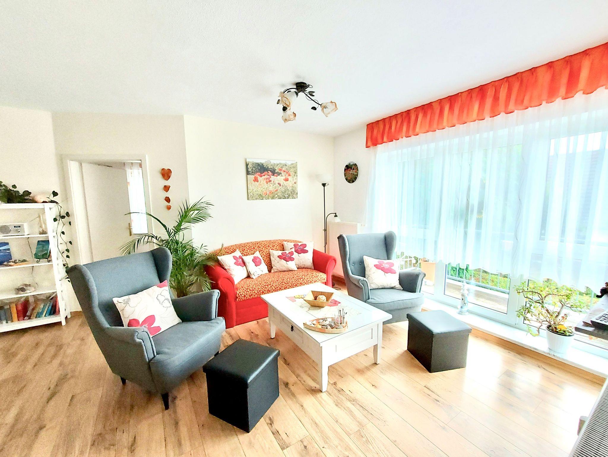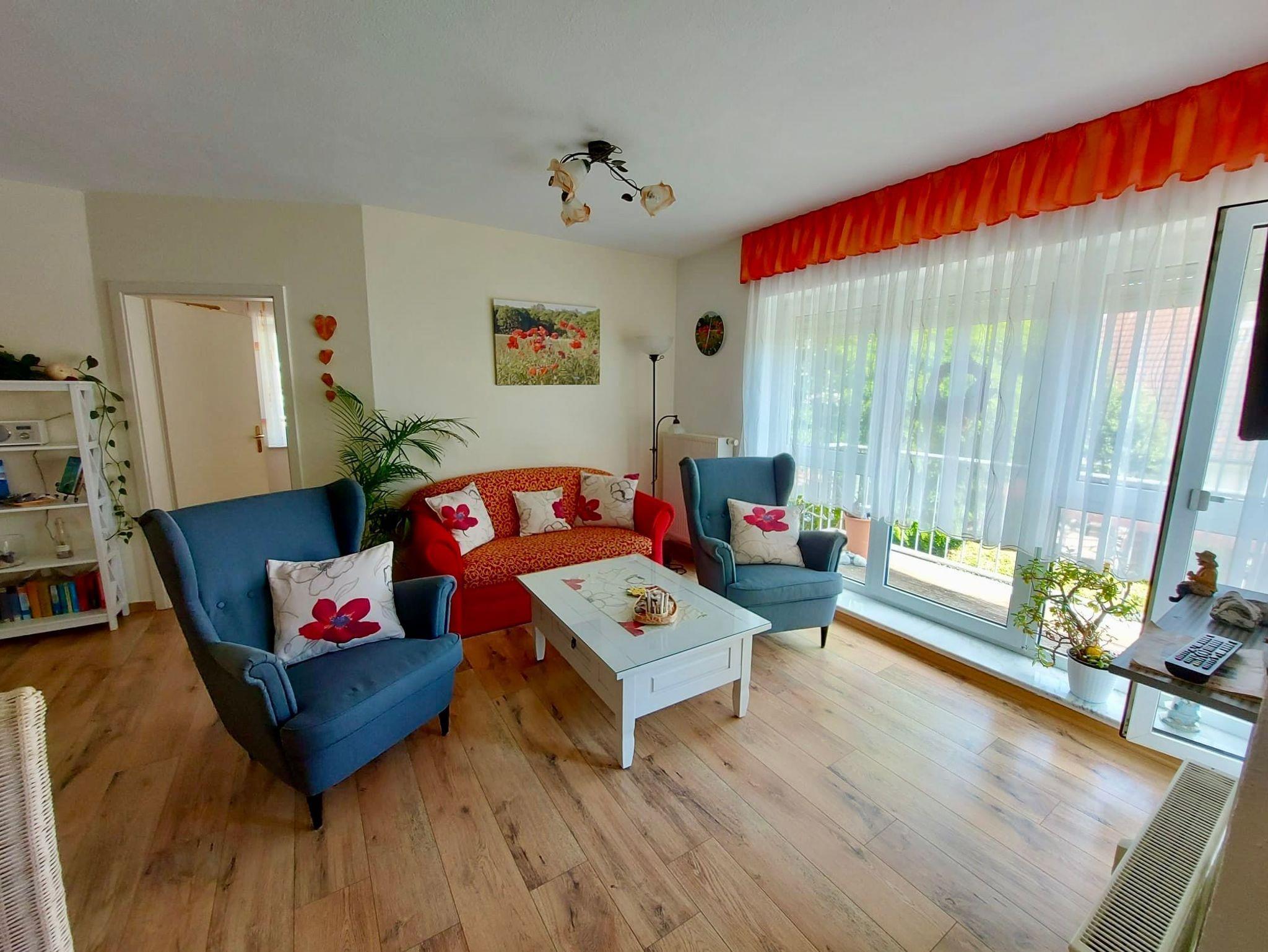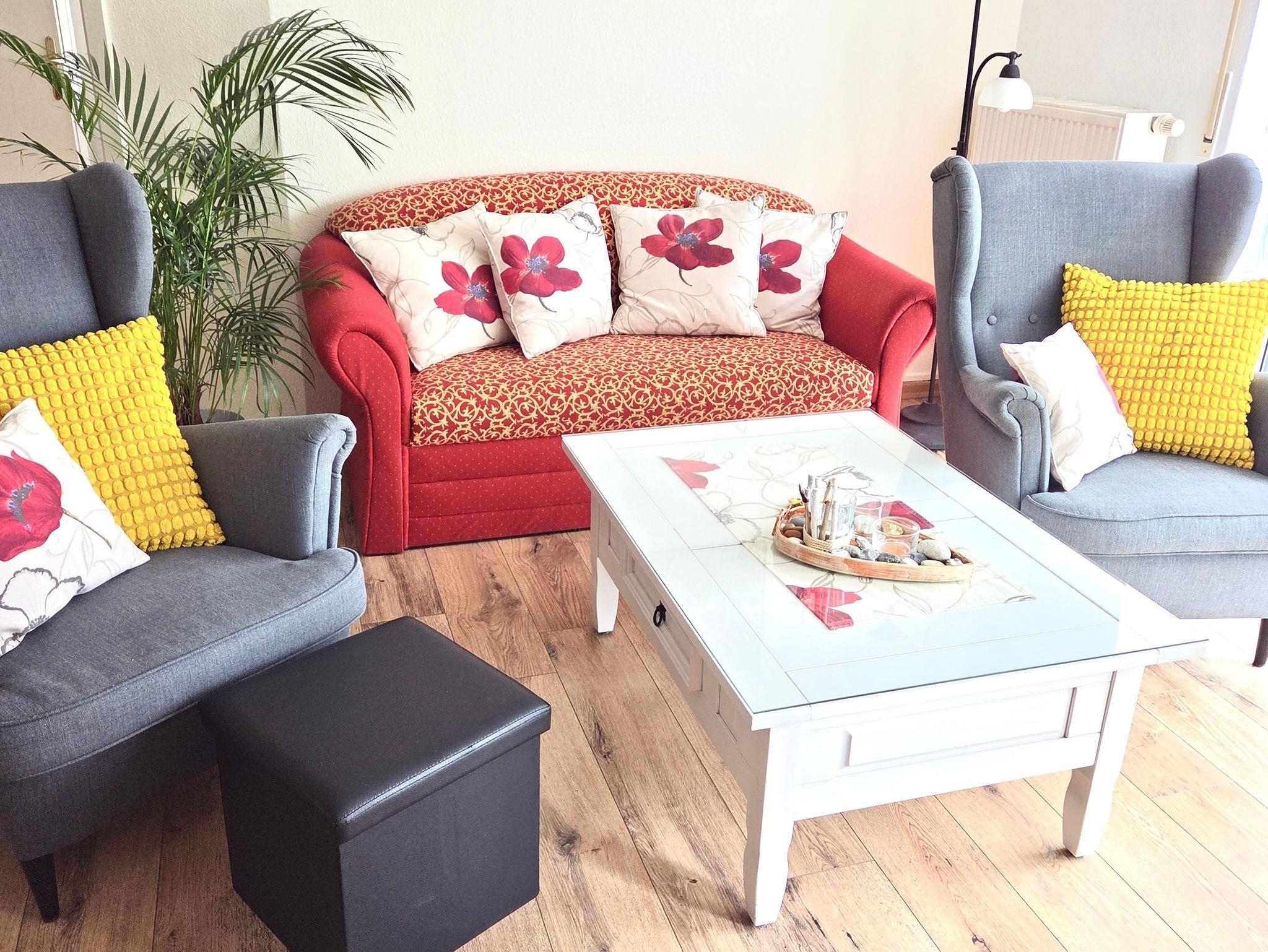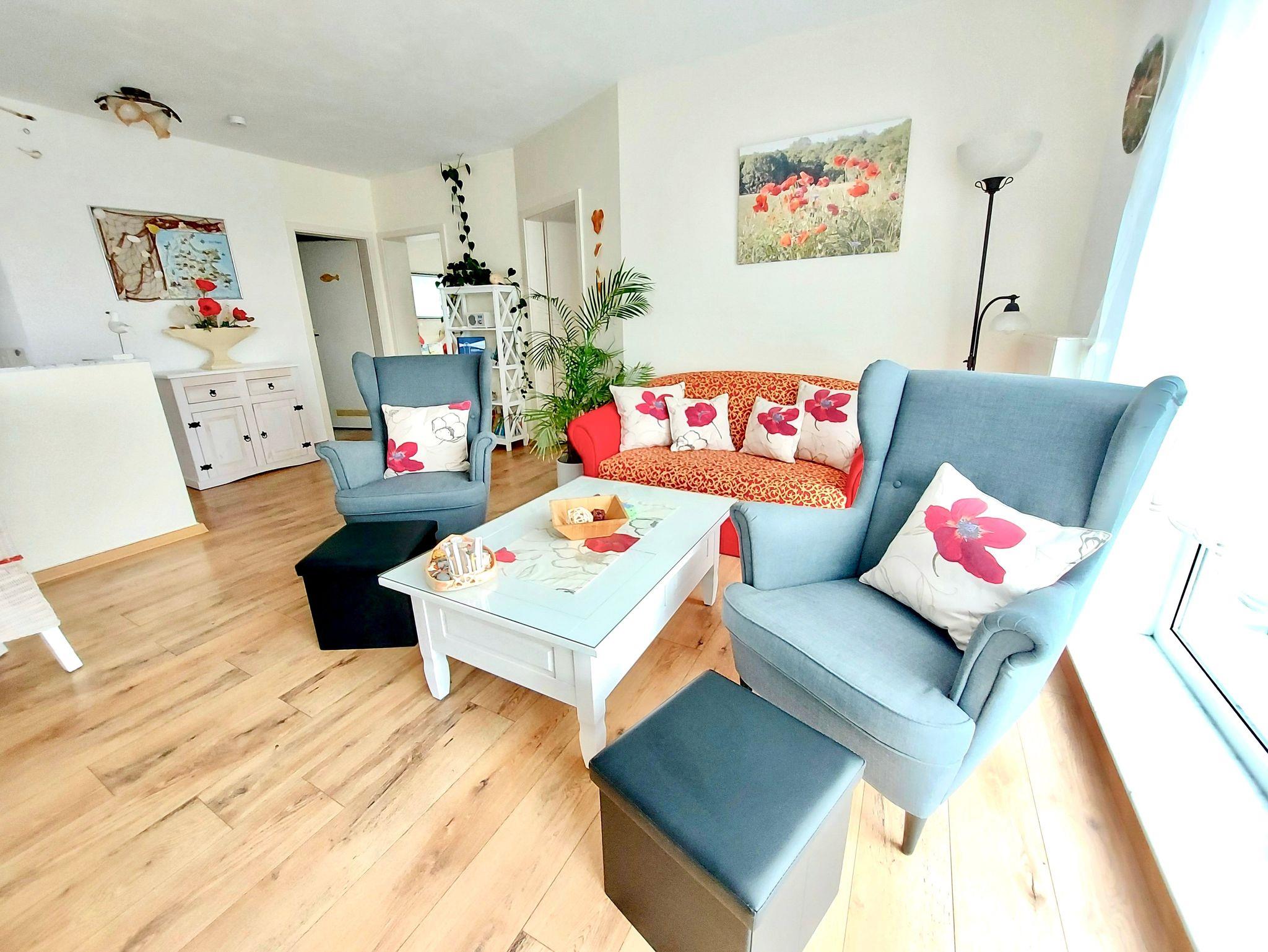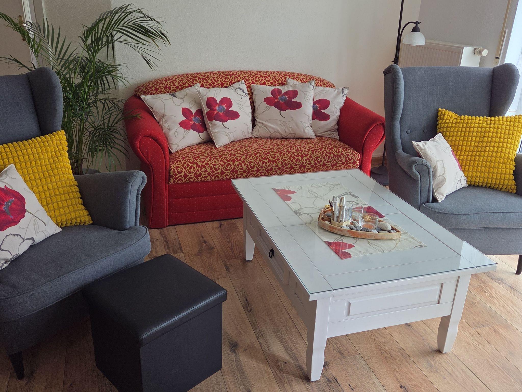 Ferienwohnung Mohnblume, Sassnitz. Diese Komfort-Ferienwohnung befindet sich in bevorzugter Lage am Hochufer im ersten Stock eines gepflegten Apartmenthauses in ruhiger Lage aber sehr Zentral. Sie verfügt über einen großen lichtdurchfluteten Wohnraum mit 2 gemütlichen Sofas, und einem Sessel, die zum Sat.- Fernsehen oder zum Musikhören einladen,oder gehen sie von hier auf den Balkon mit schönen Holzmöbeln Sitzkissen und Sonnenschirm und geniessen zb. leckeren Fisch den sie gerade am Hafen direkt vom Fischer geholt haben und in der kompletten Einbauküche mit allem Komfort , wie Geschirrspüler,Mikrowelle,Ceranfeld,Kühl-Gefrierkombi usw mit Freude zubereiten können.Angrenzend ist der Esstisch mit 4 gemütlichen Stühlen.Die Nacht geniessen sie im grosszügigen Schlafzimmer mit Doppelbett und 2. Balkon und im zweiten Schlafzimmer mit 2 Einzelbetten.Im Bad erwartet sie zum Entspannen eine Wanne. Auch ihr Auto hat einen eigenen PKW-Stellplatz auf dem Hof. Fahrradständer vorhanden. Bettwäsche inklusive. Handtücher bitte selbst mitbringen.