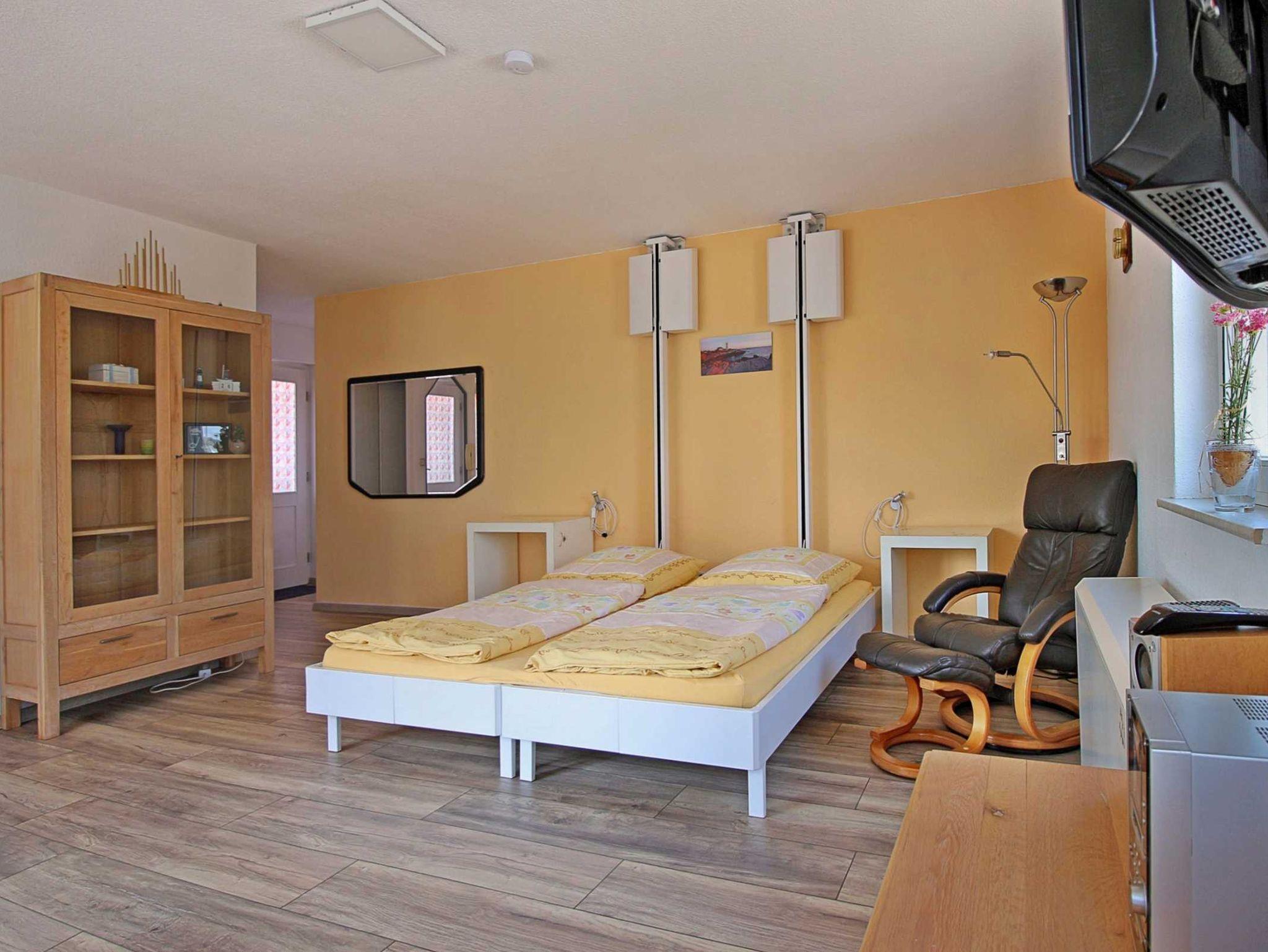 - Kombinierter Wohn-Schlafraum mit Schrankbett (1,60 m x 2,00 m, getrennte Matratzen), Sitzecke mit 2 Relaxsesseln, Couch, Flachbildfernseher, Stereoanlage, DVD-Player, Kleiderschrank