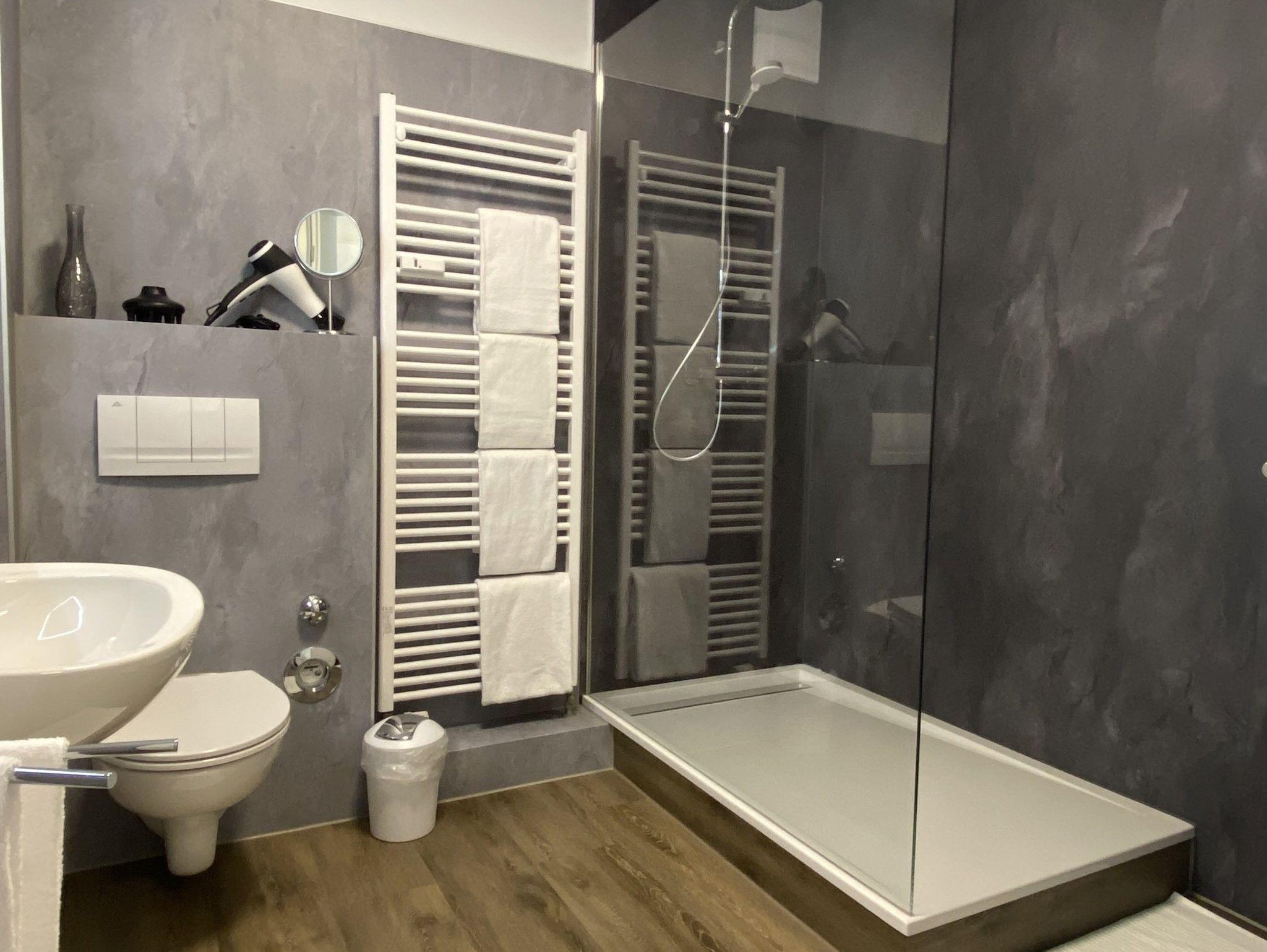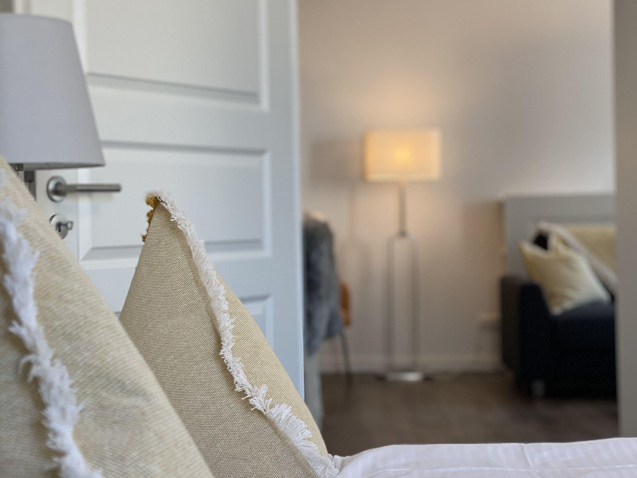 Großes separates Schlafzimmer mit Doppelbett und einer Liegefläche von 180 x 200 cm, die neuen EMMA-Matratze, geräumiger Kleiderschrank, Sideboard, TV und Sitzgelegenheit. Bad mit Dusche.