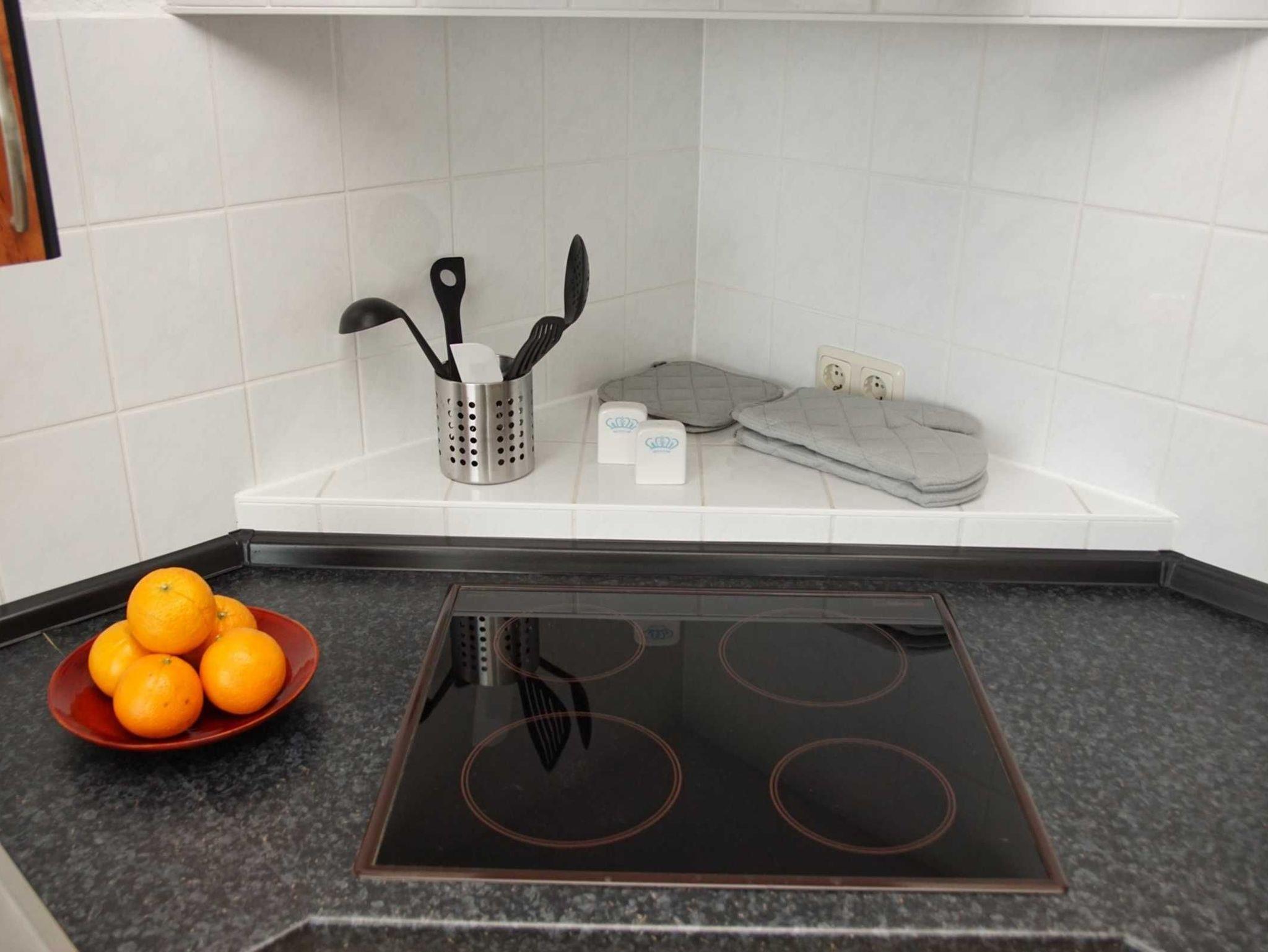 Die Küche ist ausgestattet mit Cerankochfeld, Backofen, Mikrowelle, Filterkaffeemaschine, Toaster, Wasserkocher, Kühlschrank mit Tiefkühlfach, Geschirrspülmaschine, Geschirr, Besteck, Koch- und Bratgeschirr, Sitzgruppe.