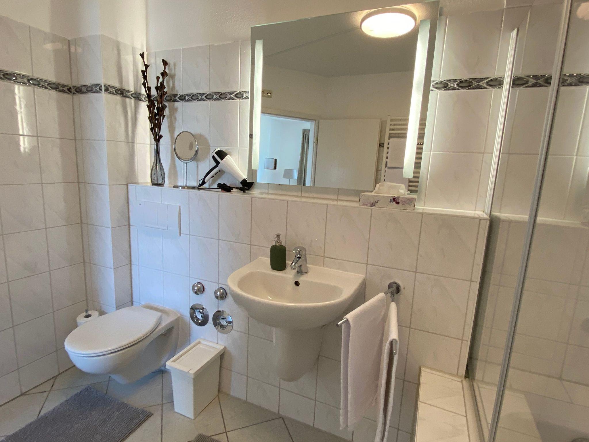 Bad mit Dusche, WC, Waschbecken, großer beleuchteter Spiegel, Schminkspiegel.