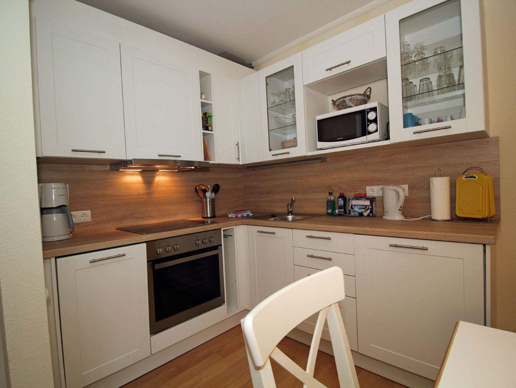 ? Im gemütlichen Wohnzimmer befindet sich eine Couch, eine Sitzgarnitur und ein Flachbild-TV. Die offene Küche ist ausgestattet mit einem 4-Platten-Ceranherd, einem Backofen, einer Mikrowelle, einem Kühlschrank, einer Spülmaschine, einem Wasserkocher, einem Toaster, einer Kaffeemaschine sowie einem Küchentisch mit Stühlen.