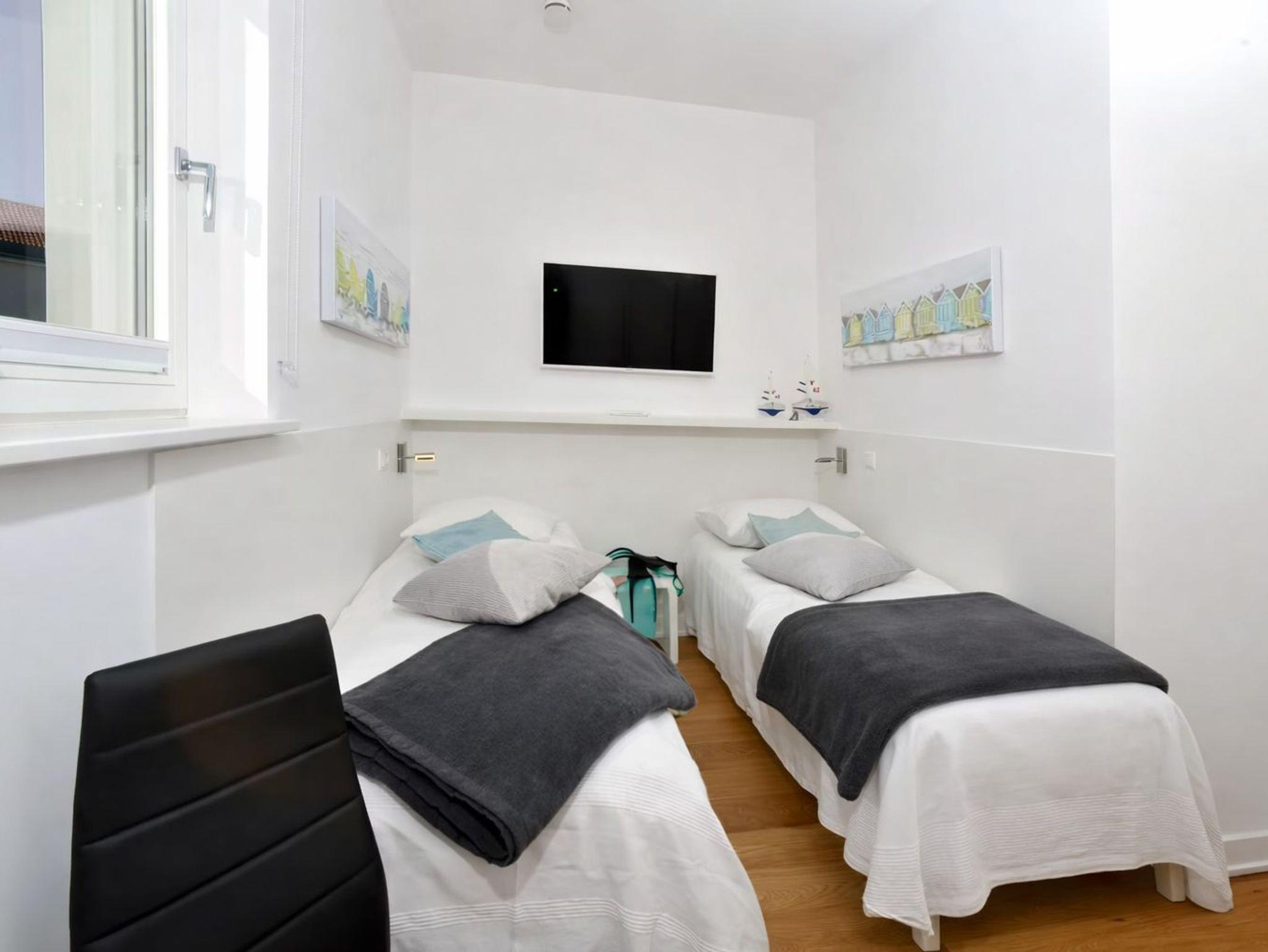 In der Ferienwohnung befinden sich zwei Schlafzimmer. Ein Schlafzimmer verfügt über ein Doppelbett und im anderen Schlafzimmer befinden sich zwei einzelstehende Betten.