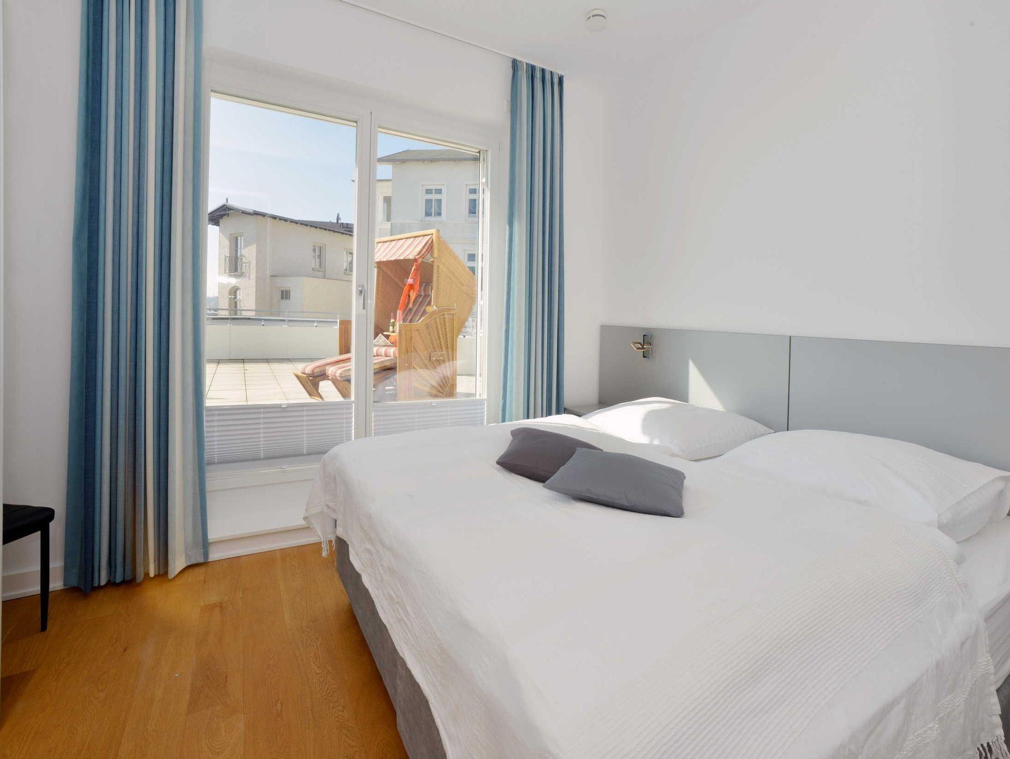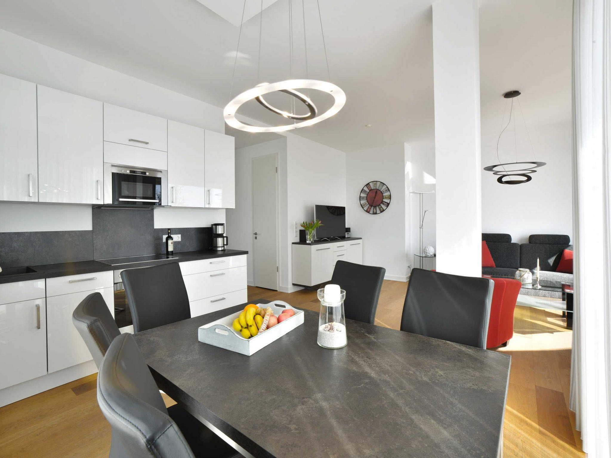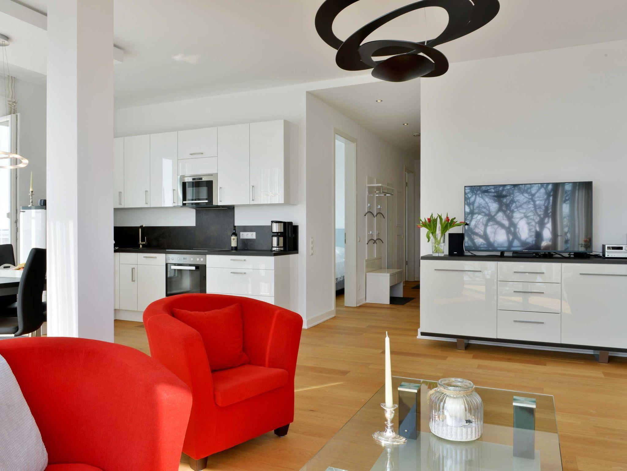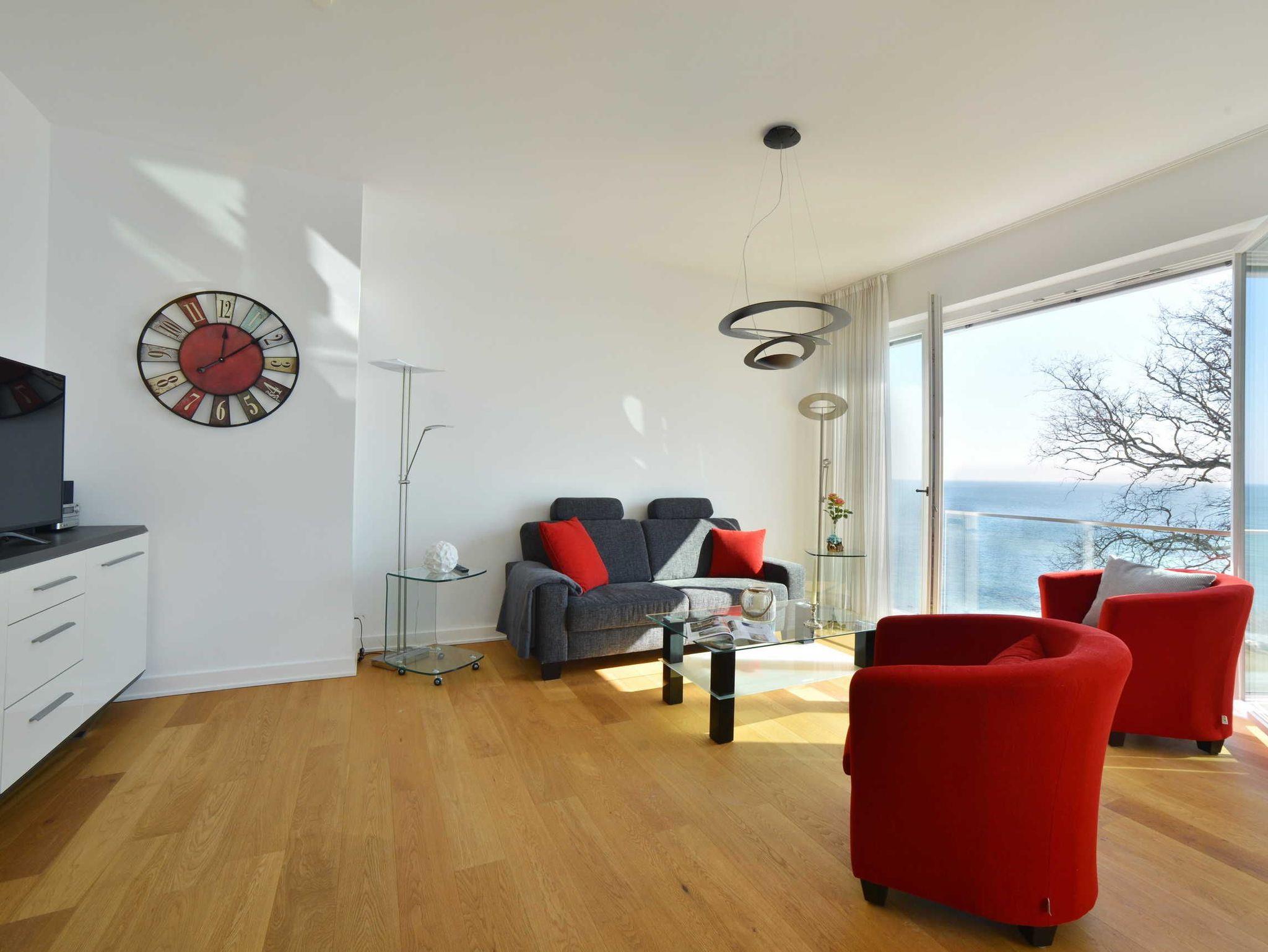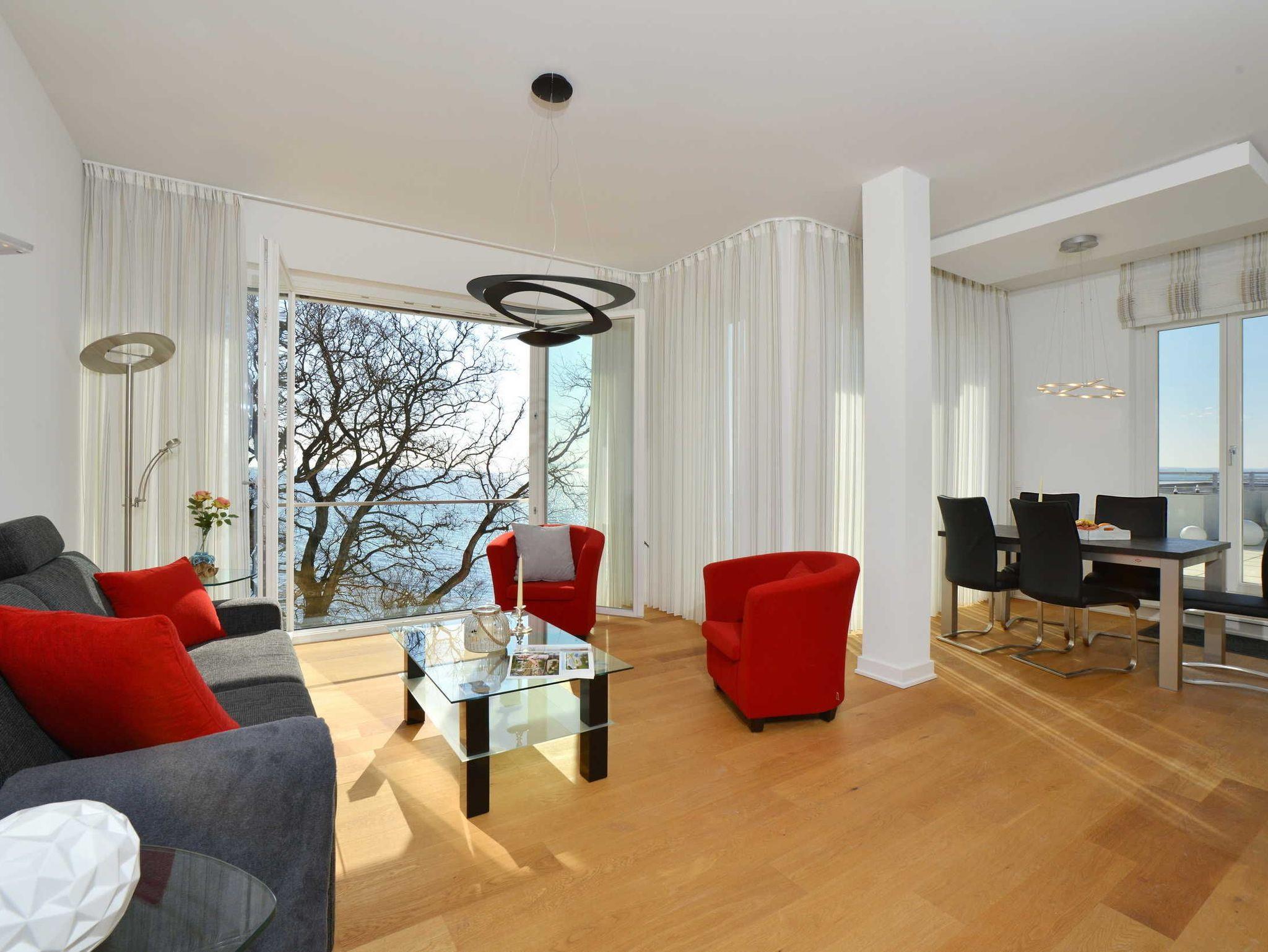 Auch das große, geschmackvoll eingerichtete Wohnzimmer mit Ostseeblick auf der gesamten Breite begeistert das ganze Jahr über. An kalten Tagen können Sie in der wohnungseigenen Sauna, die über einen zusätzlichen Infrarotstrahler verfügt, entspannen.