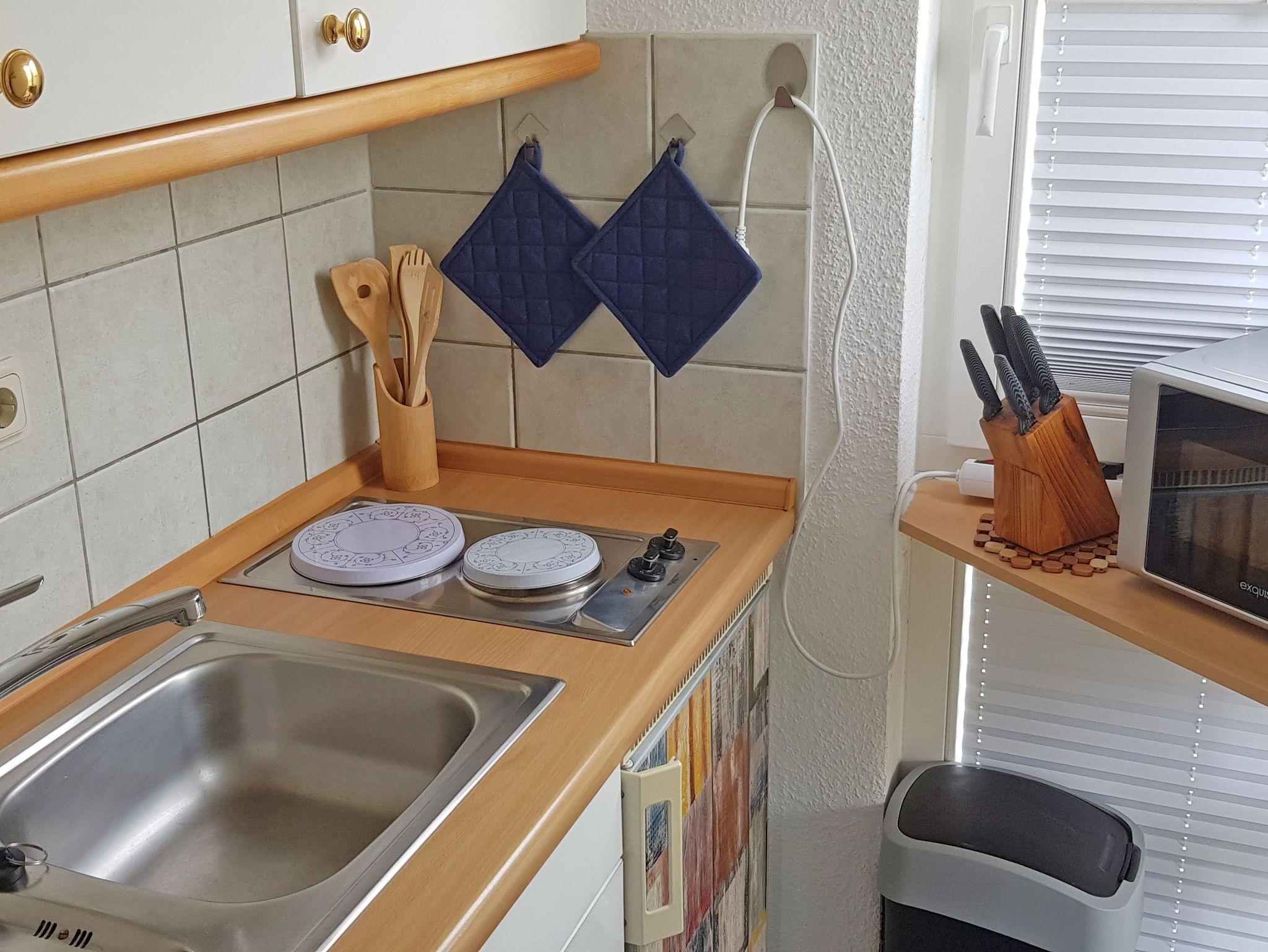 • kleine Küchenzeile mit 2-Plattenherd, Mikrowelle, Kühlschrank mit Eisfach, Kaffeemaschine, Wasserkocher und Toaster