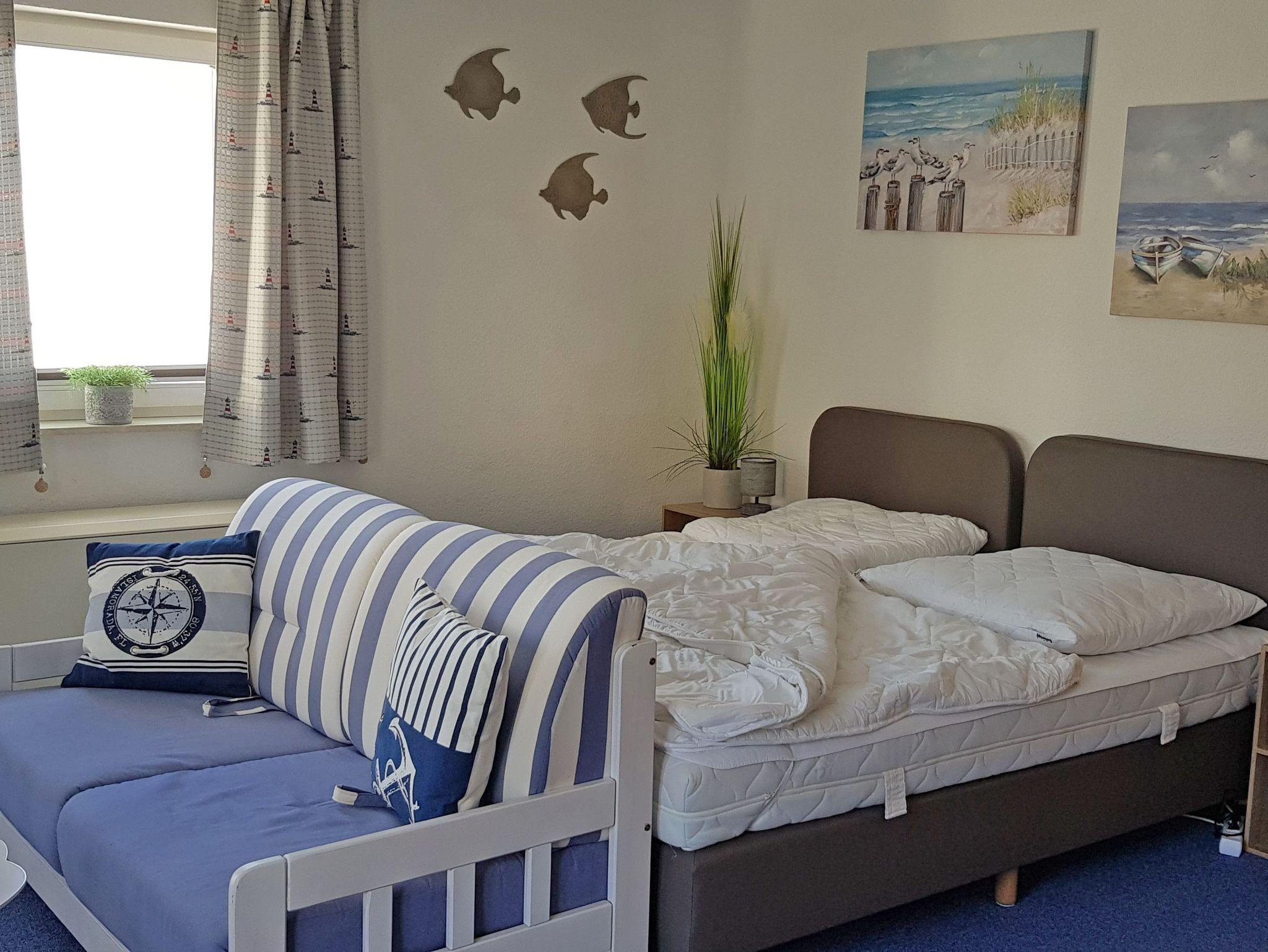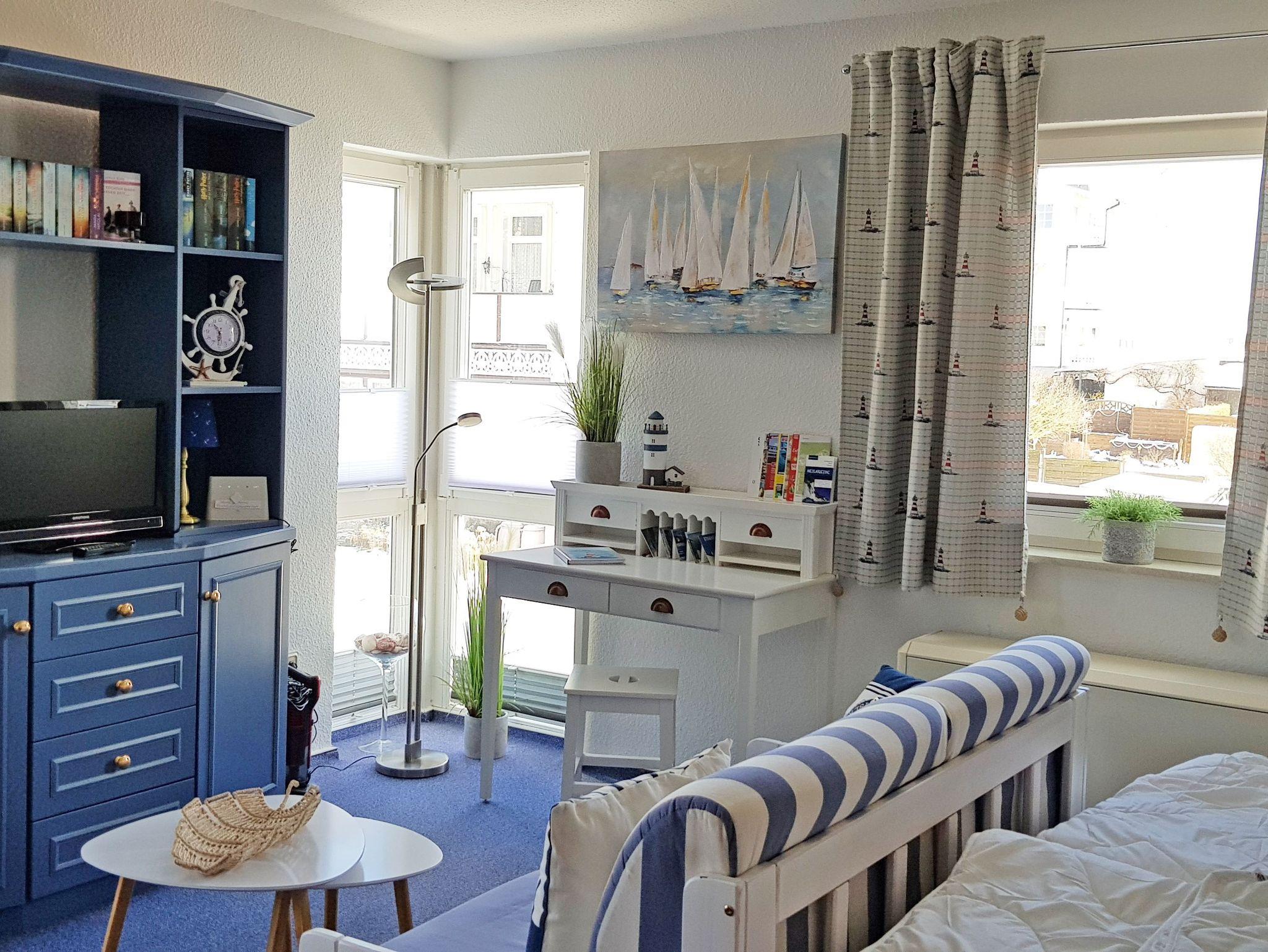 • kombiniertes Wohn-/Schlafzimmer mit Doppelbett (1,80 m x 2 m), ausziehbare Schlafcouch (1,90 m x 1,20 m) , Kleiderschrank, Essecke, Fernseher (Smart-TV) und kostenloses WLAN