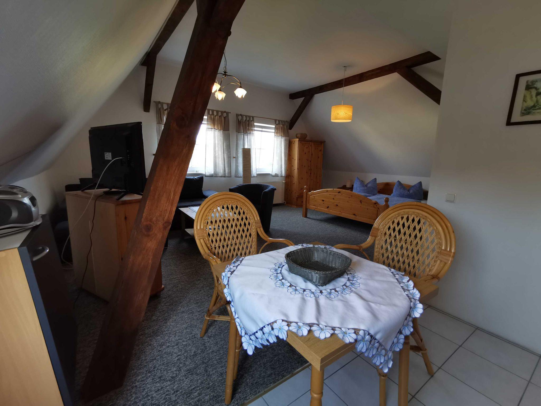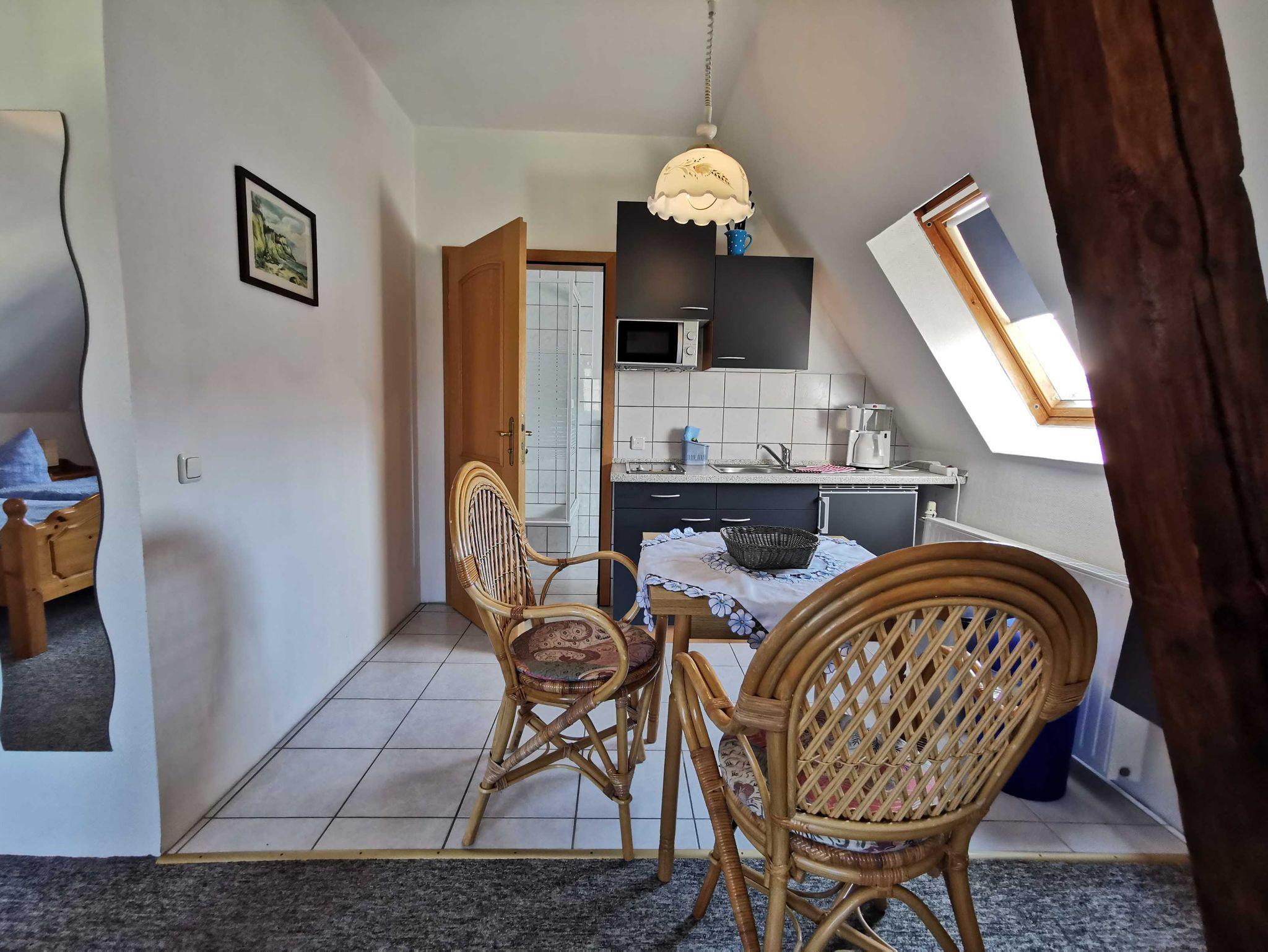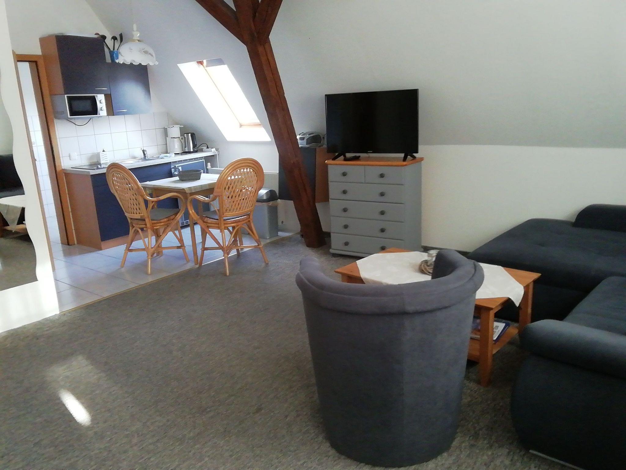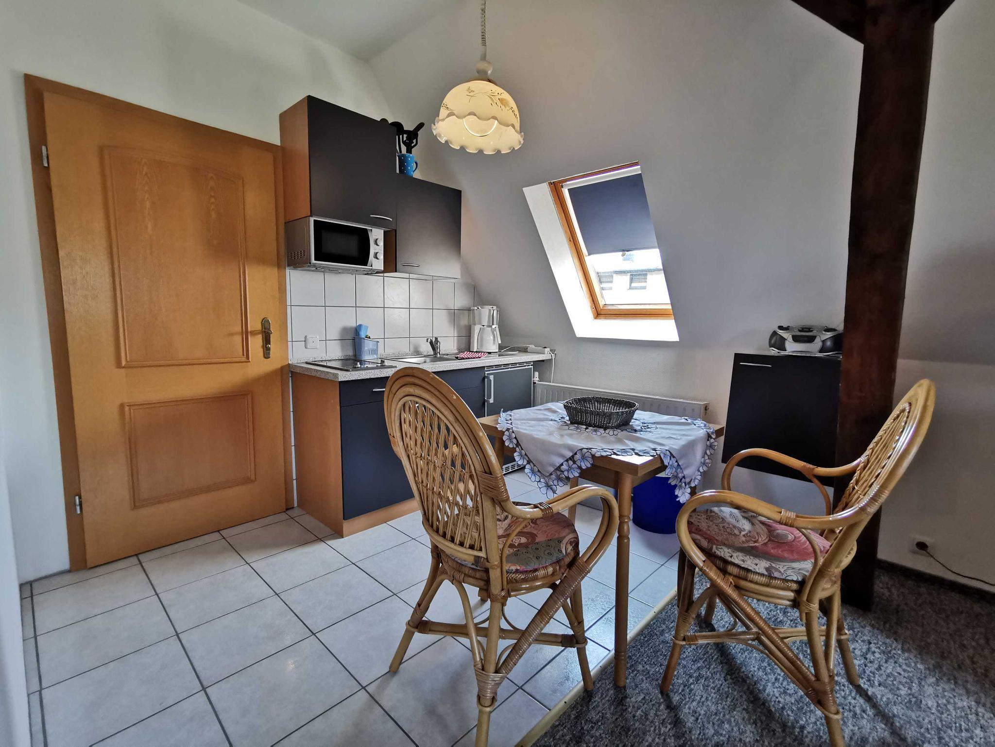 Unsere Ferienwohnung ist ca. 40qm groß und befindet sich im Obergeschoß, mit einem gemütlichen Wohn-, Schlafraum,Küchenzeile u. DU/WC ausgestattet. Die Sitzecke vor dem Haus lädt bei sonnigem Wetter zum Entspannen und Grillen ein. Ein Pkw-Stellplatz ist ebenfalls vorhanden.