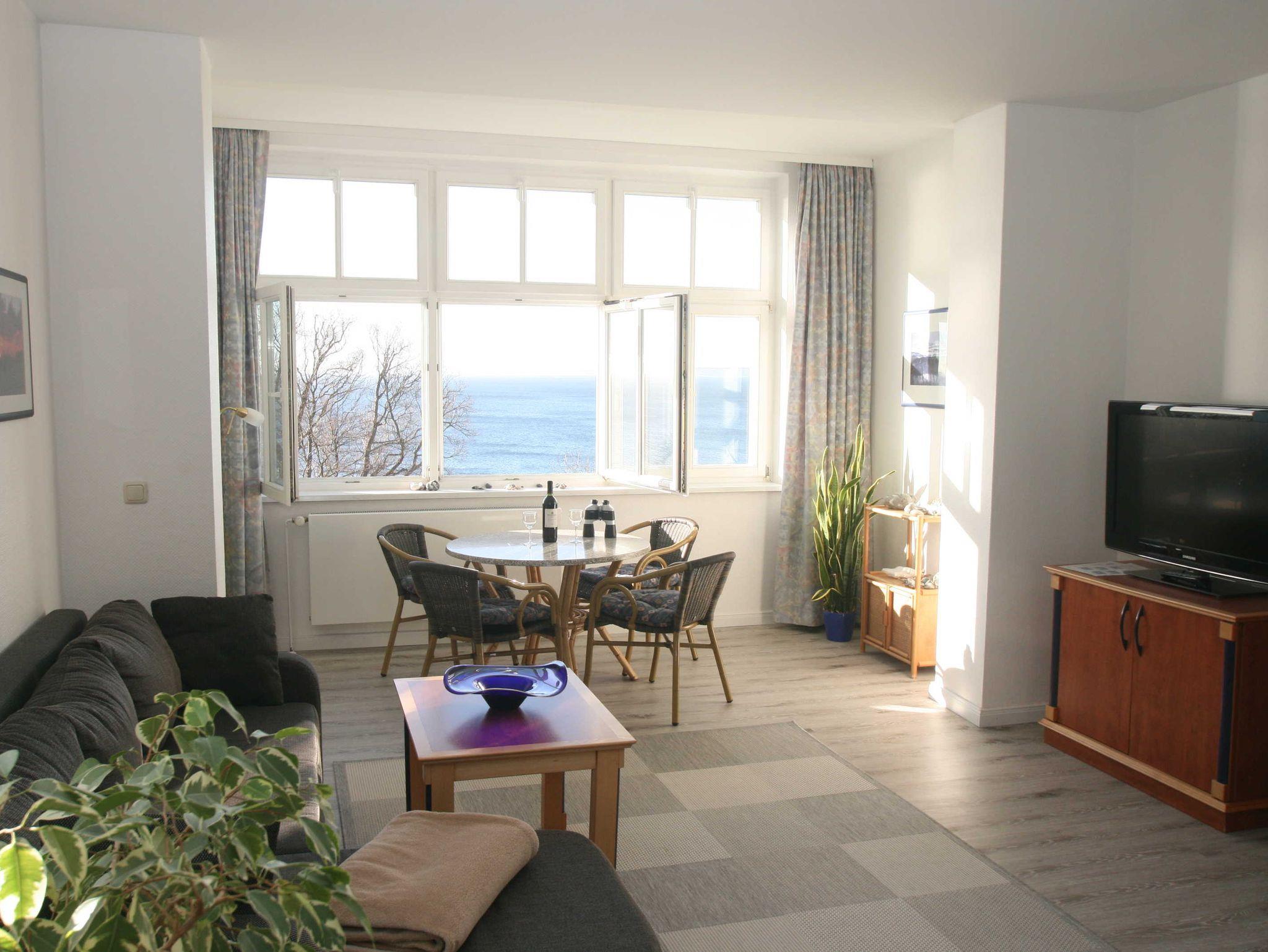 Im Wohnzimmer befindet sich ein Schreibtisch, eine gemütliche Wohnlandschaft, die dann auch für 2 Aufbettungen genutzt werden kann, einen grossen Flatscreen-TV und eine Multifunktionanlage, mit der Sie auch CD' s & DVD's abspielen können. Wir leihen Ihnen auch gerne eine DVD über die schöne Insel Rügen aus.