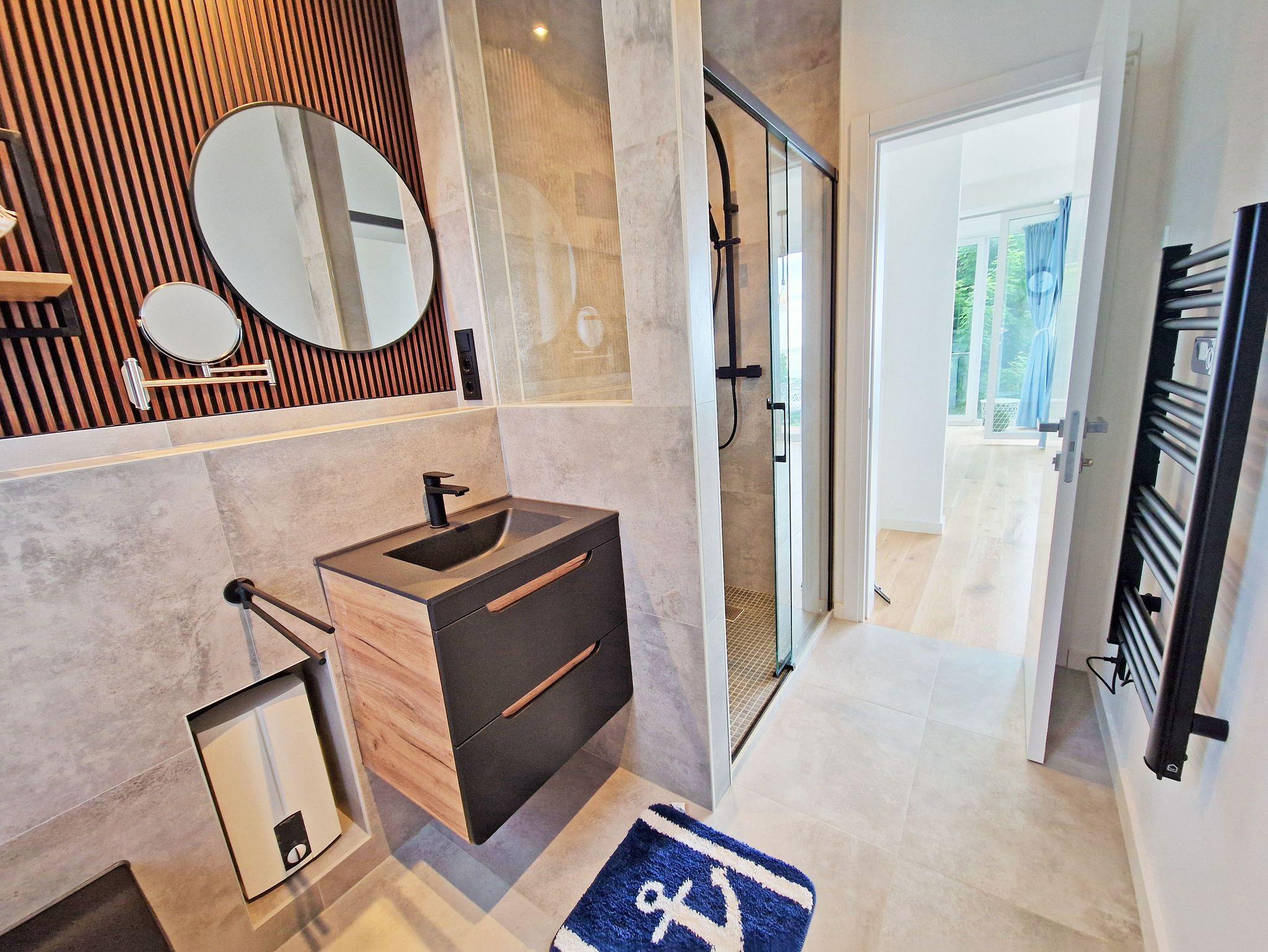 ? Das moderne Badezimmer ist ausgestattet mit bodengleicher Dusche, Regenbrause und WC.
