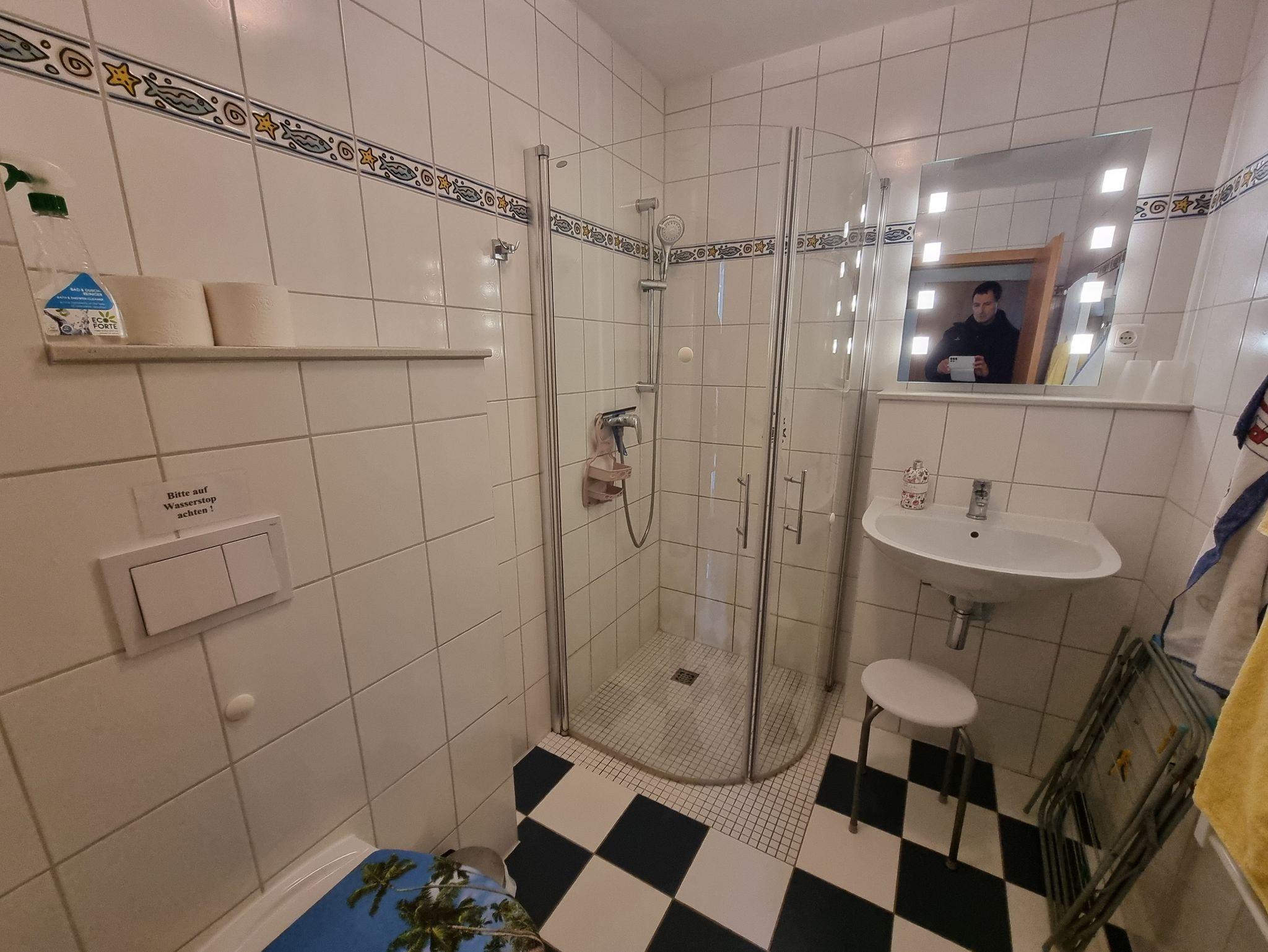 ? Das Bad verfügt über eine ebenerdige Dusche, Waschtisch und WC.