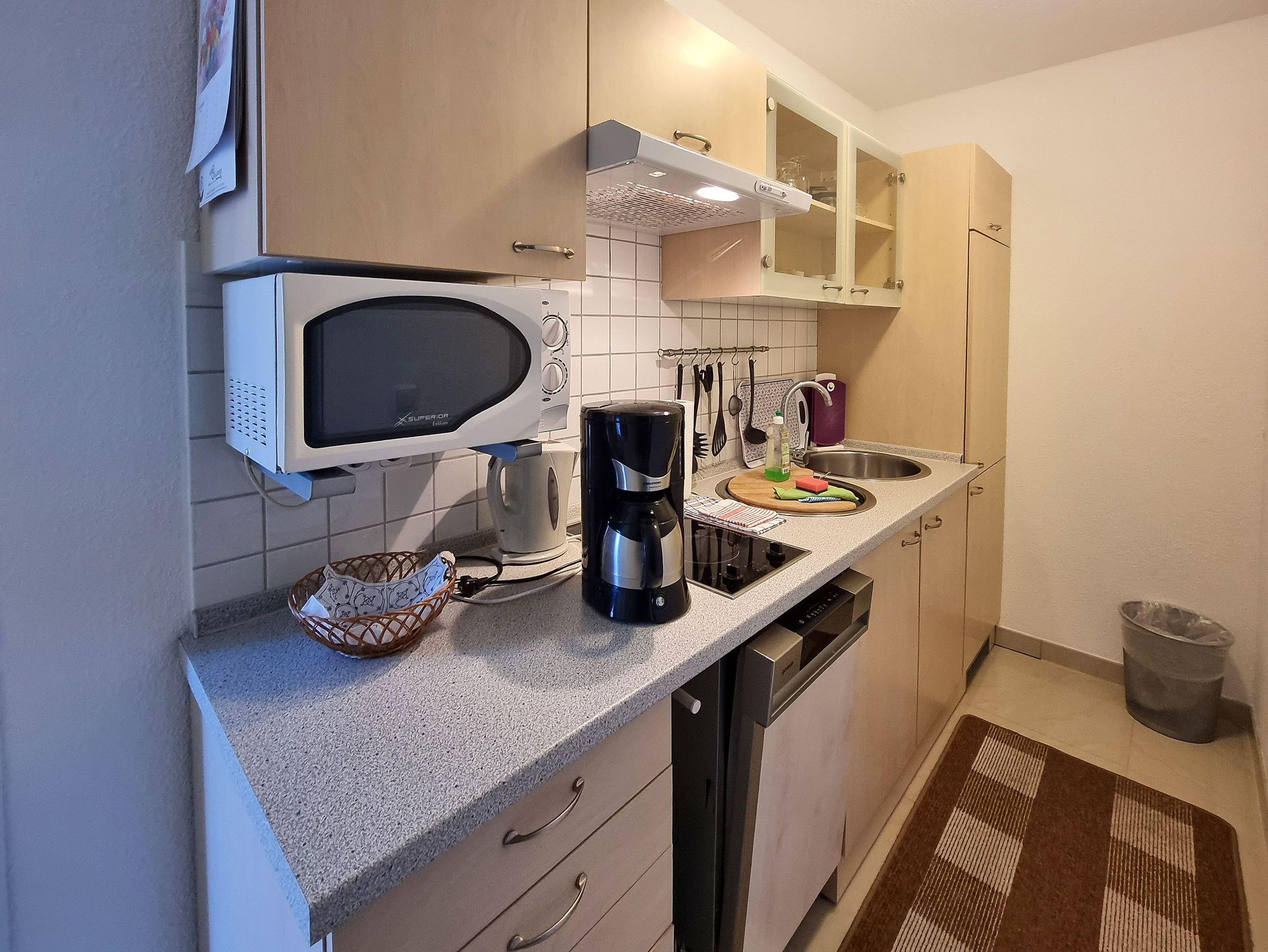 ? Im Eingangsbereich befindet sich die Küche. Diese verfügt über ein 2-Platten-Ceranherd, Mikrowelle, Geschirrspüler, Kaffeemaschine, Wasserkocher, Toaster und Eierkocher.