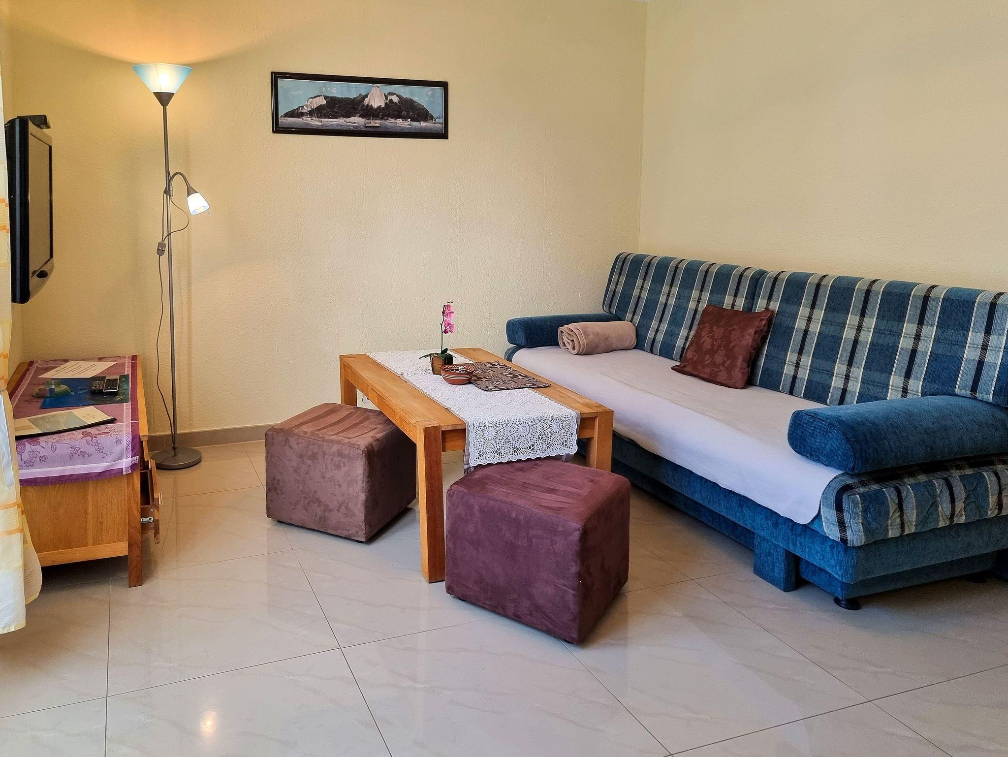 ? Der Wohnbereich bietet eine gemütlicher Couchgarnitur, die auch als Aufbettung dient, Flachbidfernseher, kostenfreies WLAN, sowie ein Esstisch mit Stühlen für 3 Personen.