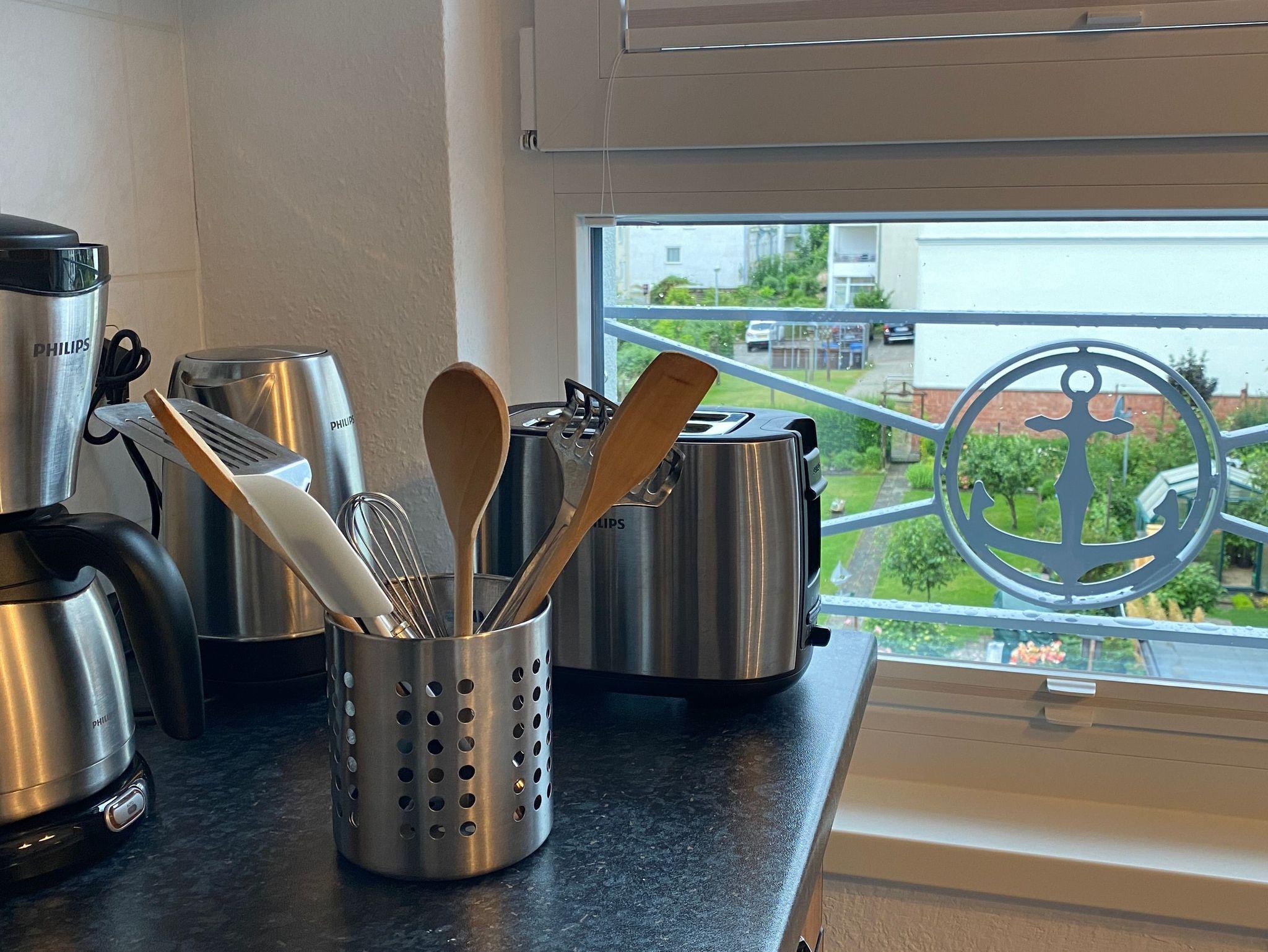 Die Küche ist ausgestattet mit Cerankochfeld, Backofen, Mikrowelle, Filterkaffeemaschine, Toaster, Wasserkocher, Kühlschrank mit Tiefkühlfach, Geschirr, Besteck, Koch- und Bratgeschirr, gemütlicher Sitztresen und vier Hochstühle.