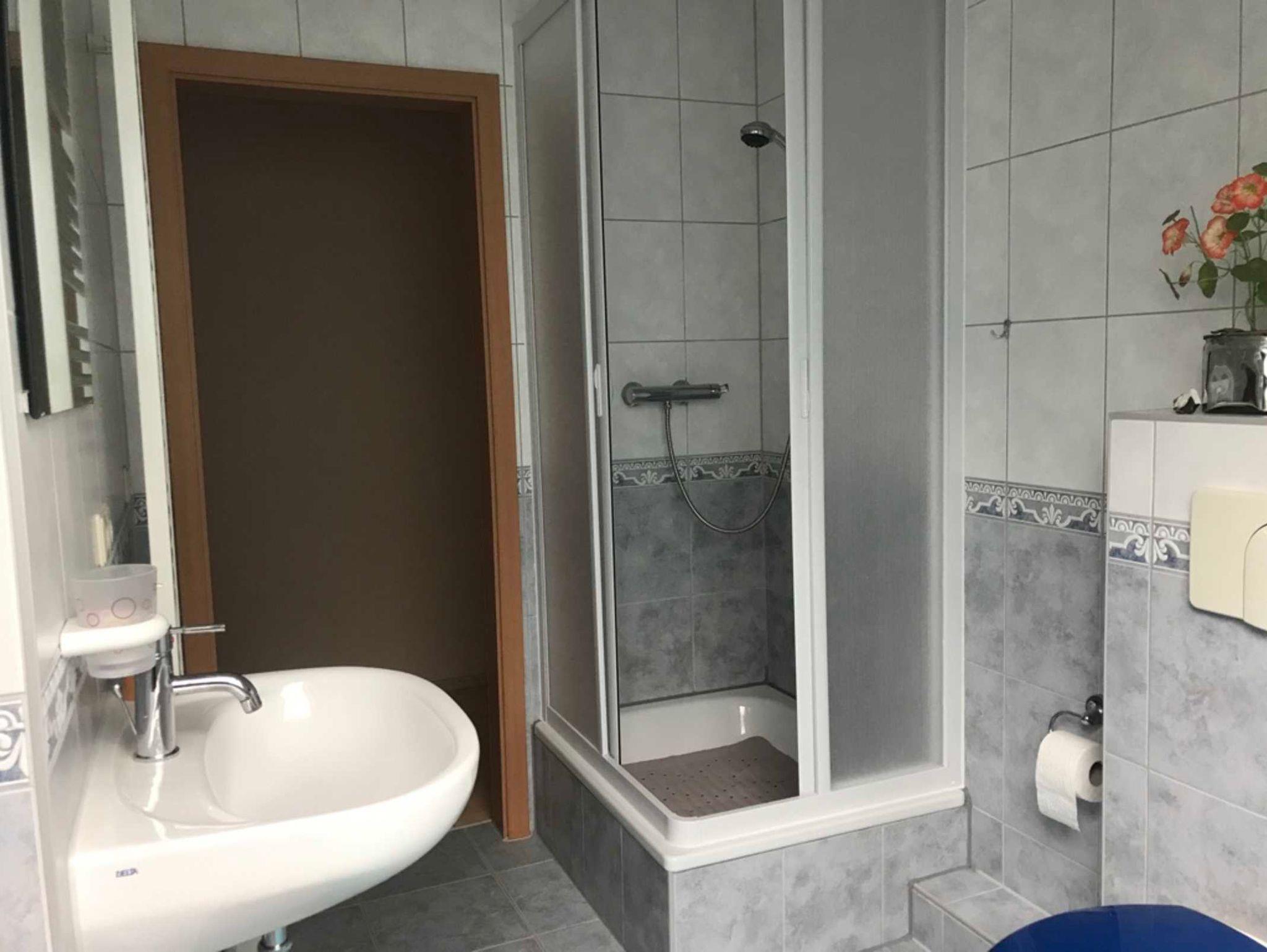 ? Das Bad ist mit Dusche, WC und Fön ausgestattet.
