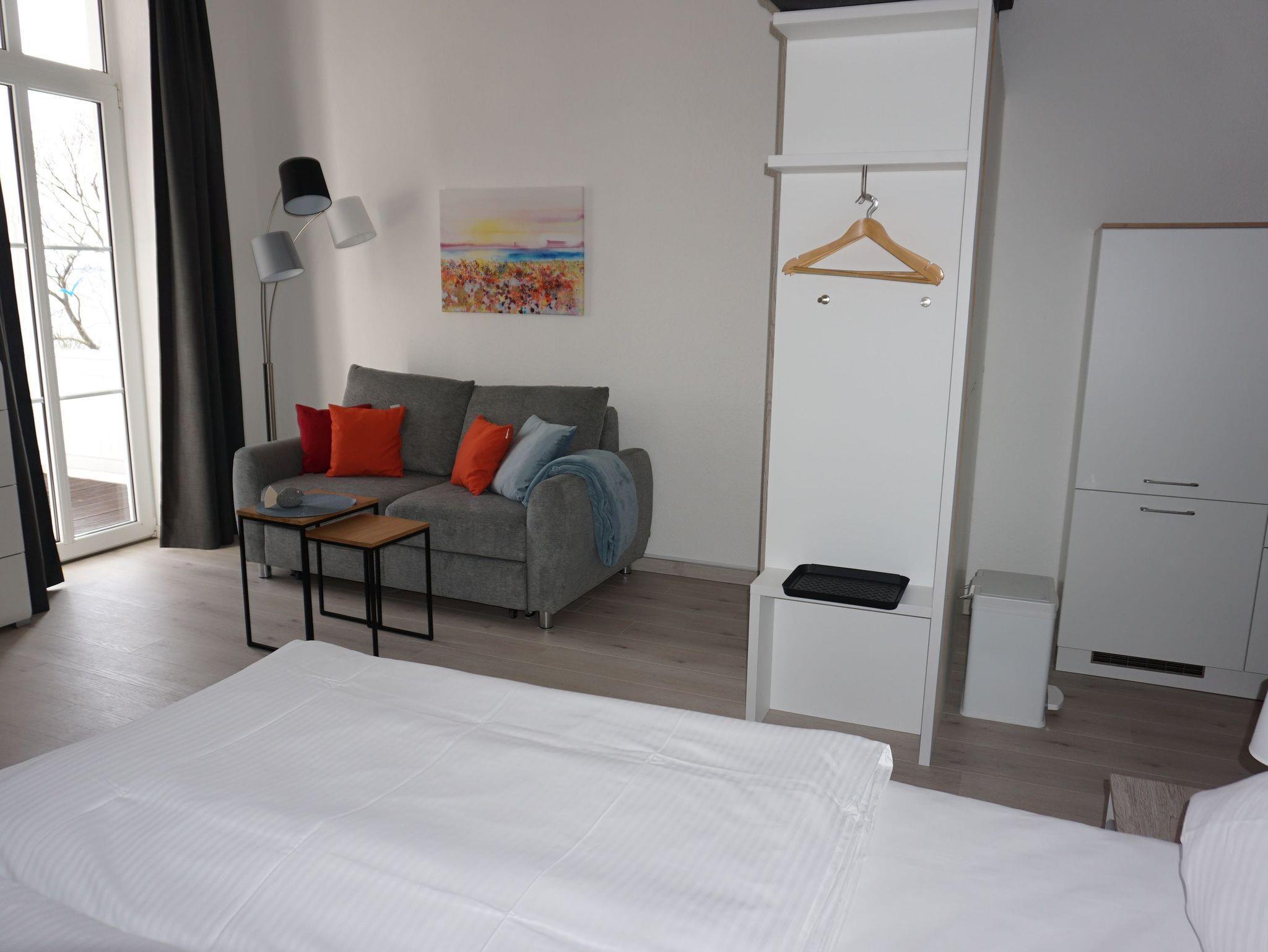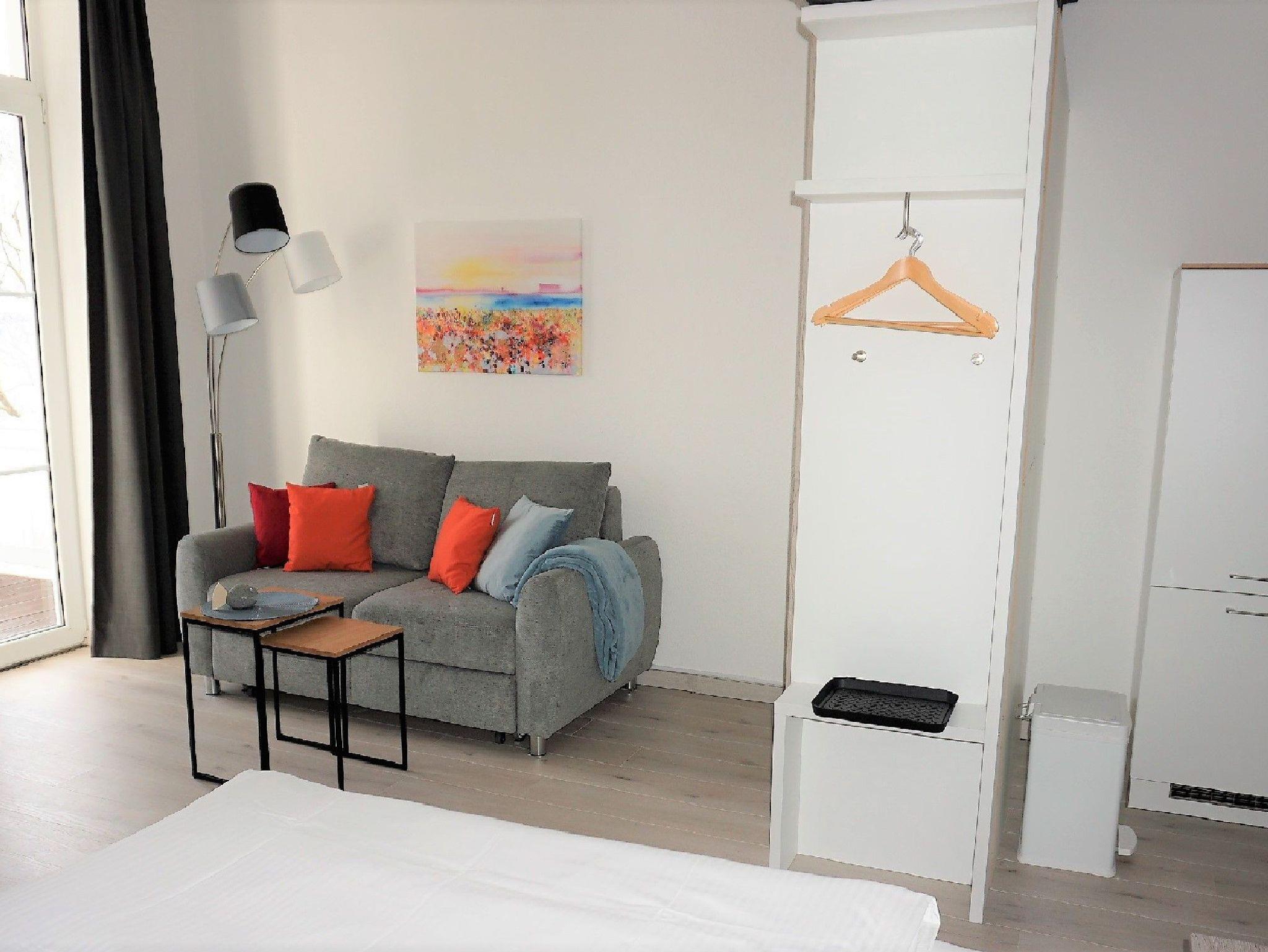 Der geschmackvoll eingerichtete Wohnbereich lädt auf einer hochwertigen (Schlaf-)Couch zum Entspannen ein.