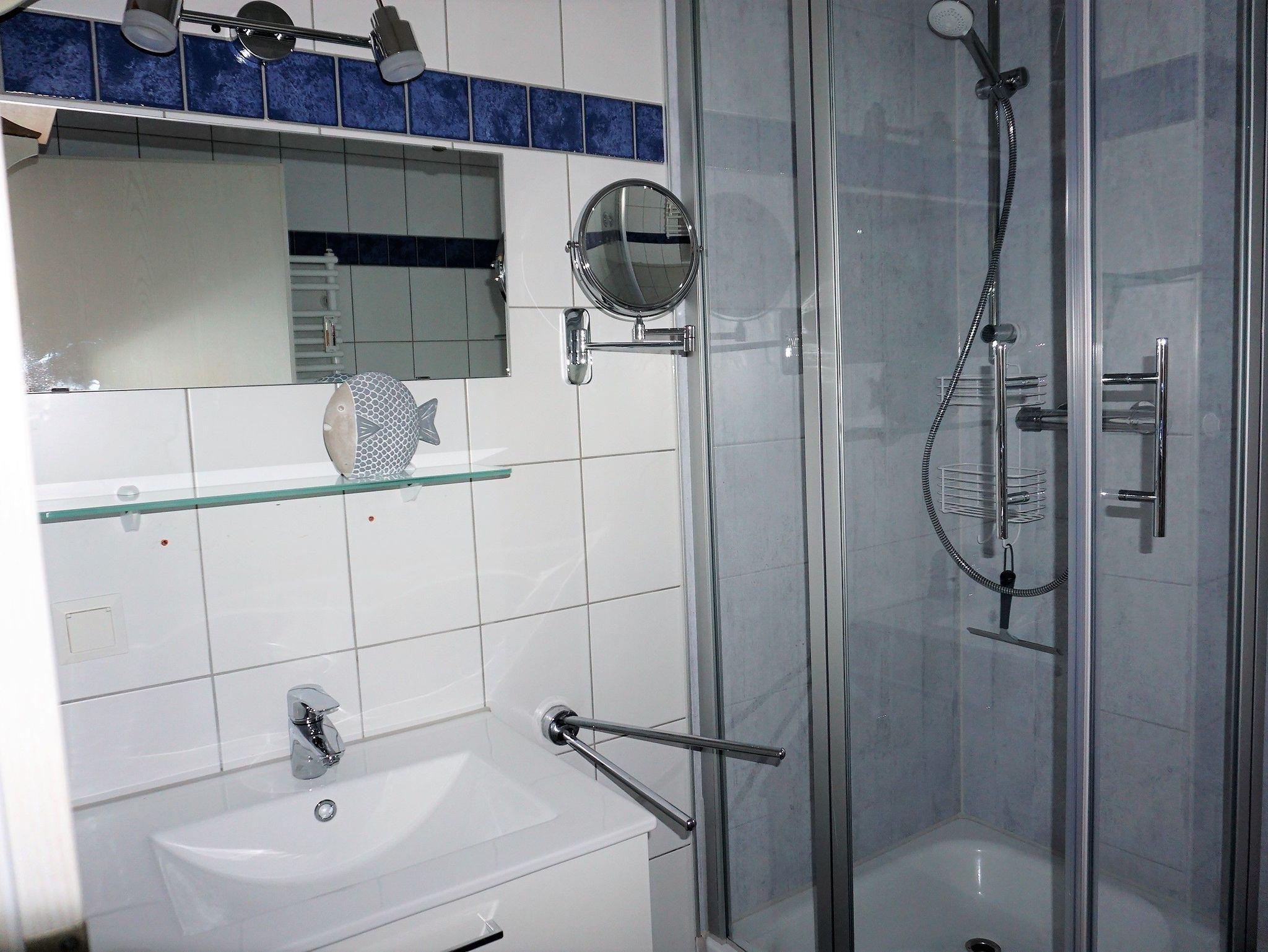 Das helle Badezimmer (ebenfalls renoviert) mit Dusche und WC begrüßt sie am Morgen mit angewärmten Handtüchern.