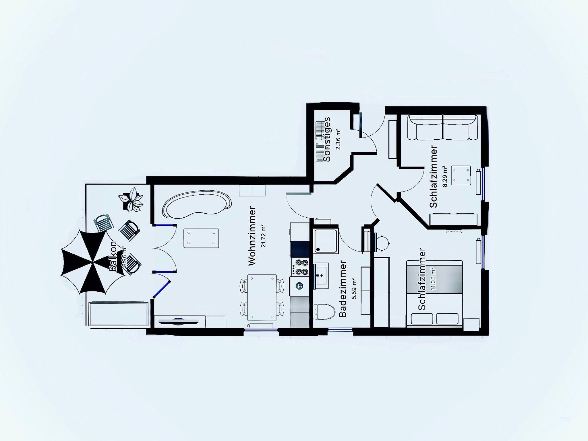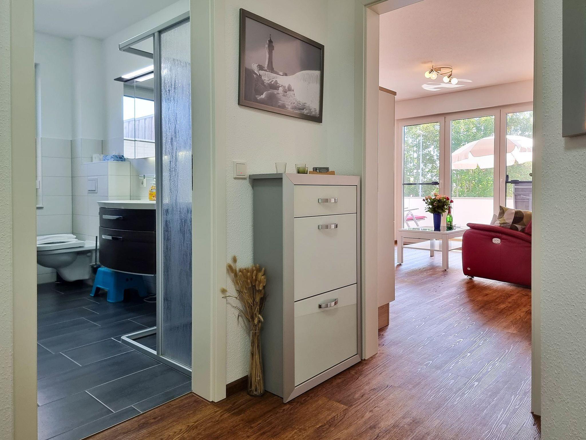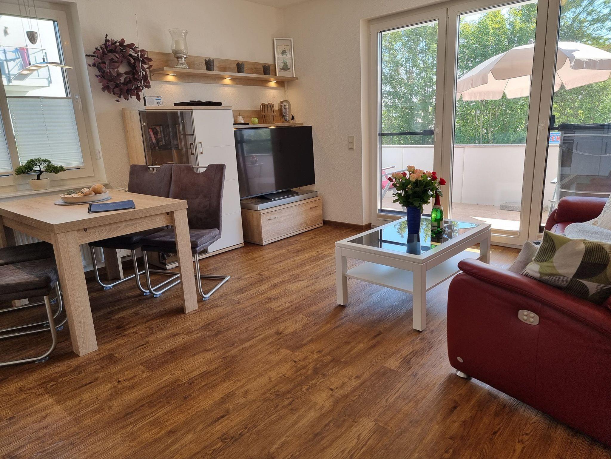 Moderne, behagliche Möbel im Wohn- und Essbereich, komfortabel ausgestattete Küchenzeile, Bad mit Dusche und ebenerdigem Einstieg, Schlafzimmer mit Doppelbett, zweites Schlafzimmer mit Schlafcouch 1,40 m breit, Vinylboden in Holzoptik und ein nach Süden ausgerichteter Balkon.