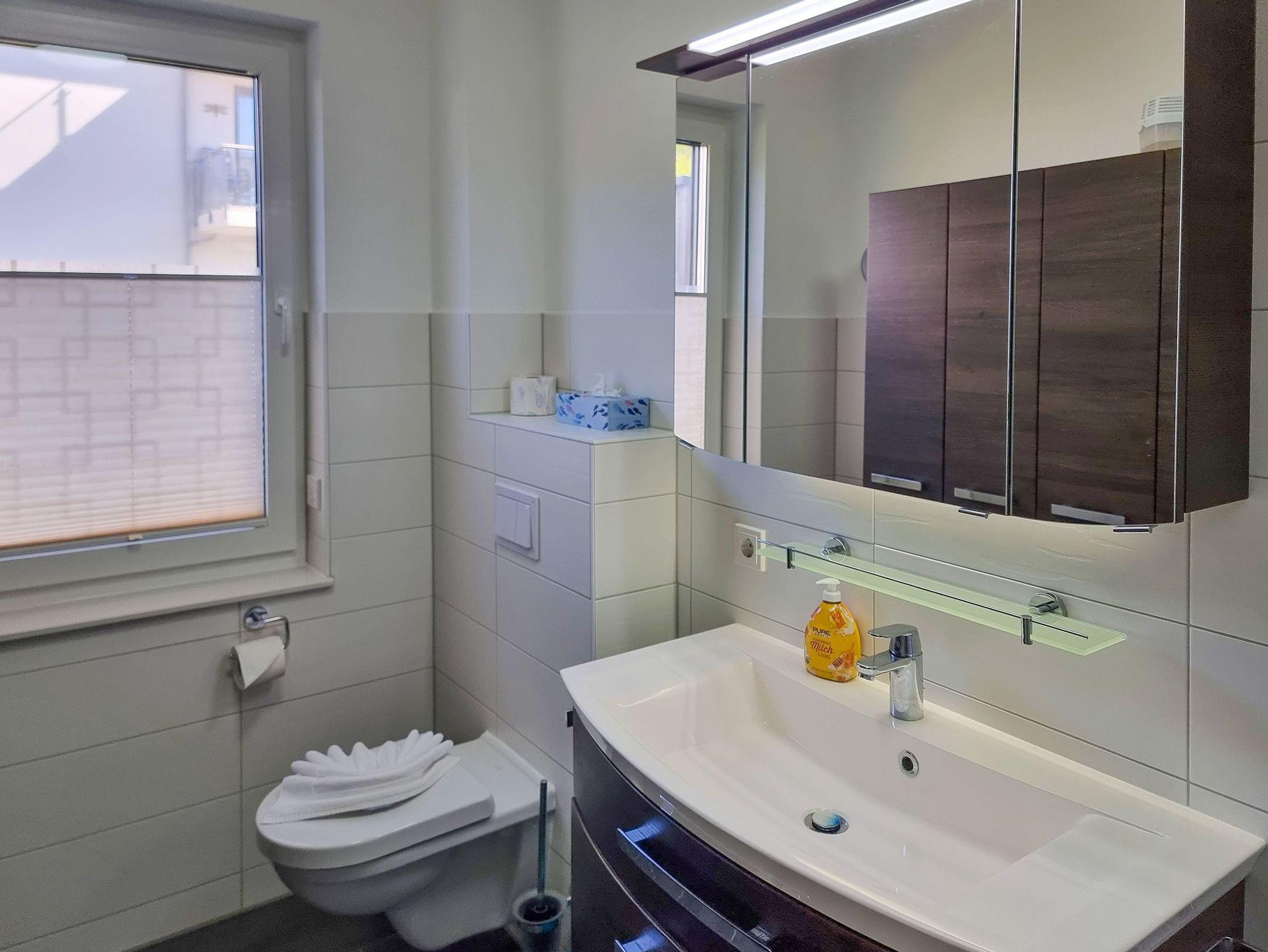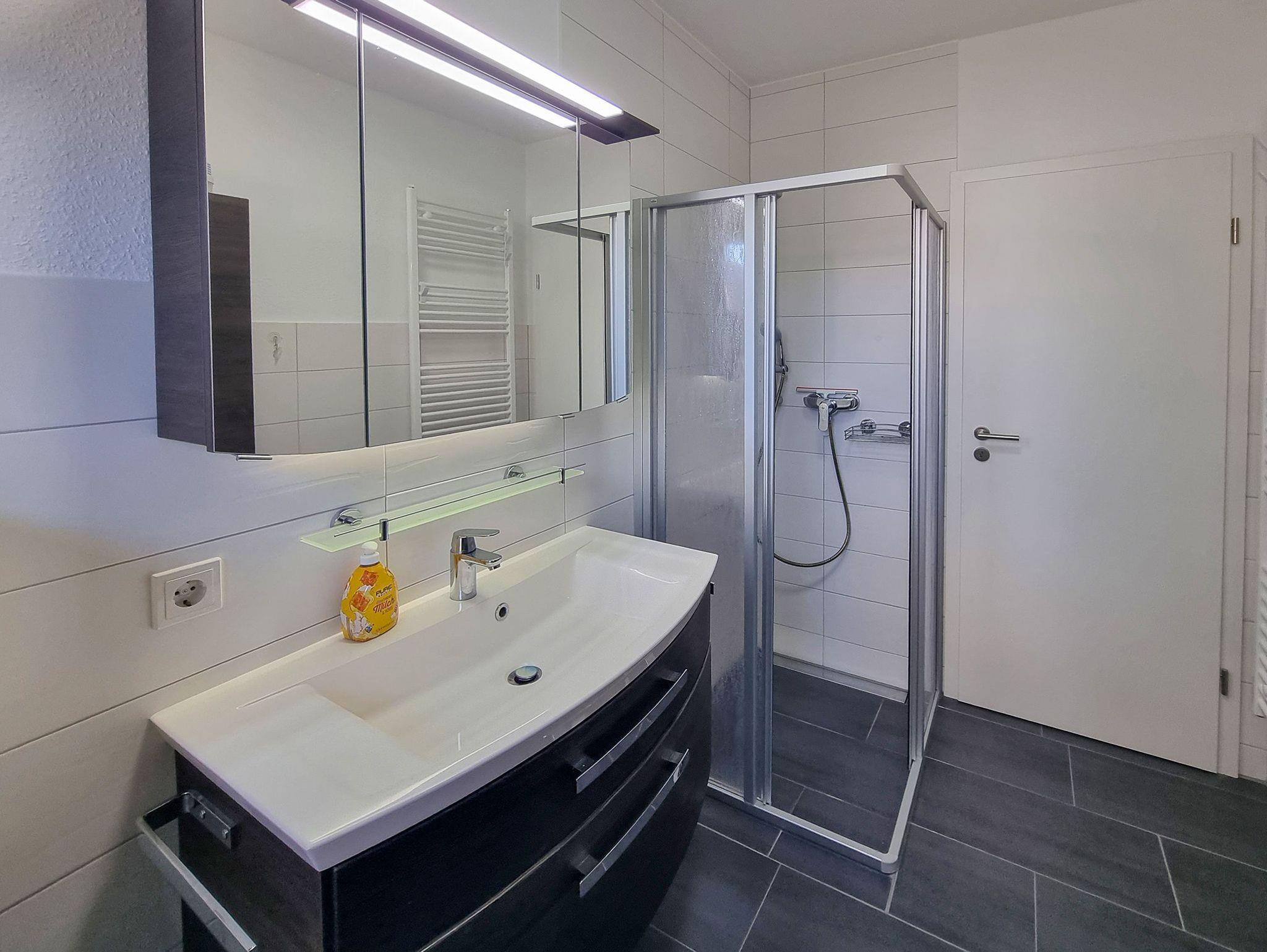 Das Badezimmer ist mit Dusche, WC und Fön ausgestattet.