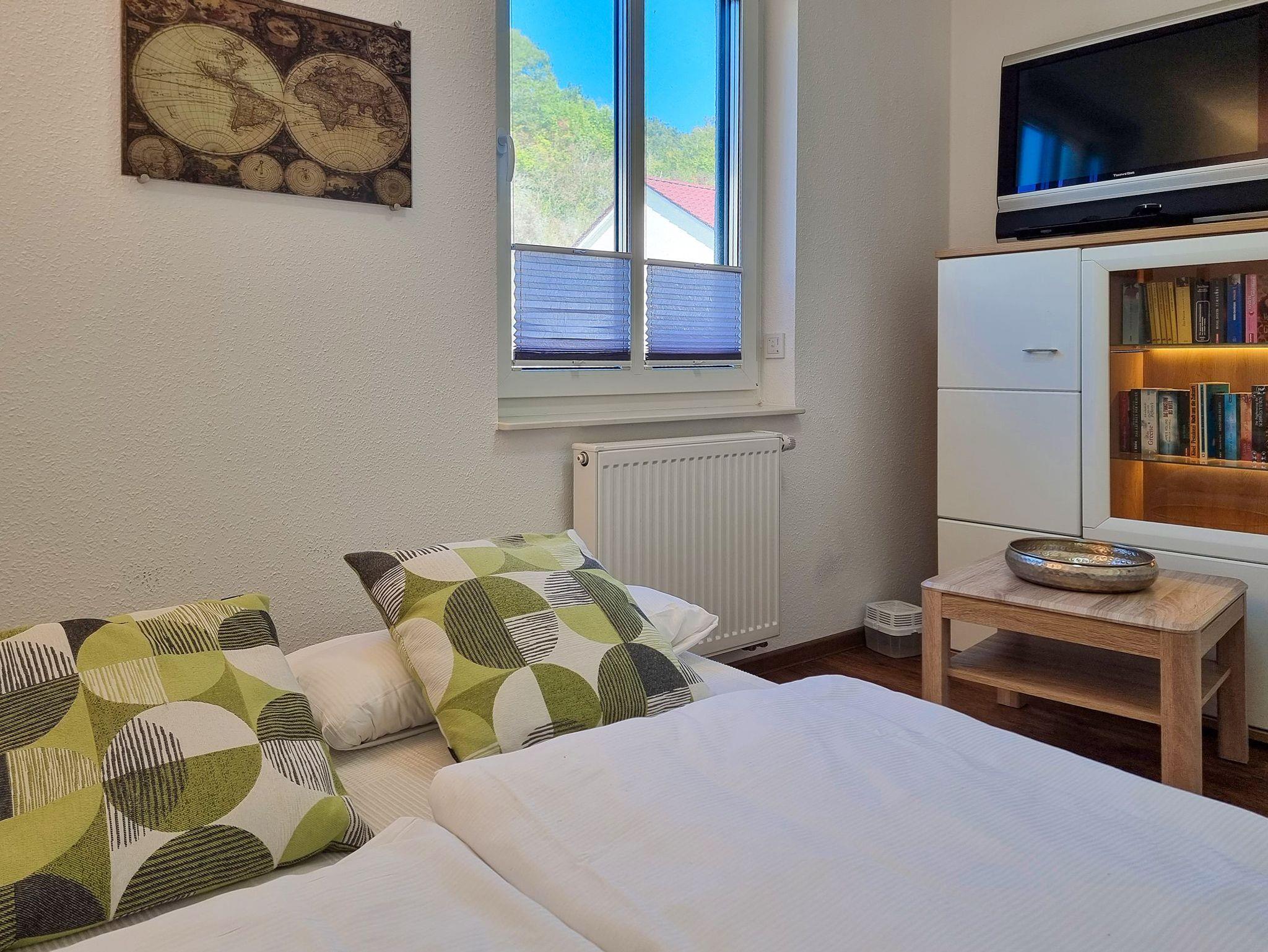 2 Schlafzimmer mit Doppelbett (1,60m breit) bzw Schlafsofa (1,40m breit). Das kleinere Schlafzimmer bietet einen weiteren Flachbild-TV und ein Bluerayplayer.