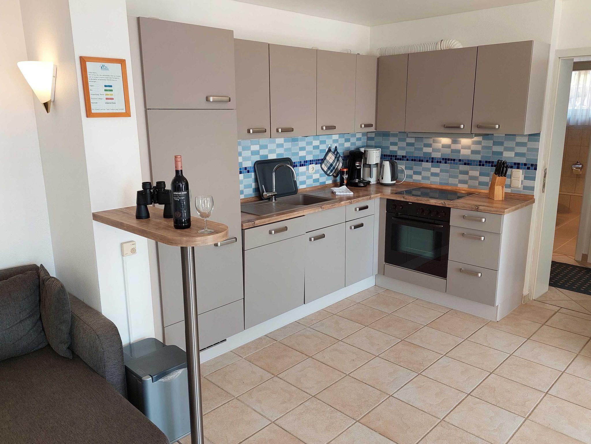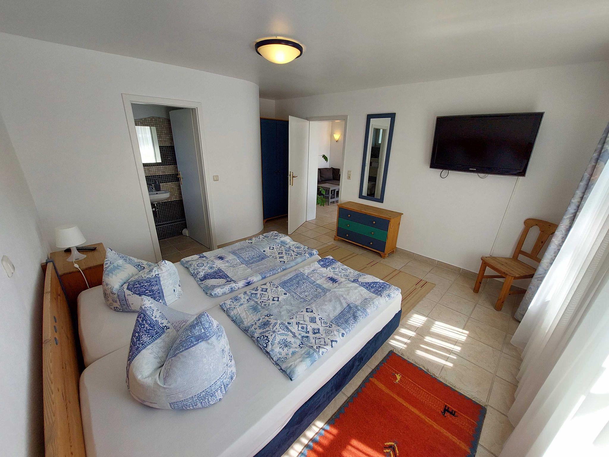 Unser EG-Appartement verfügt über einen grossen Wohnbereich mit einer komplett augestatteten Einbauküche wie .z.B. 4-Platten-Cerankochfeld, Toaster, Eierkocher, Wasserkocher, Kaffeepadmaschine, Kaffeefiltermaschine, Geschirrspülmaschine, ausreichend Geschirr und Besteck, Salz, Pfeffer und Zucker, Kaffeefiltertüten, Geschirrtuch u.v.m., zwei Schlafzimmer mit jeweils 2 Doppelbetten ( 1,80x2,00m) und je zwei Nachtschränkchen, einem Kleiderschrank und einer Wäschekommode. Ausserdem sind zwei Bäder mit Dusche und WC
