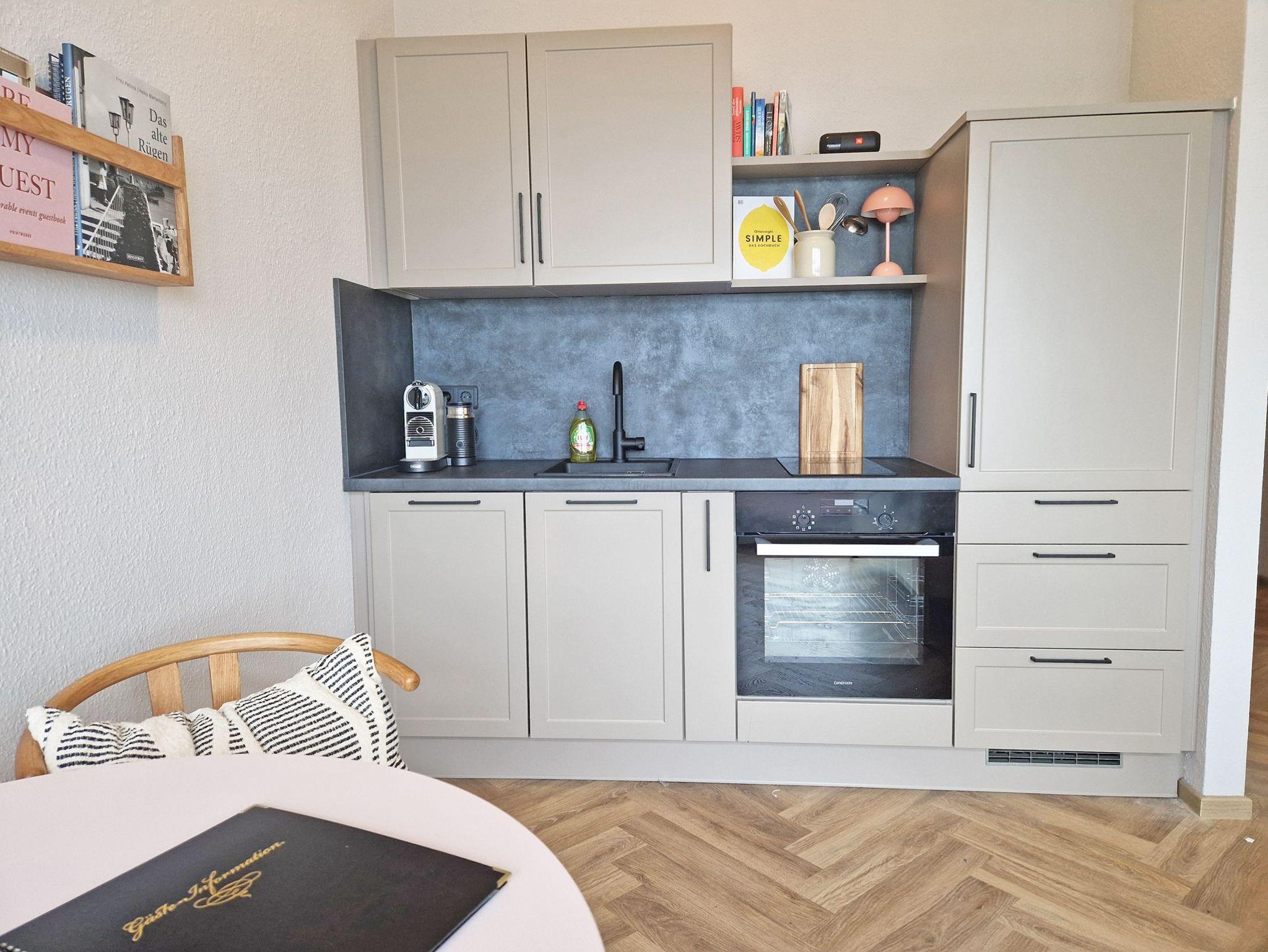 ? Einbauküche mit 2-Platten-Ceranherd, Kühlschrank, Nespresso-Kaffeemaschine, Geschirrspülmaschine, Toaster und Wasserkocher.
