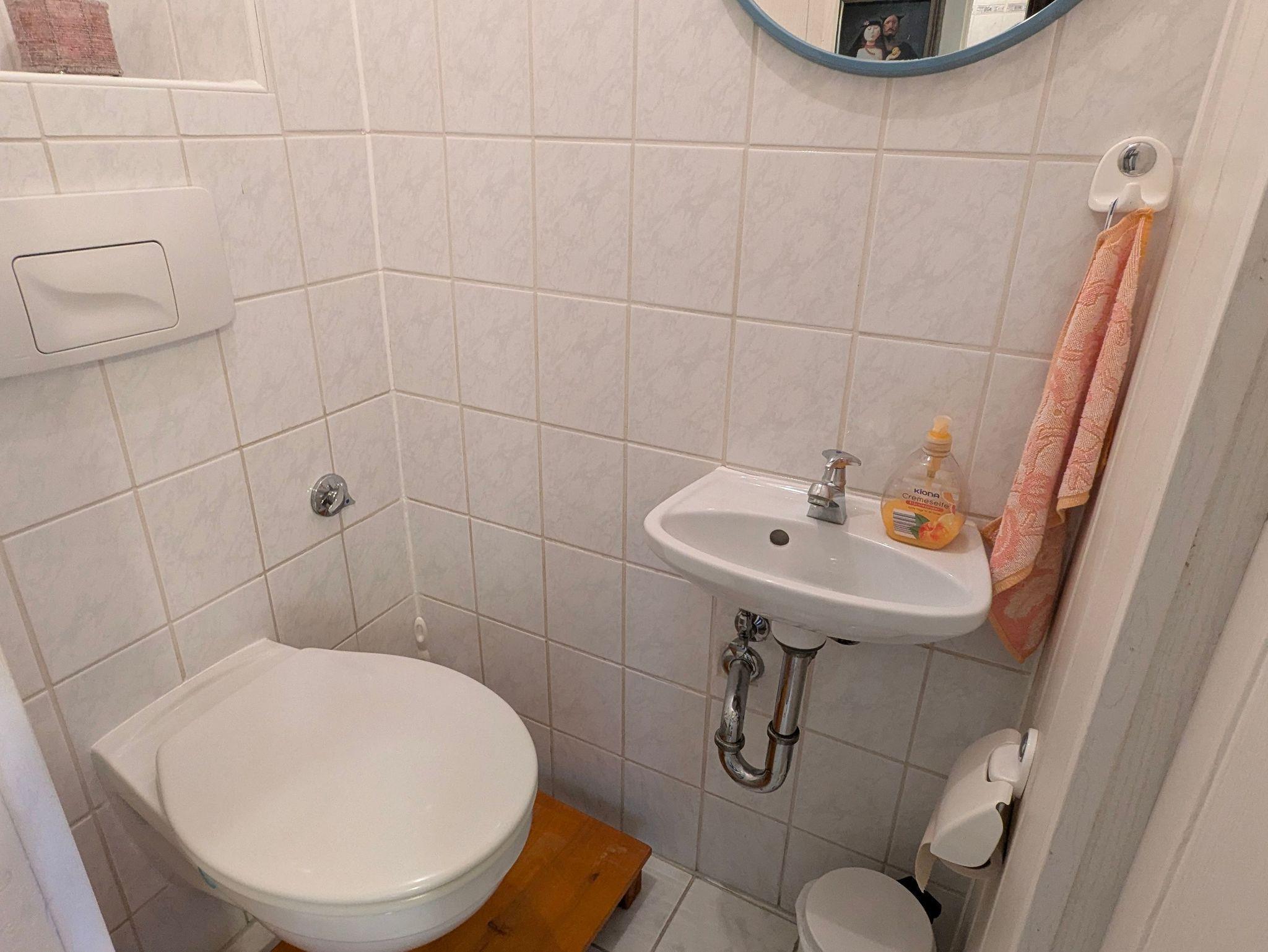 • Das Bad ist mit Dusche und Waschtisch ausgestattet. Das separate WC befindet sich über den Flur im Treppenhaus.