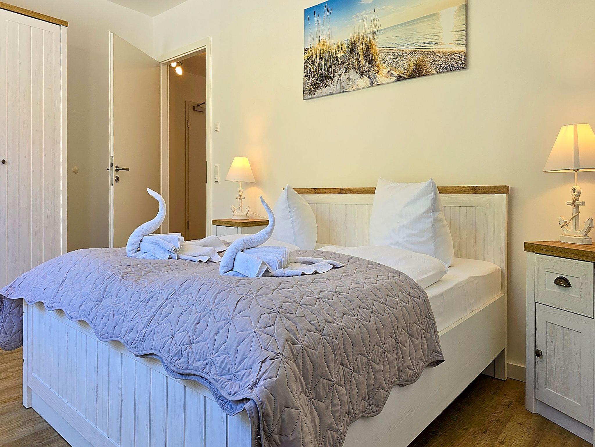 Der großzügige Wohnbereich verfügt über ein gemütliches (ausziehbares) Schlafsofa, einem LG HD Smart TV und einem großzügigen Essbereich. Kostenfreies WLAN steht Ihnen natürlich auch zur Verfügung. Für gemütliche Abende liegt eine Auswahl an Gesellschaftsspielen und Büchern bereit. Die Küche ist komfortabel mit einem Mikrowellenbackofen, Induktionsherd und einer Geschirrspülmaschine ausgestattet. Das Badezimmer ist mit einer bodengleichen 1,40m x 1,40m großen Dusche mit schwenkbaren Faltwänden individuell nutzbar. Die Wohnung ist hell und offen eingerichtet und verfügt über eine Terrasse mit Gartenmöbeln. Das Feriendomizil ist rollstuhlgeeignet und befindet sich im Erdgeschoss. Die komplette Wohnung ist mit einer Fußbodenheizung ausgestattet. Das Schlafzimmer verfügt über ein großes Doppelbett, Nachtschränkchen und je einer Leselampe, sowie ein großer Kleiderschrank.