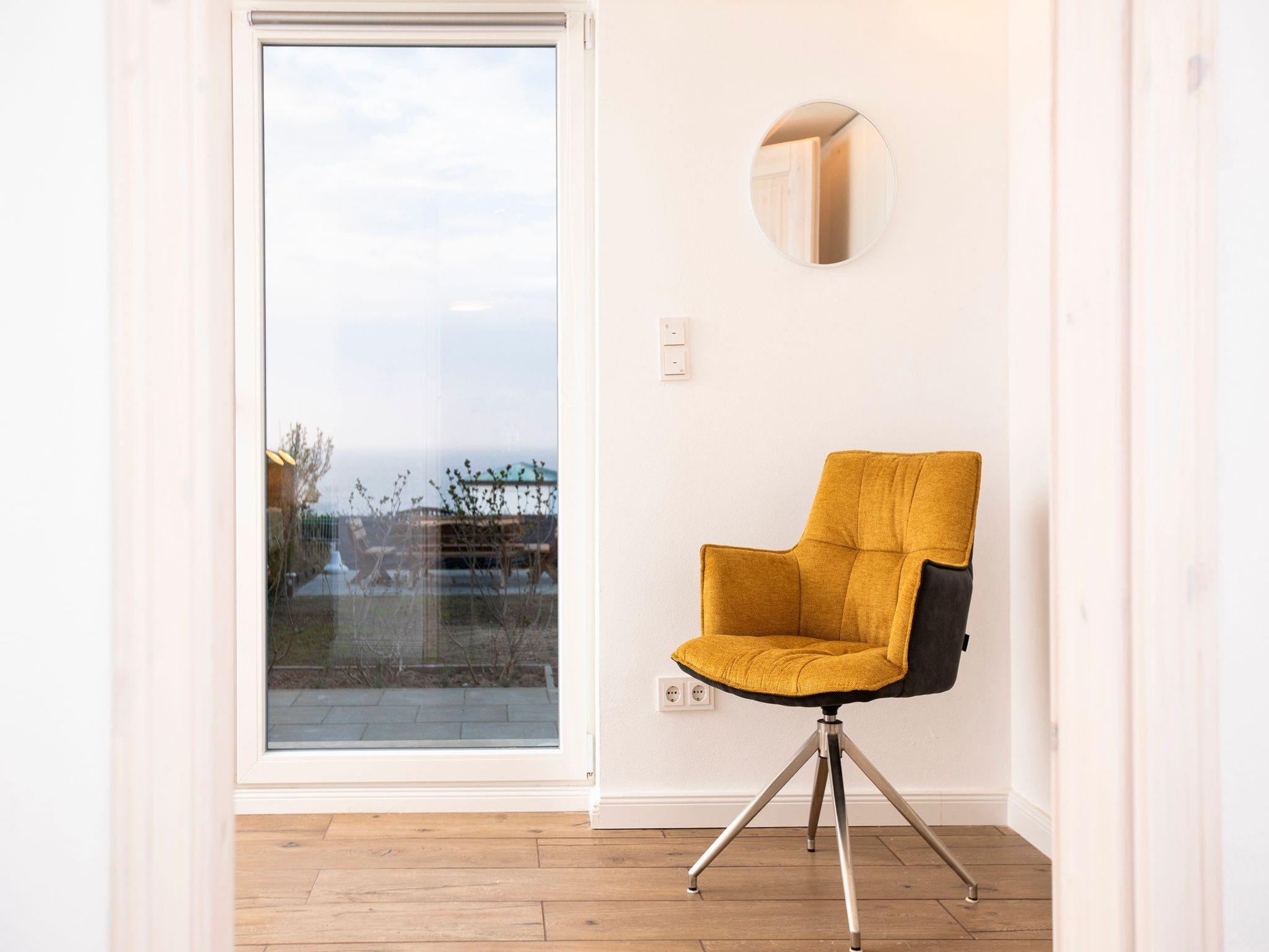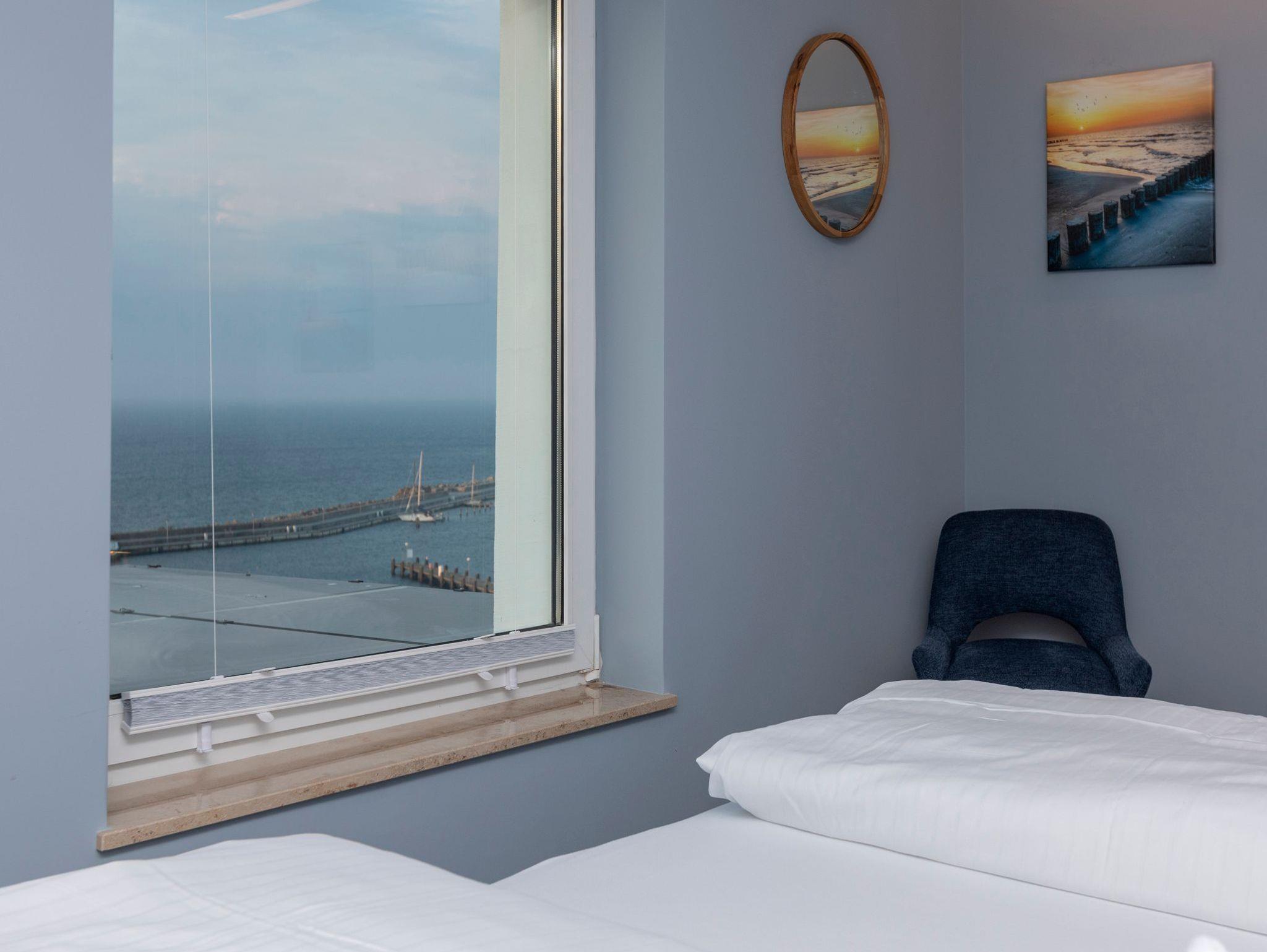 • Schlafzimmer Nr. 4 mit einem Doppelbett (2m x 2m), verstellbaren Lattenrosten, großem Wandschrank, Flachbild-TV, Stuhl und Beistelltisch. Platz für ein Kinderbett. Direkter Meerblick