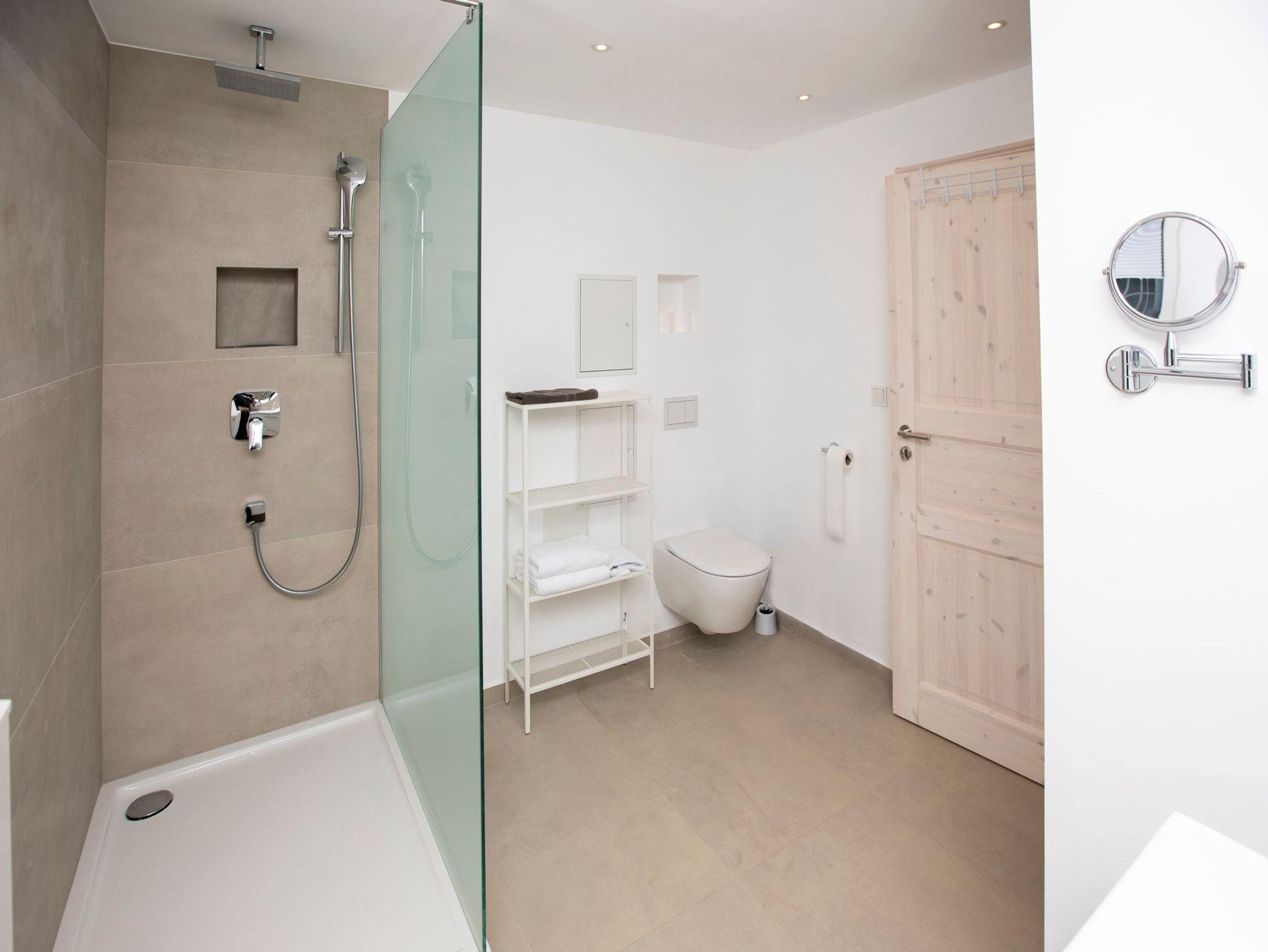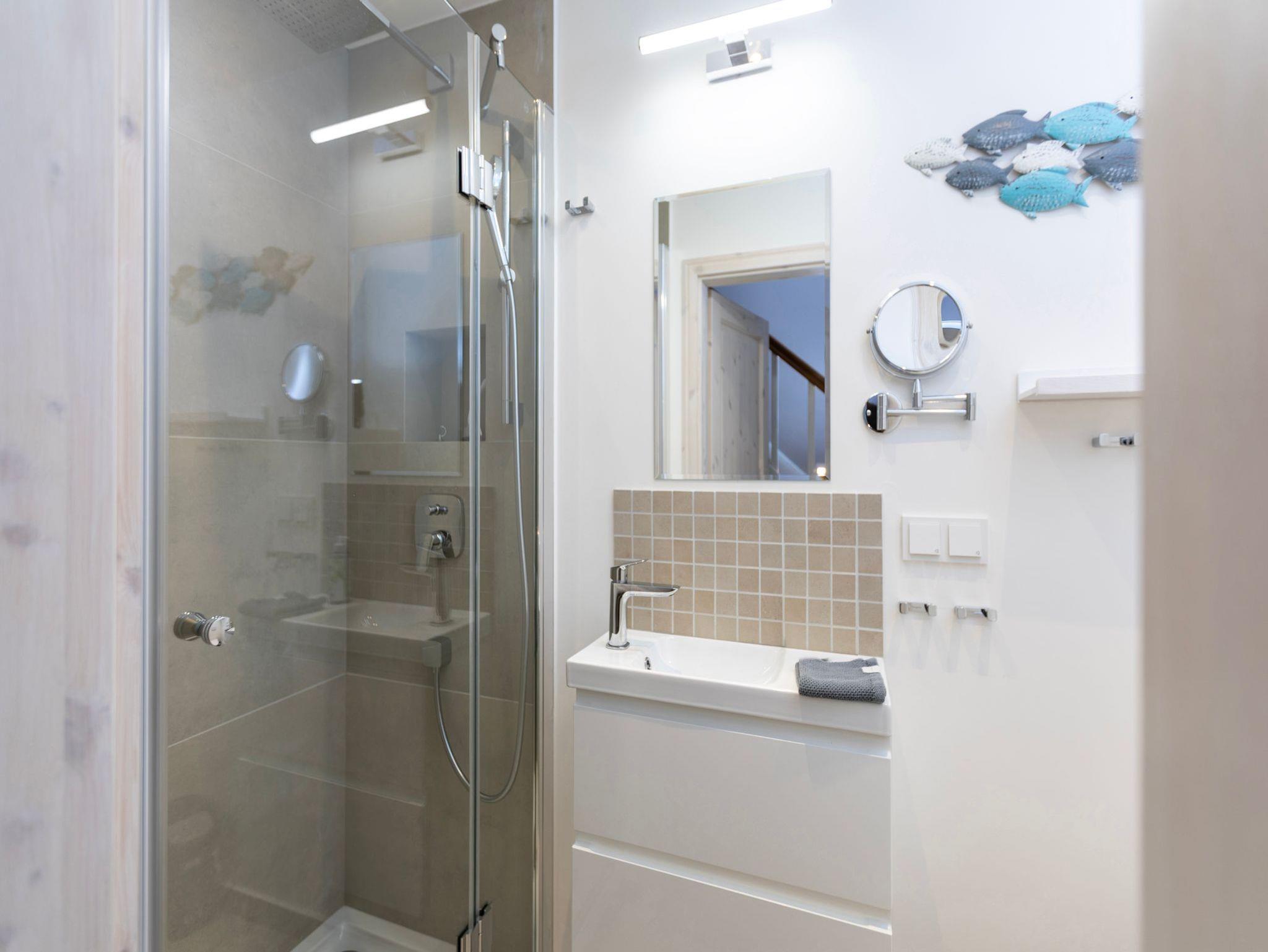 • Badezimmer mit Dusche, Waschbecken, WC, Kosmetikspiegel und Föhn