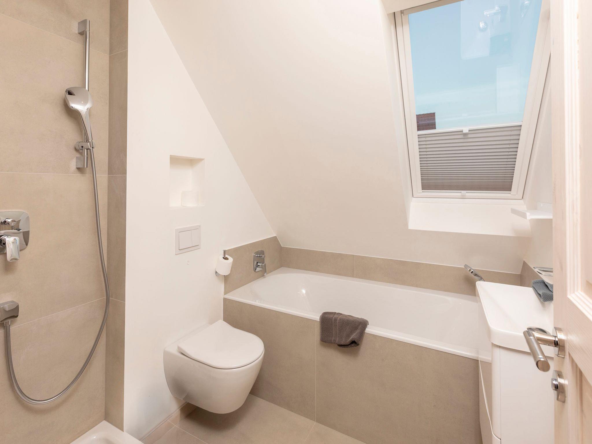 • Badezimmer mit Badewanne, Dusche, Waschbecken, WC und Handtuchheizkörper, Kosmetikspiegel und Föhn