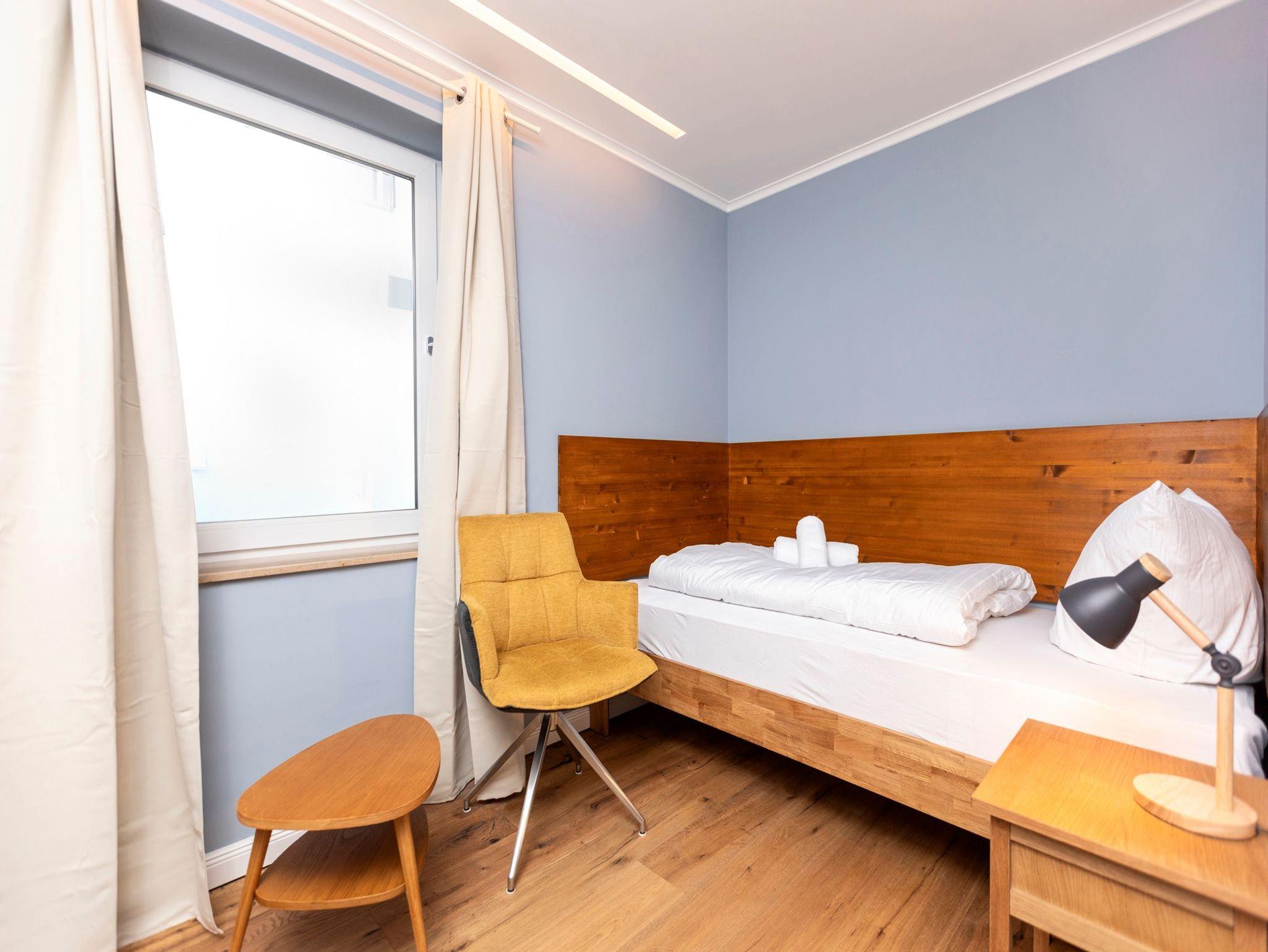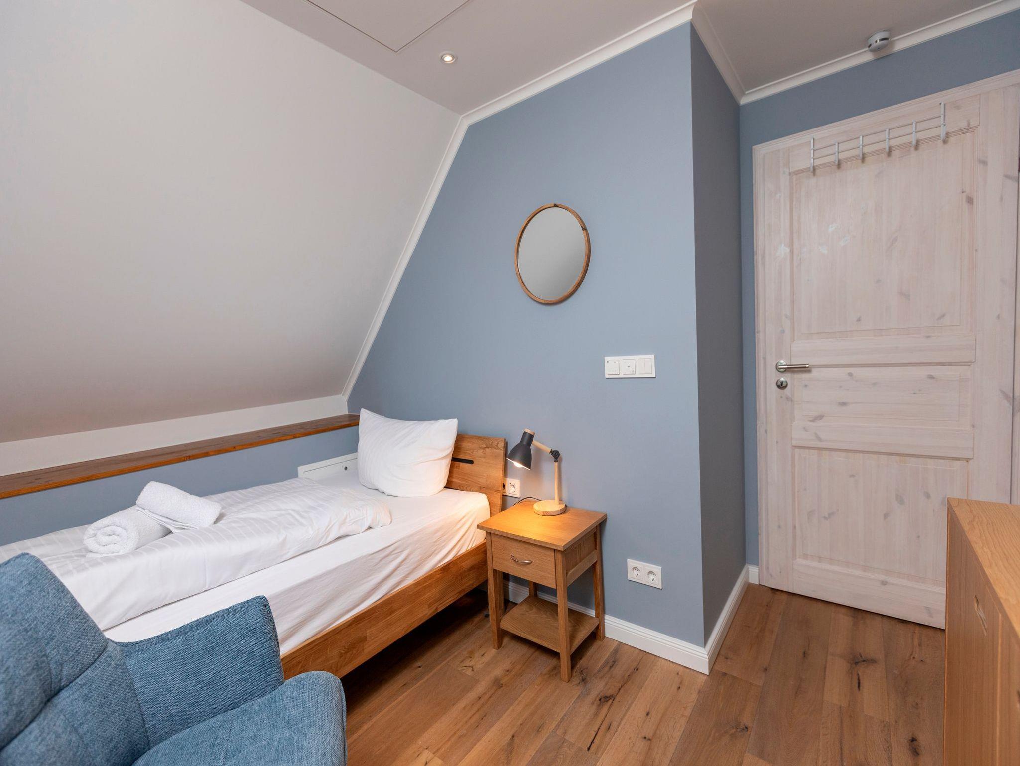 • Schlafzimmer Nr. 5 mit einem Einzelbett (2m x 1m), verstellbarem Lattenrost, Kommode, Stuhl und Beistelltisch. Seitlicher Meerblick