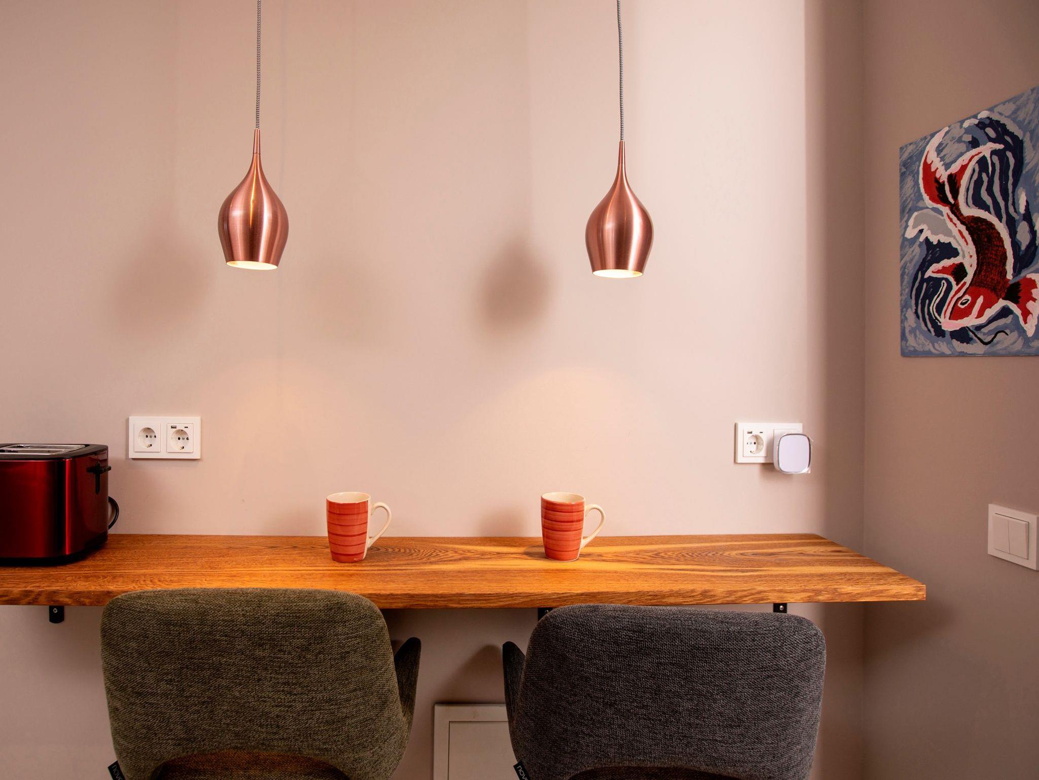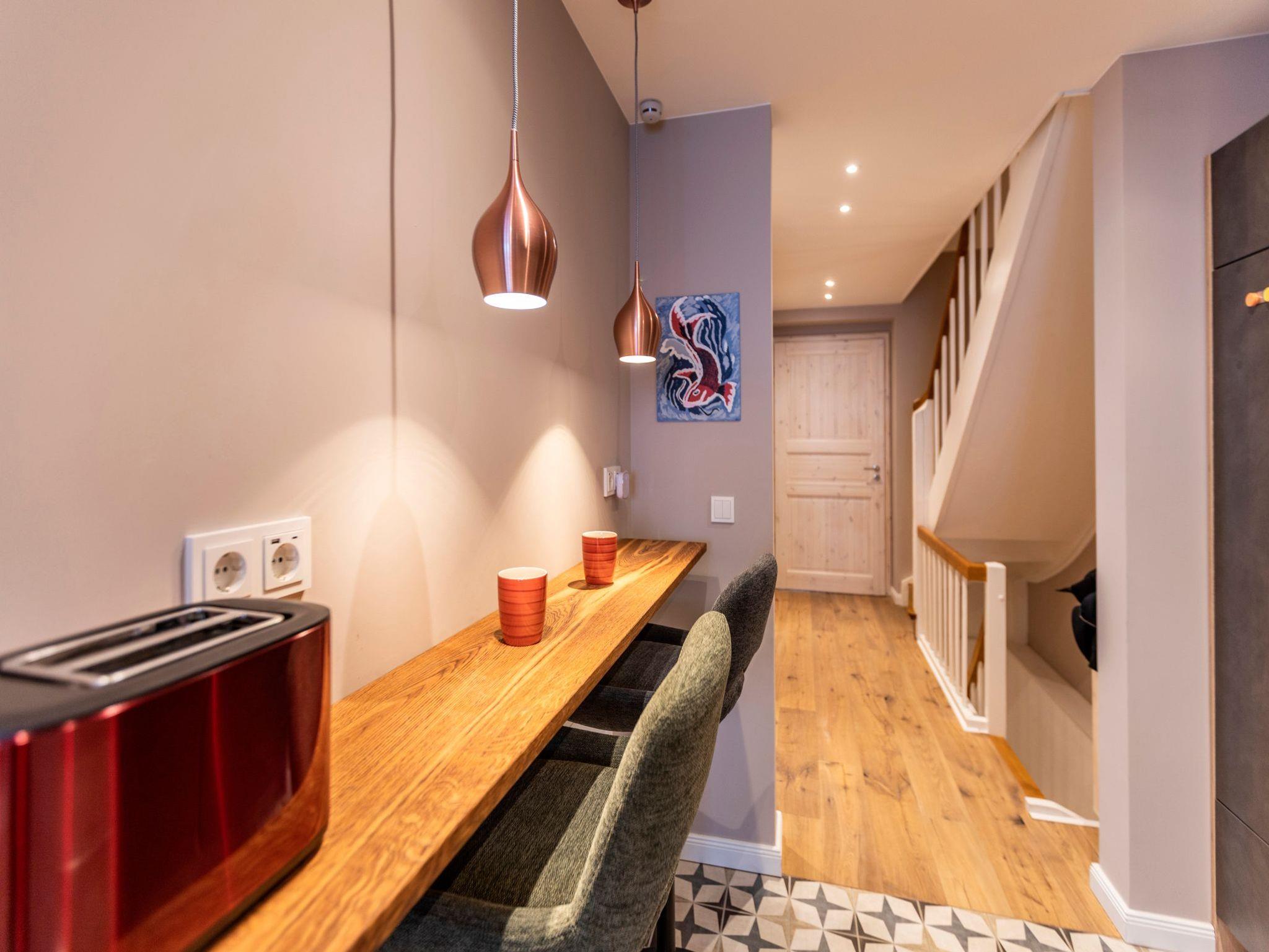 • Küche mit einem 4-Zonen-Kochfeld, Backofen, Mikrowelle, Geschirrspüler, Kühlschrank mit Gefrierfach, Pad-/Kapsel-Kaffeemaschine, Toaster, Wasserkocher und diversem Kleininventar. Ein Küchentresen mit drei Hockern