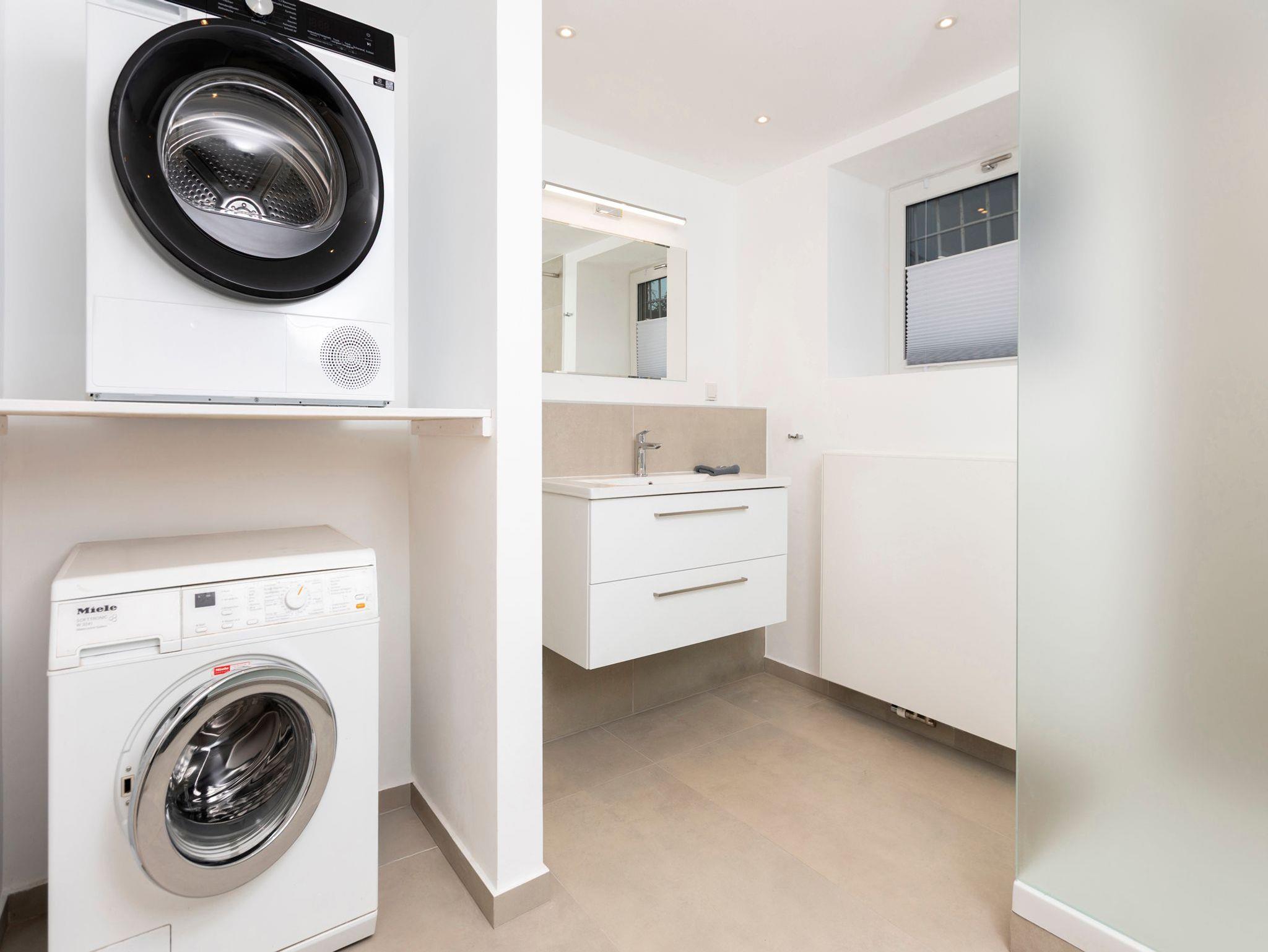• Badezimmer mit Dusche, Waschtisch, WC. Waschmaschine, elektrischem Wäschetrockner, Spiegel, Kosmetikspiegel und Föhn