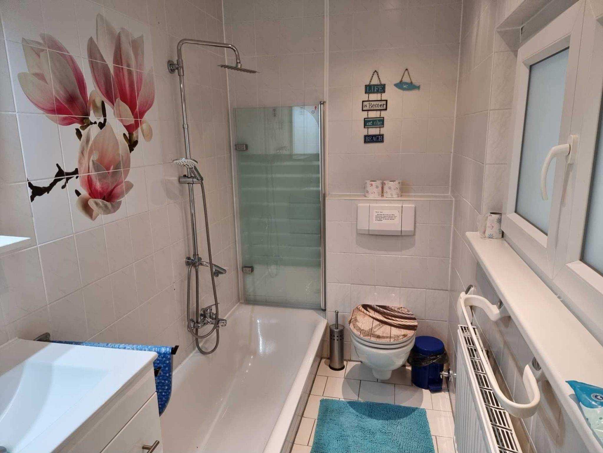 • Das Badezimmer besitzt eine Badewanne und eine Toilette.